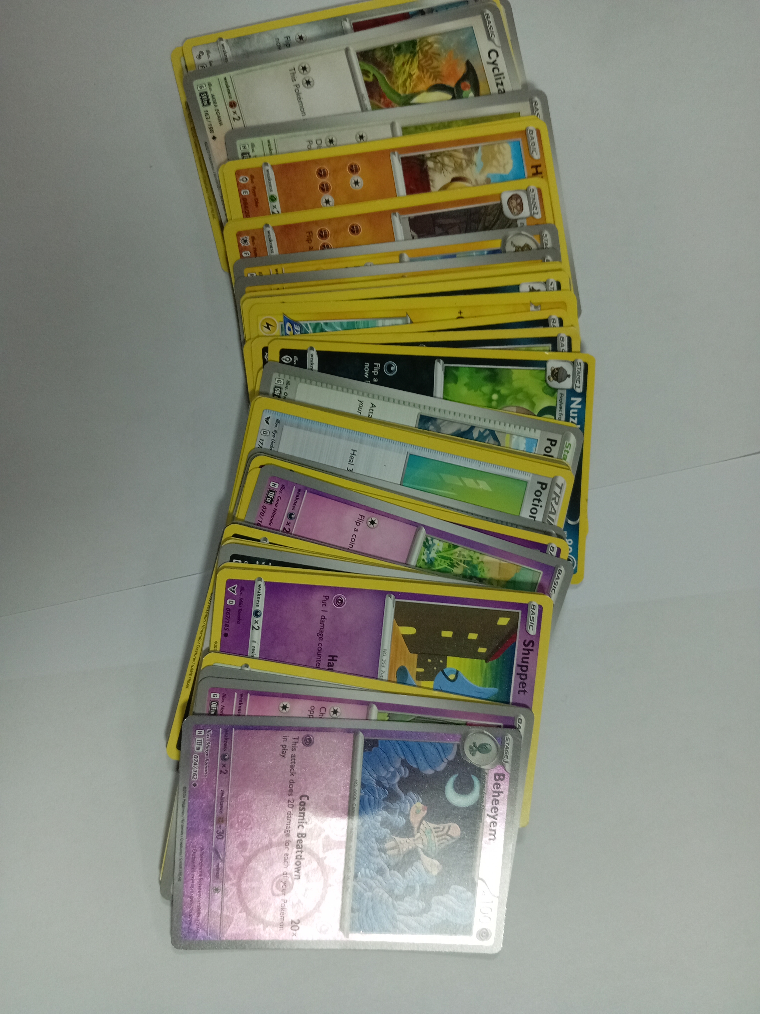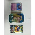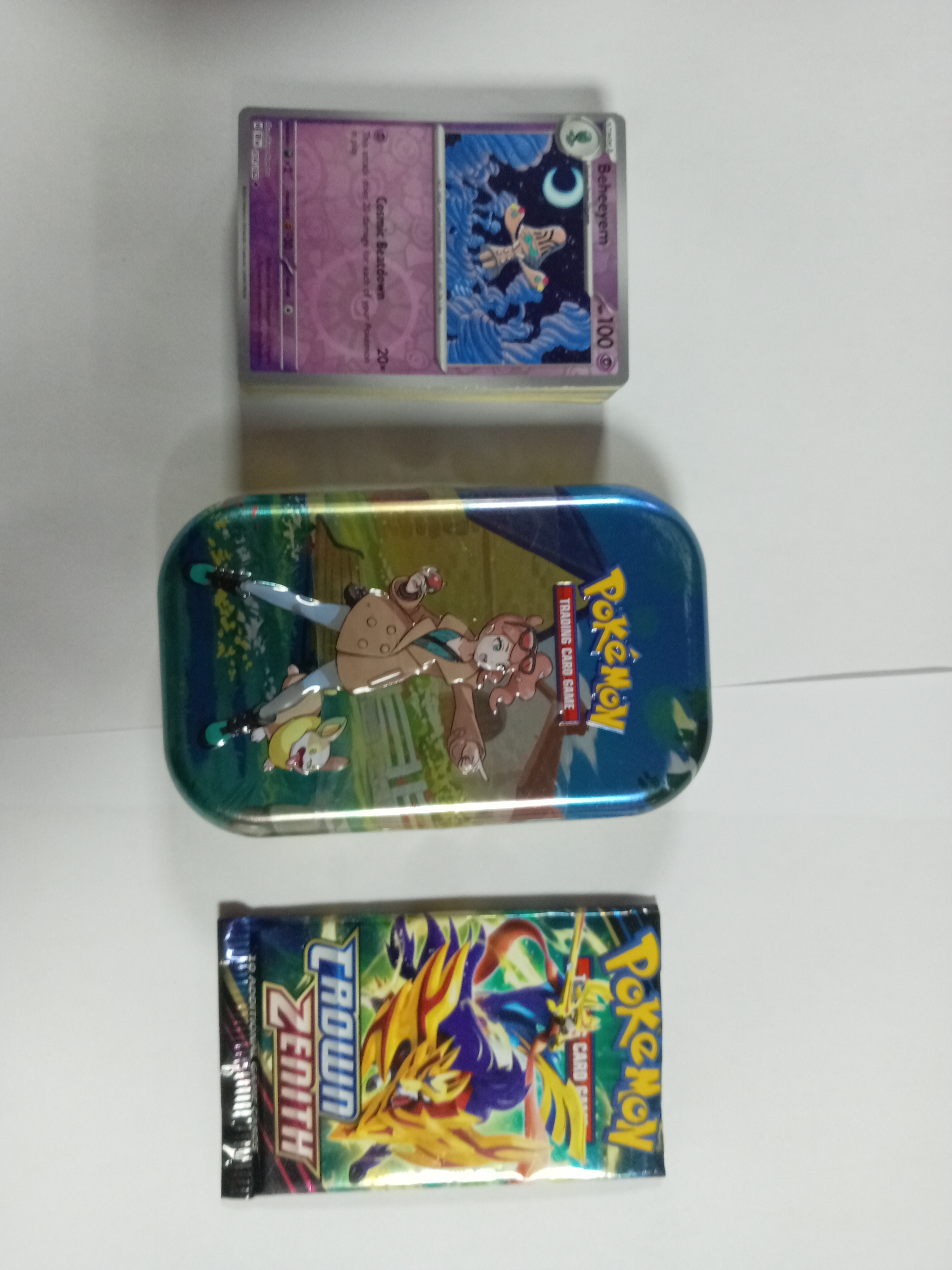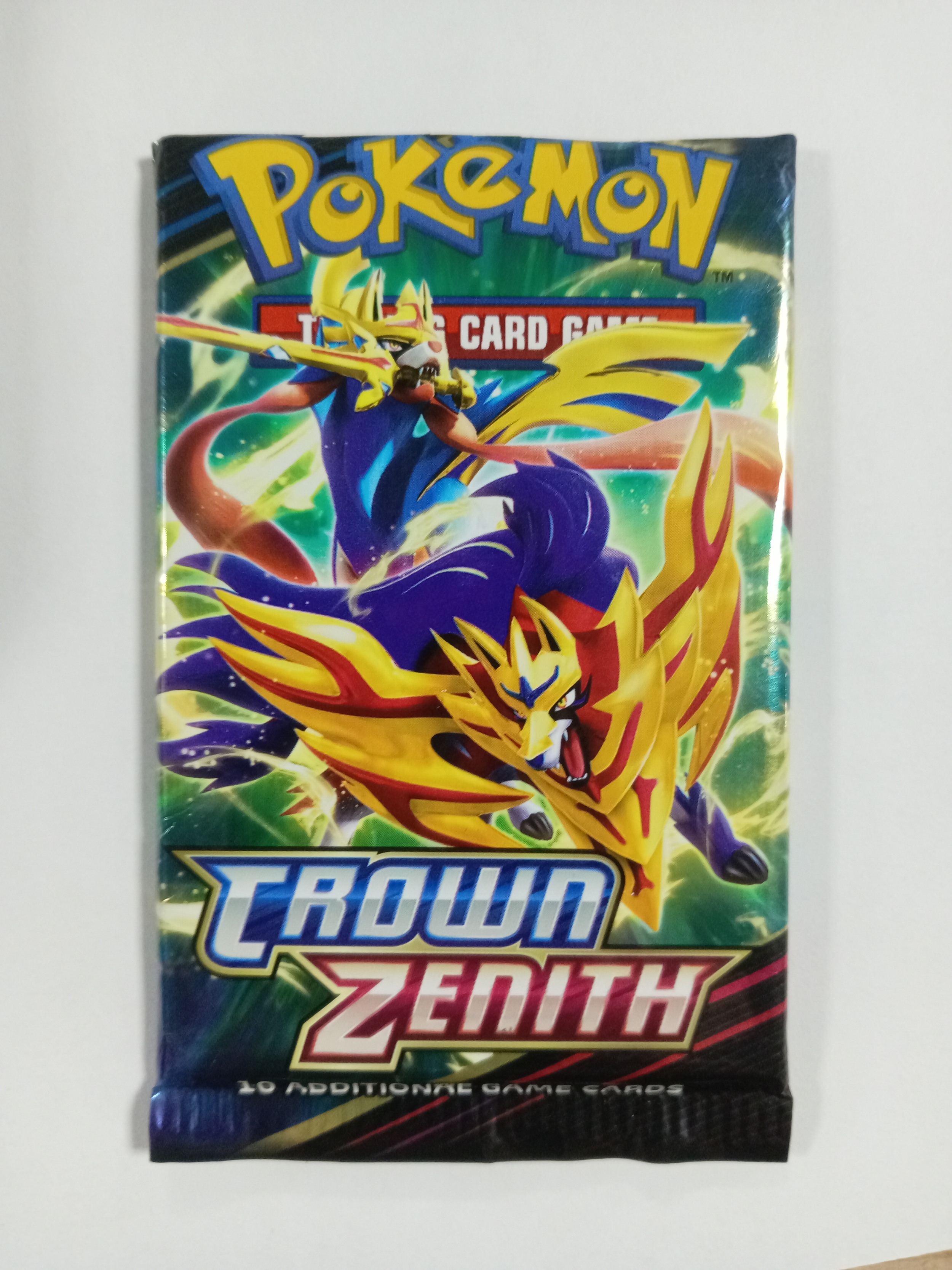 A collection of pokemon cards to include a crown zenith booster pack, a crown zenith tin and a stack of singles from various sets.