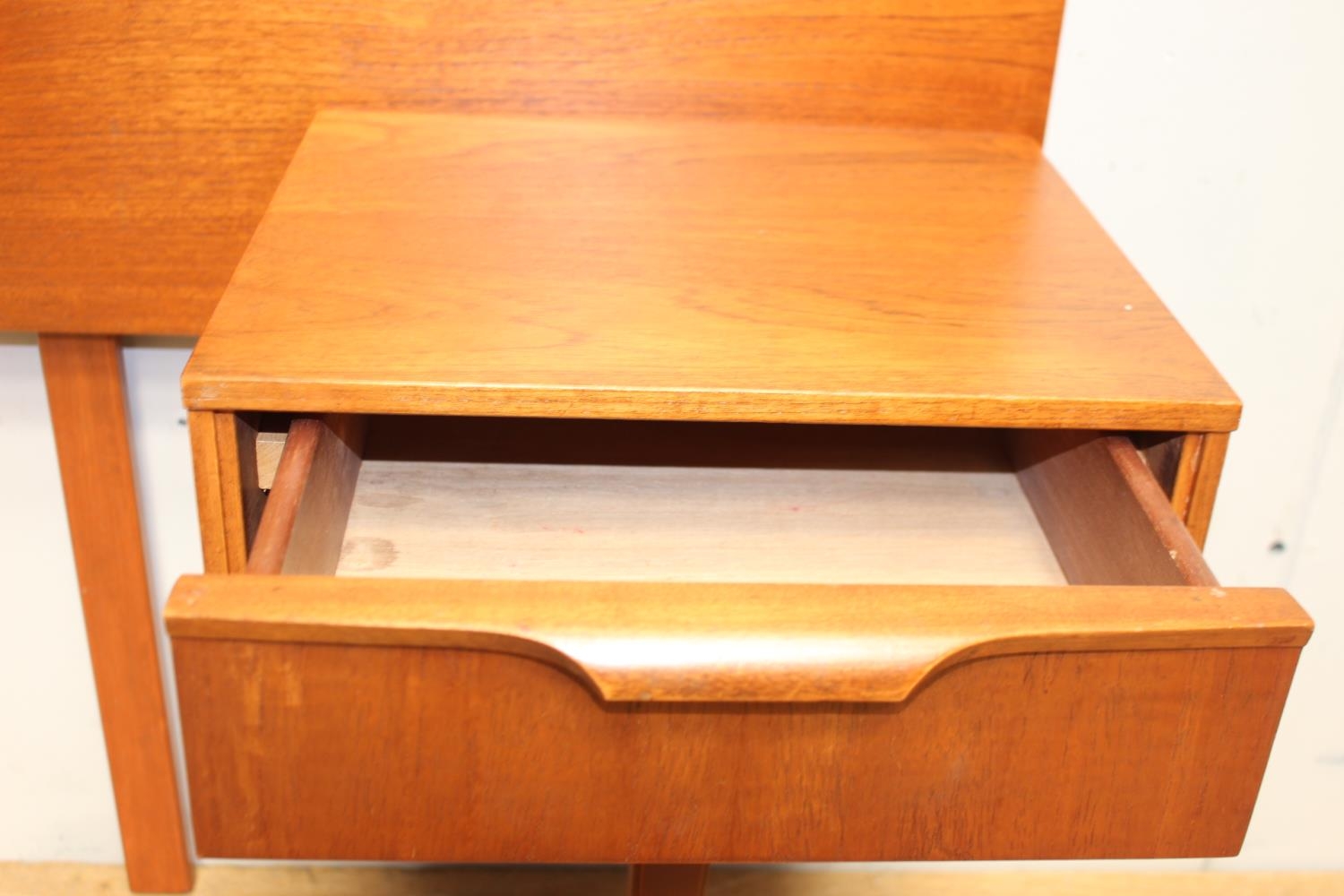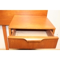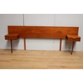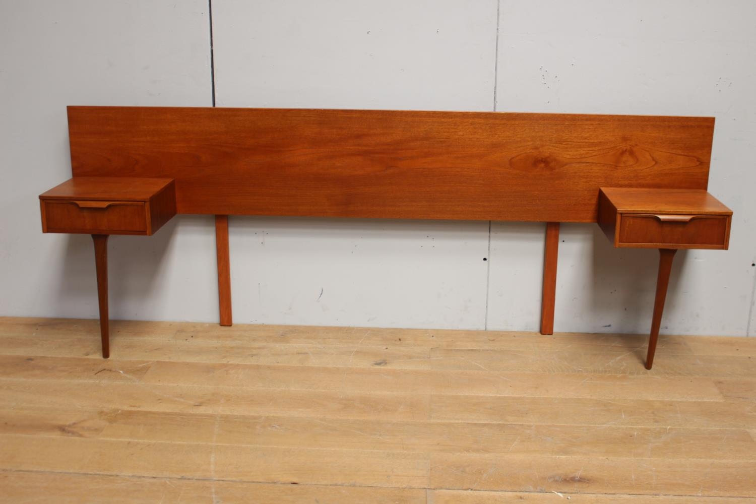 Retro teak bed head board flanked by two single drawers raised on single tapered supports { 84cm H X 229cm W X 37cm D, Width between drawers 151cm }.