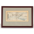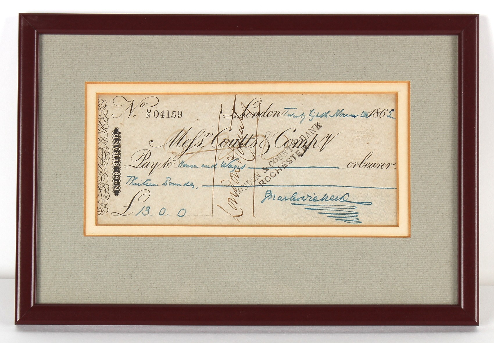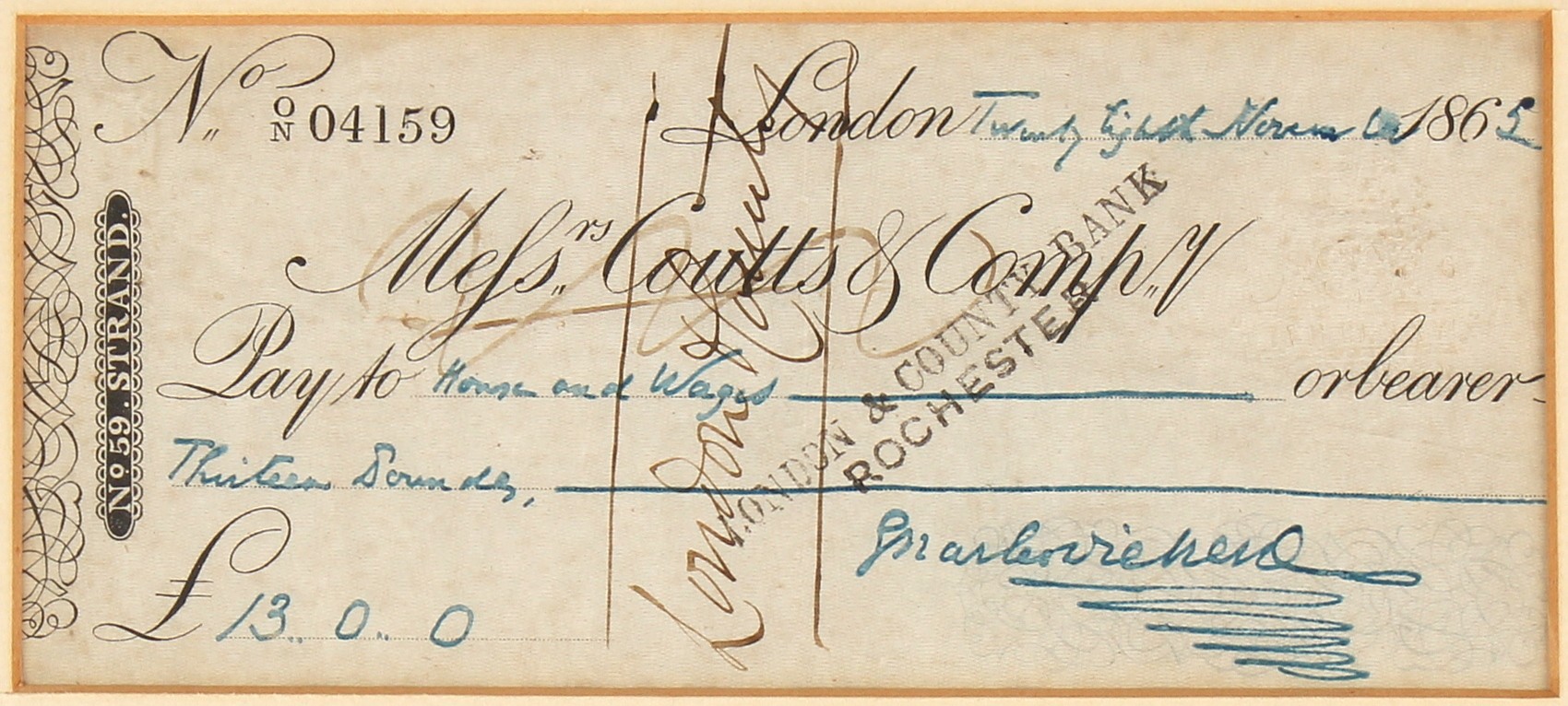 Property of a gentleman - DICKENS, Charles (1812-1870) - autograph - a signed cheque dated 28th November 1865 for thirteen pounds in favour of 'House and Wages' on a Messrs. Coutts & Compy. printed cheque, with blue ink manuscript notations and signature, in glazed frame, 7.3 by 10.8ins. (18.5 by 27.5cms.) (overall).