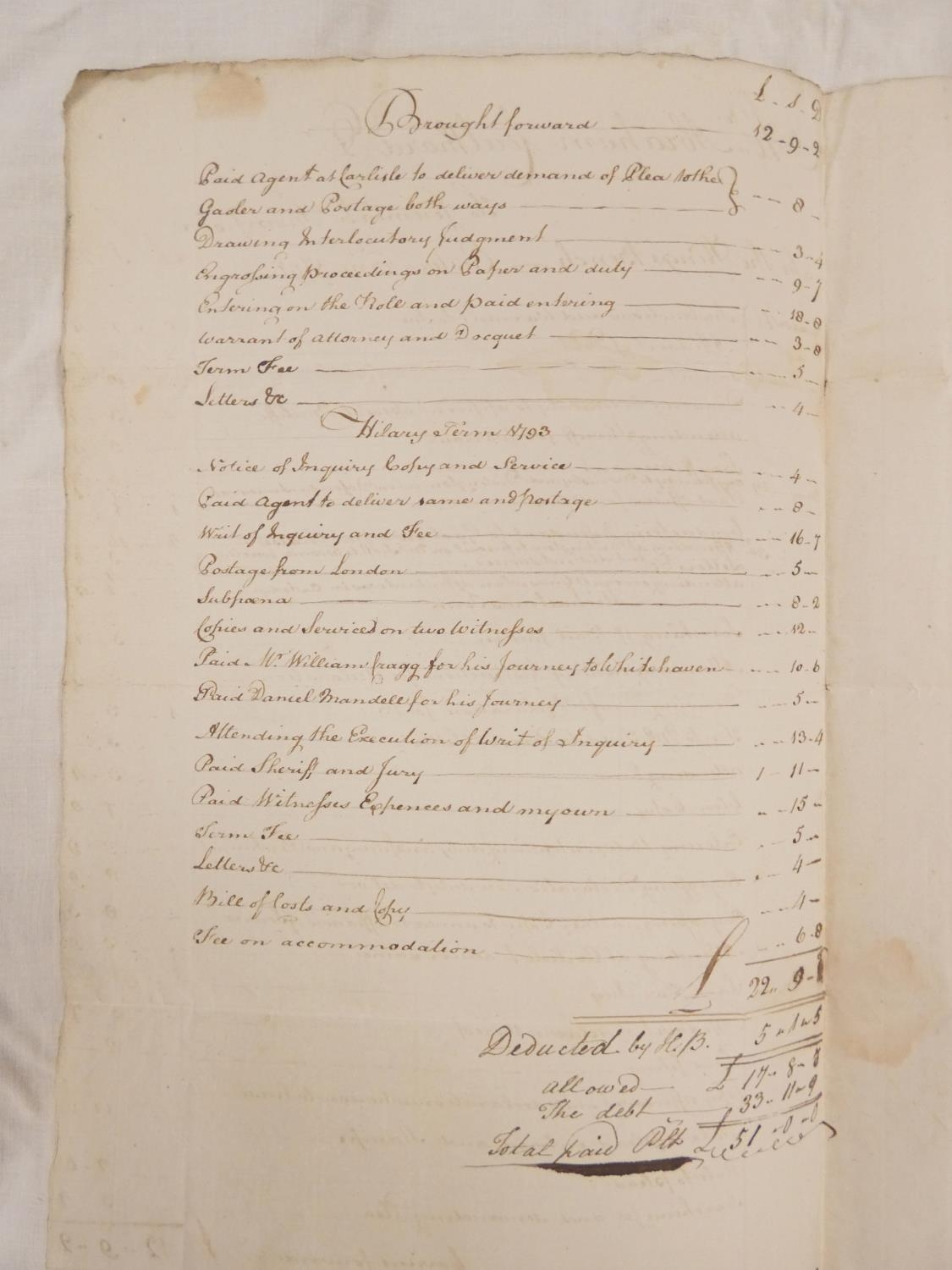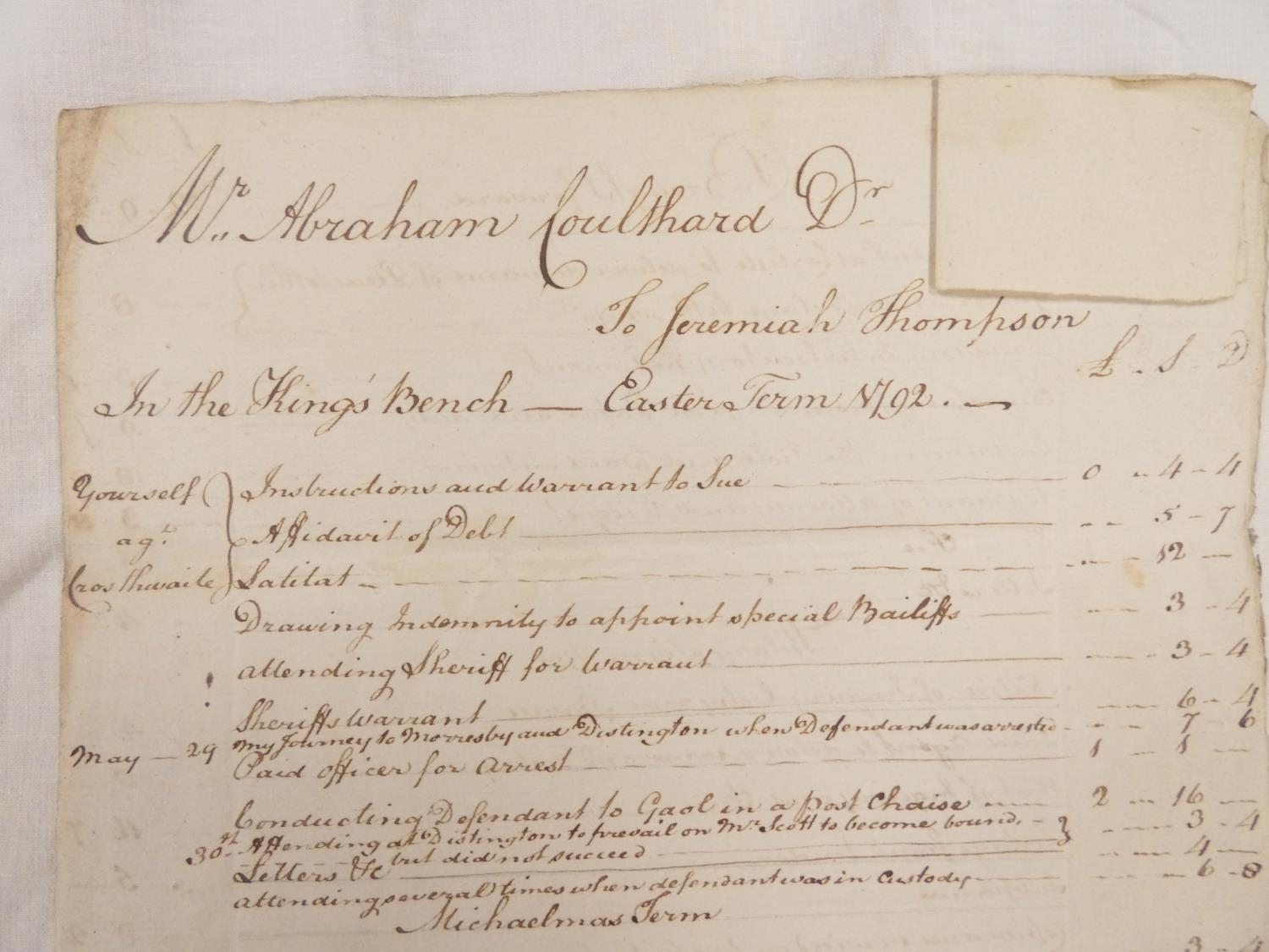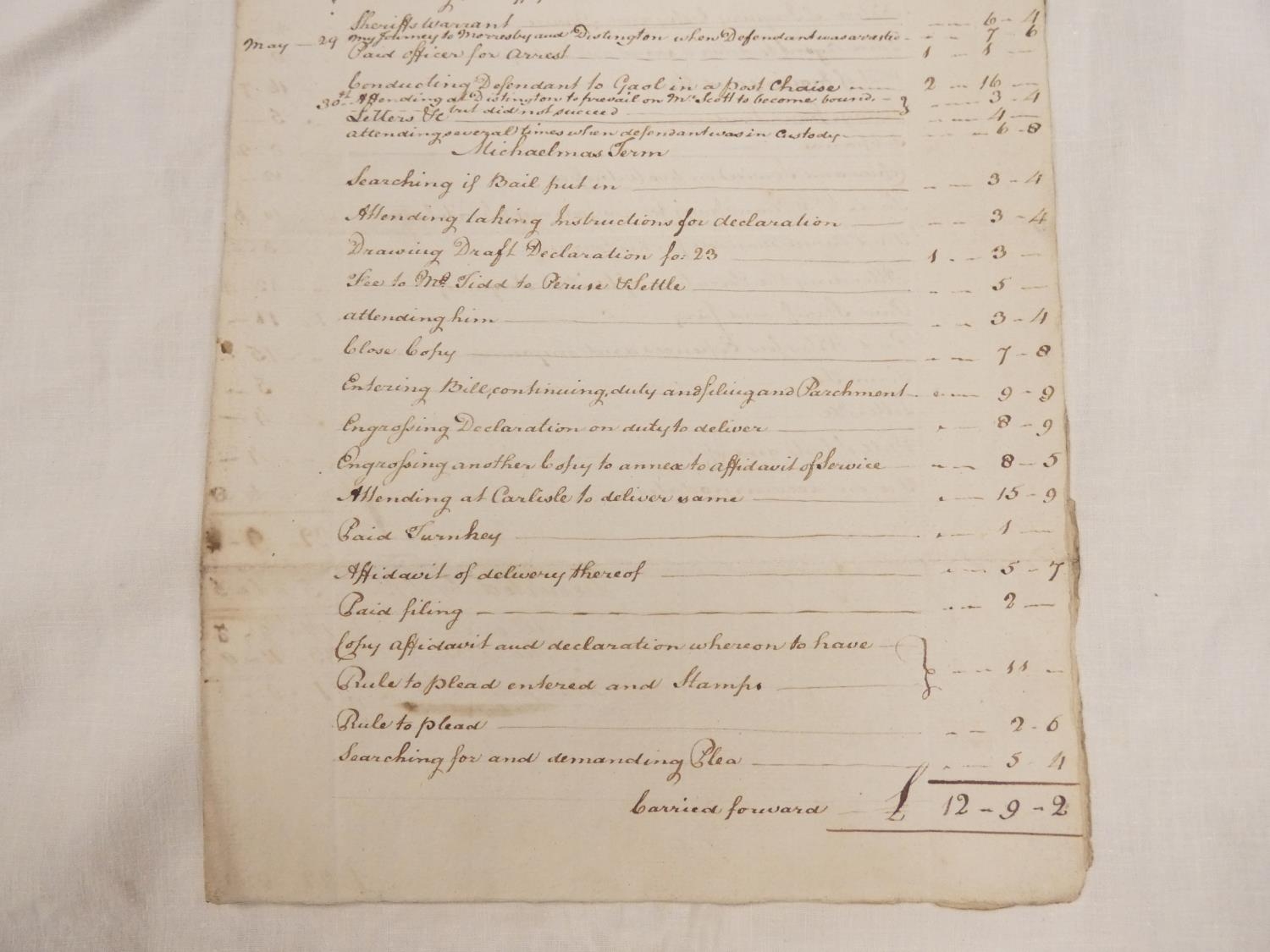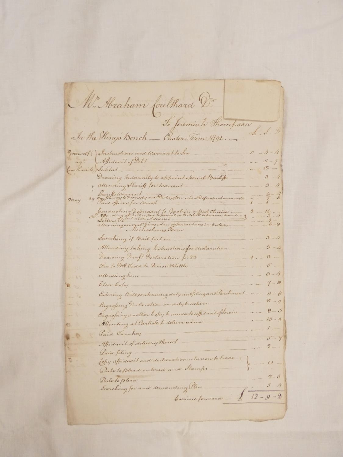 18th Cent. Lawyers Statement of Account. 2 leaves of a folded folio sheet. From H. Crosthwaite ref. King`s Bench case of Abraham Coulthard to Jeremiah Thompson. Details incl. Journey to Moresby and Disington when defendant was arrested ... etc. 1793.