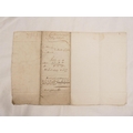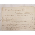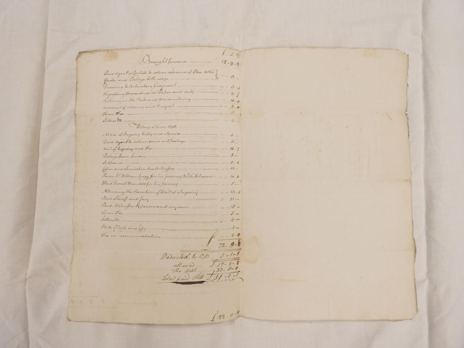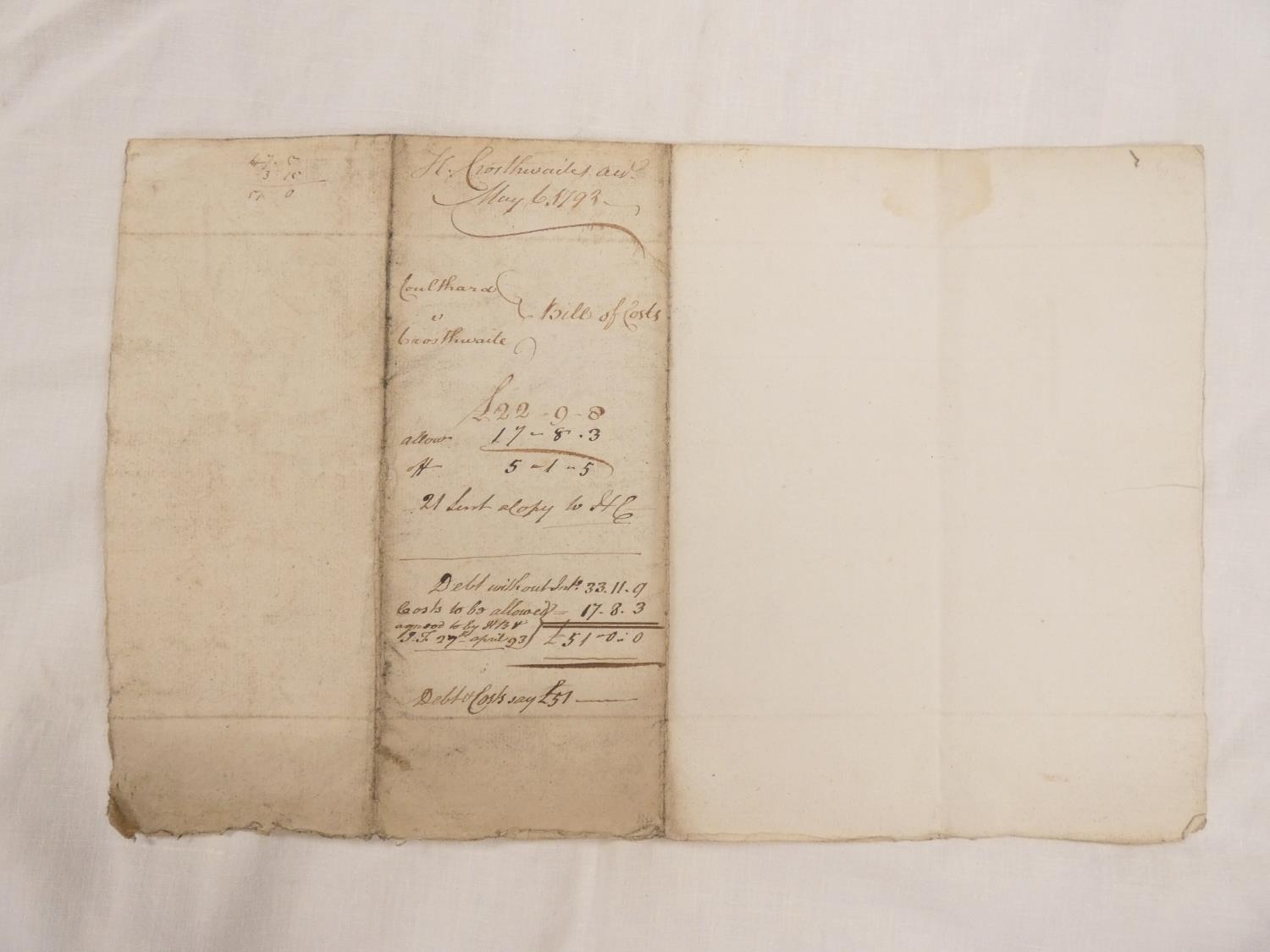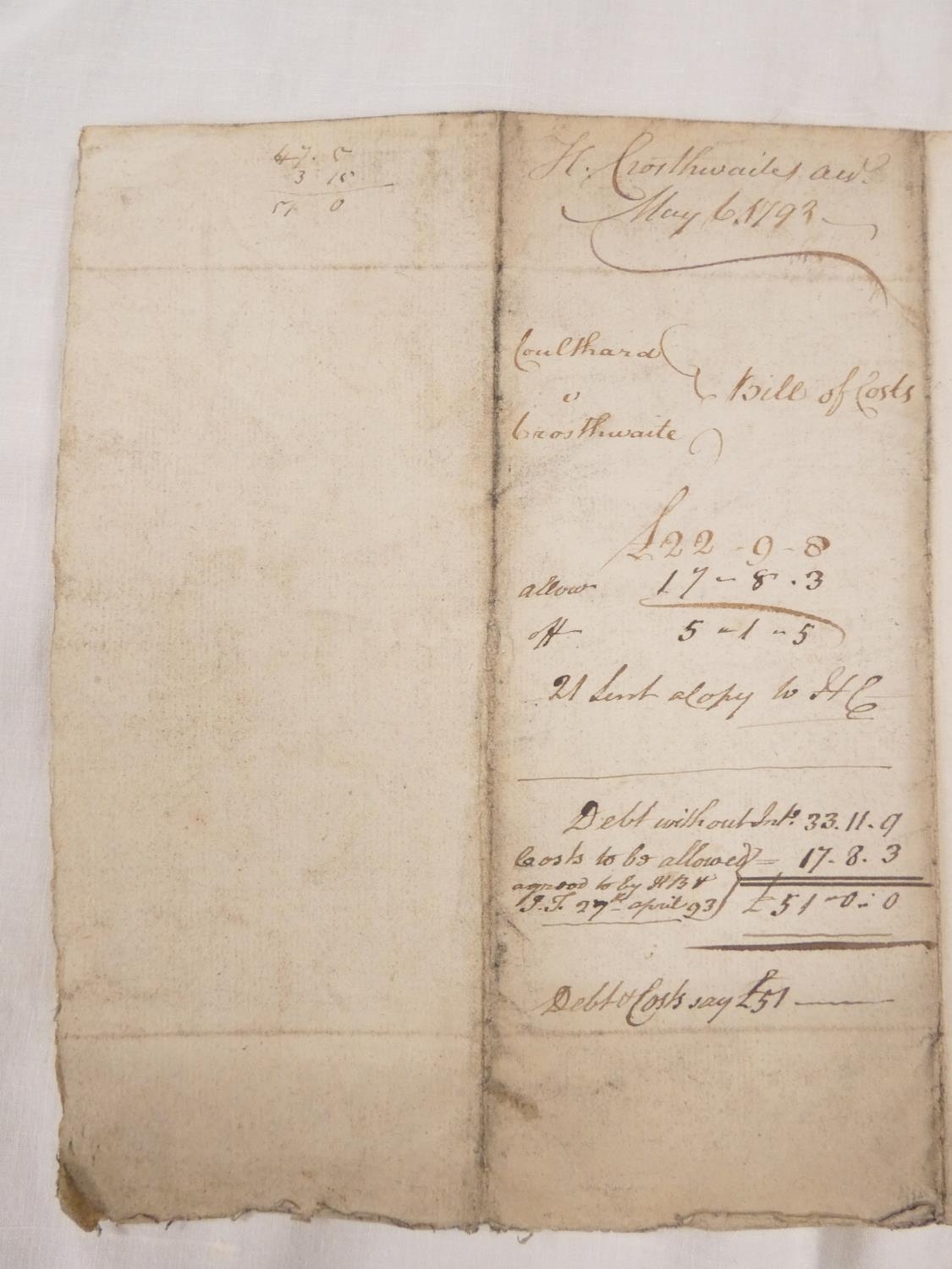 18th Cent. Lawyers Statement of Account. 2 leaves of a folded folio sheet. From H. Crosthwaite ref. King`s Bench case of Abraham Coulthard to Jeremiah Thompson. Details incl. Journey to Moresby and Disington when defendant was arrested ... etc. 1793.