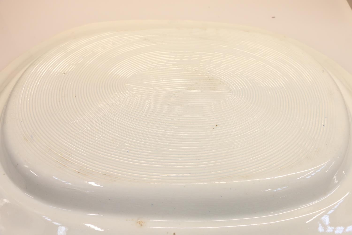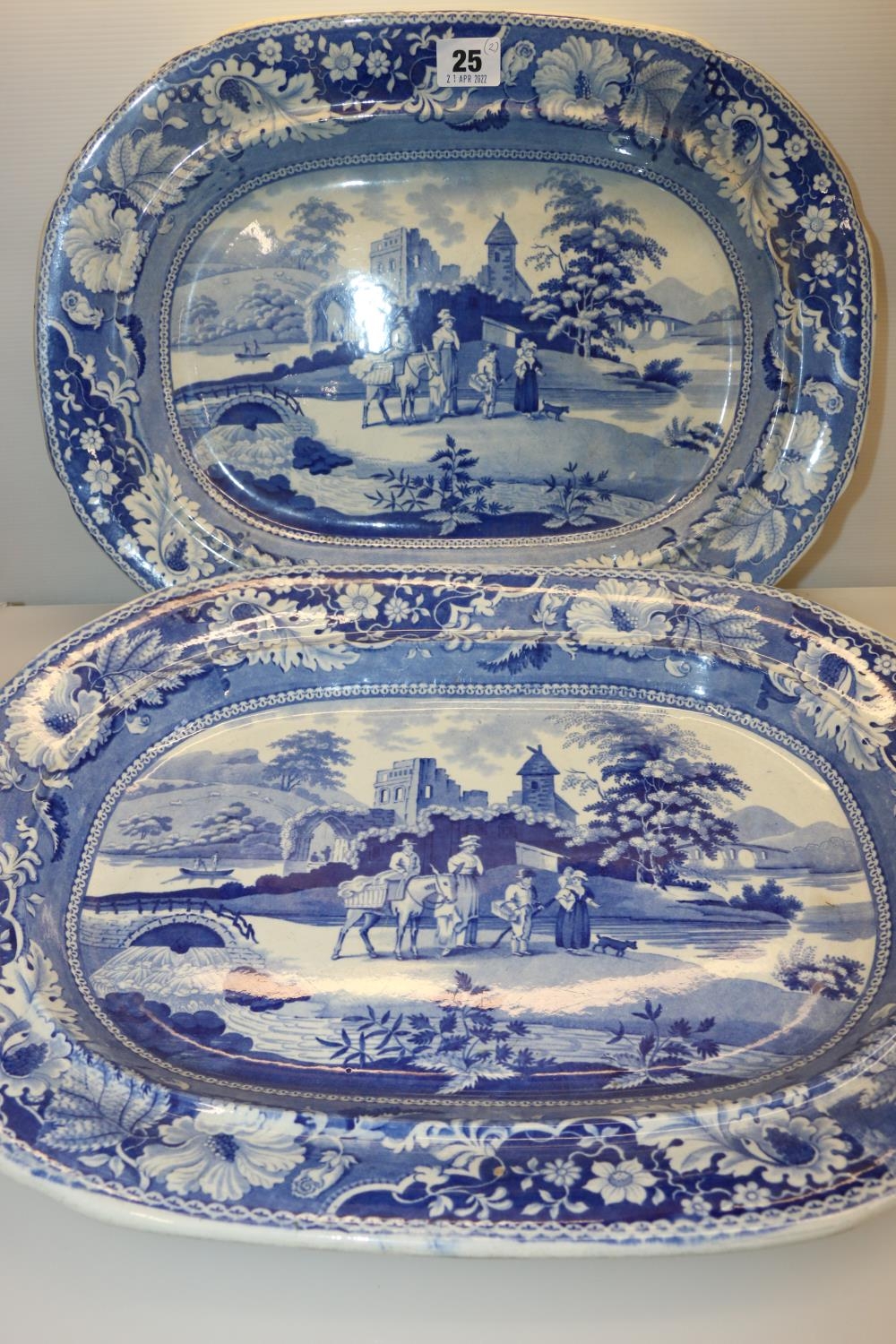 Two antique transfer printed ashets decorated with figures by a river, largest measures 48.5cm wide. (2)