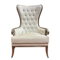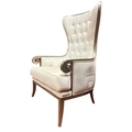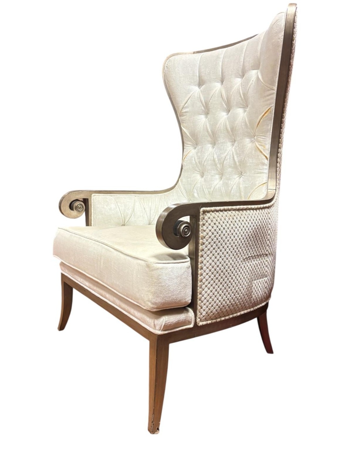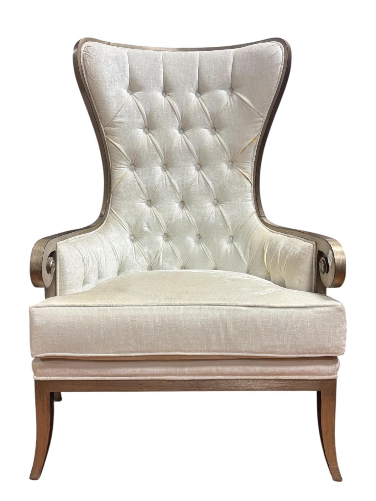 A CONTINENTAL SILVER FRAME AND UPHOLSTERED HIGH BACK CHAIR with deep buttoned upholstered back and seat with loose cushion and scroll arms on sabre legs