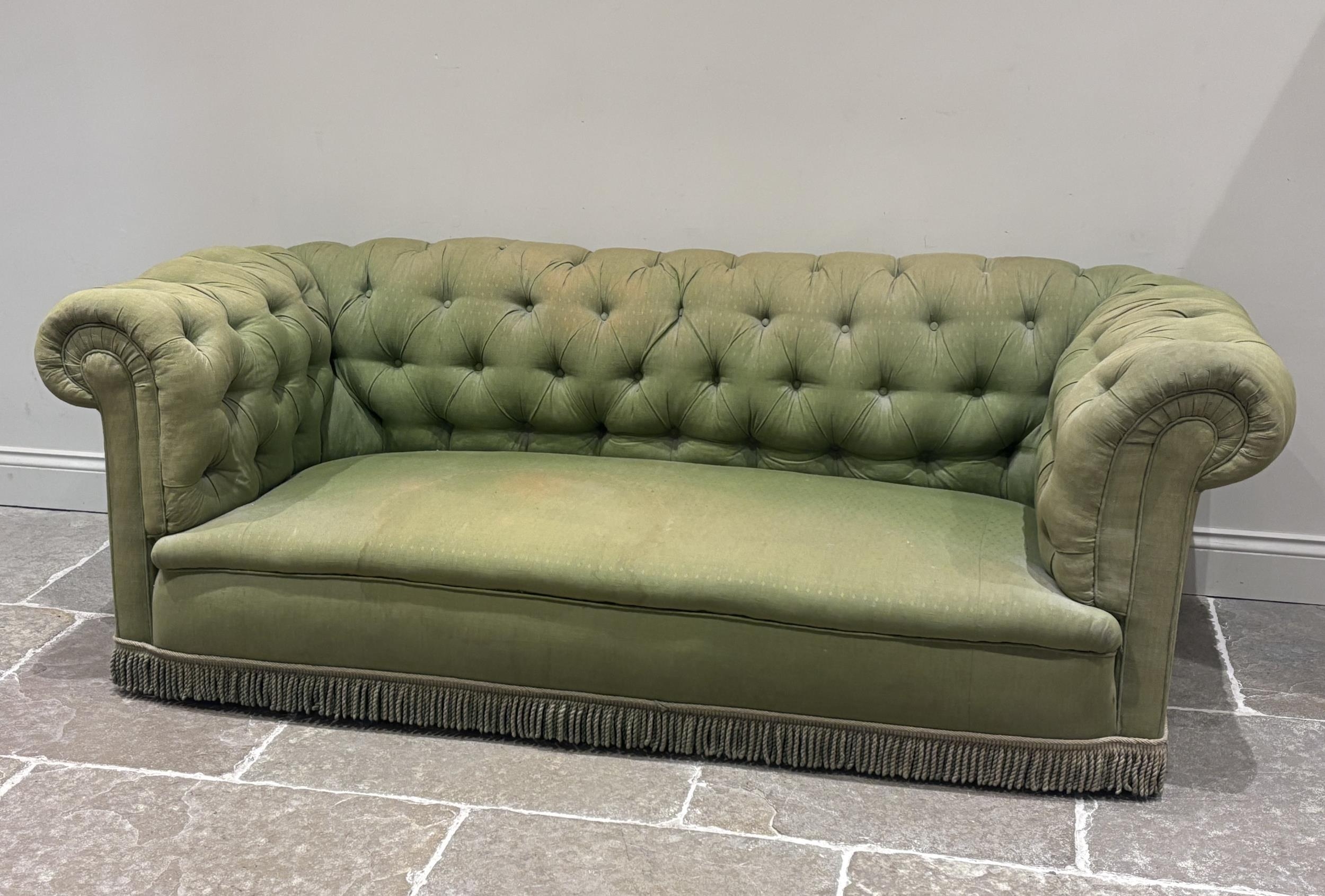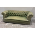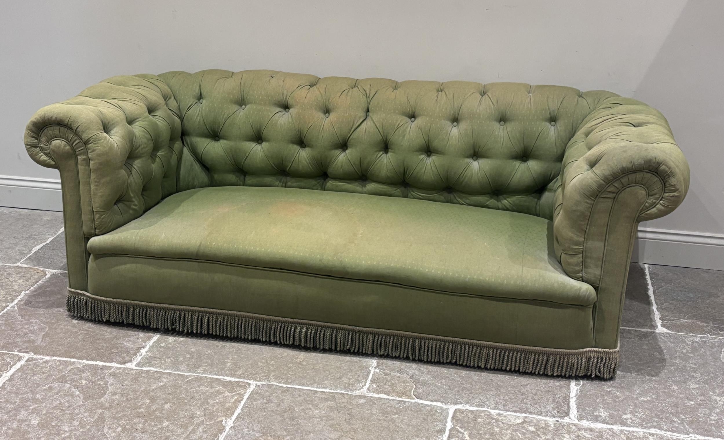 A Victorian Chesterfield sofa, with button upholstered back in an all over green fabric, fringed, 210cm W