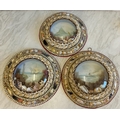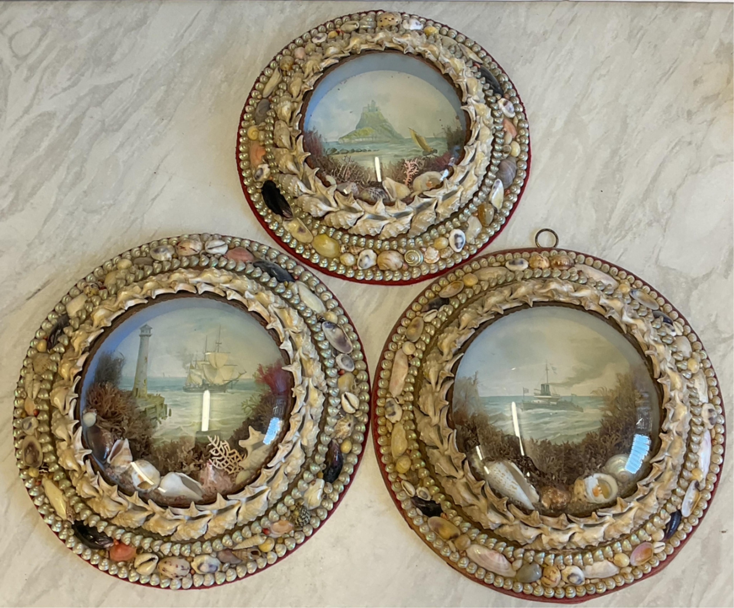 A set of three late Victorian shellwork circular maritime dioramas, with lithographs of ships etc, with seaweed and shells, under convex glass within a shell mounted frame, diameter 27cm. (3)