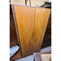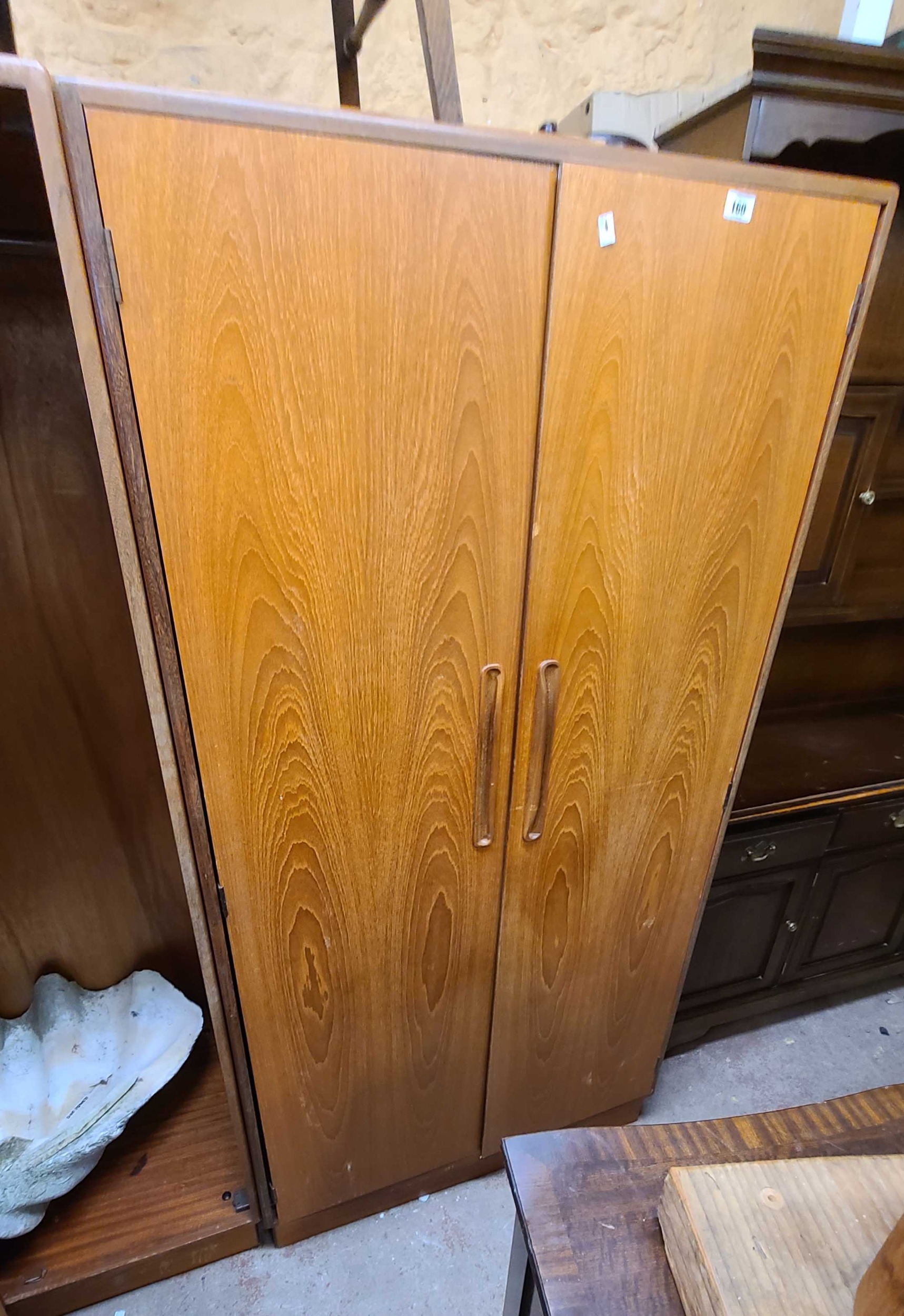 A 91cm mid 20th Century G-Plan teak and mixed wood double wardrobe with hanging space and drawers enclosed by a pair of doors, set on plinth base