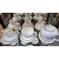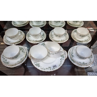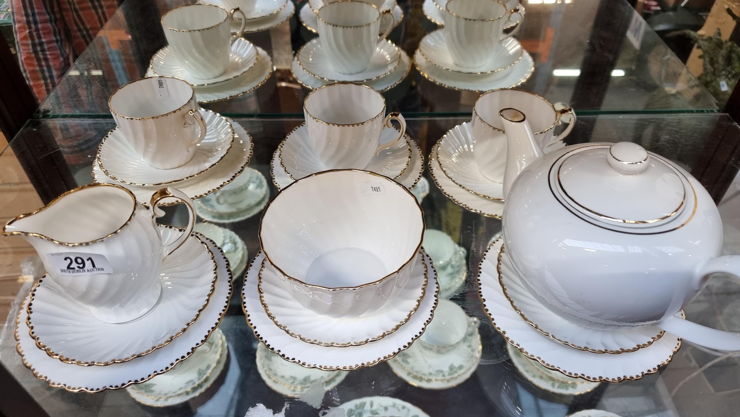 A 17 piece Gladstone Bone China "Old Grecian Flute" partial teaset and a co-ordinating Harmony fine china teapot. All pieces are white with gilt edges. All in good condition.