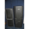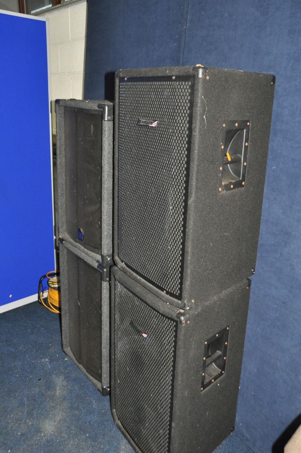 TWO PAIRS OF P.A SPEAKERS comprising of a pair of Carlsbro HS15 trapezoidal speakers with 15in and horn and a pair of IDEX EN-15T speakers with 15in and horn (all untested)