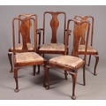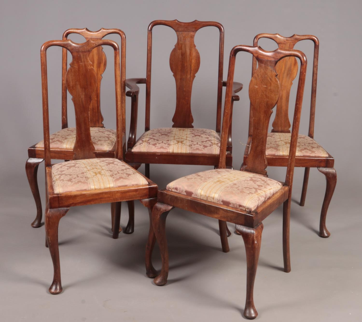 A set of four mahogany Queen Anne Style chairs, together with one carver chair, all with upholstered fabric seats. H:108cm, W: 45cm.