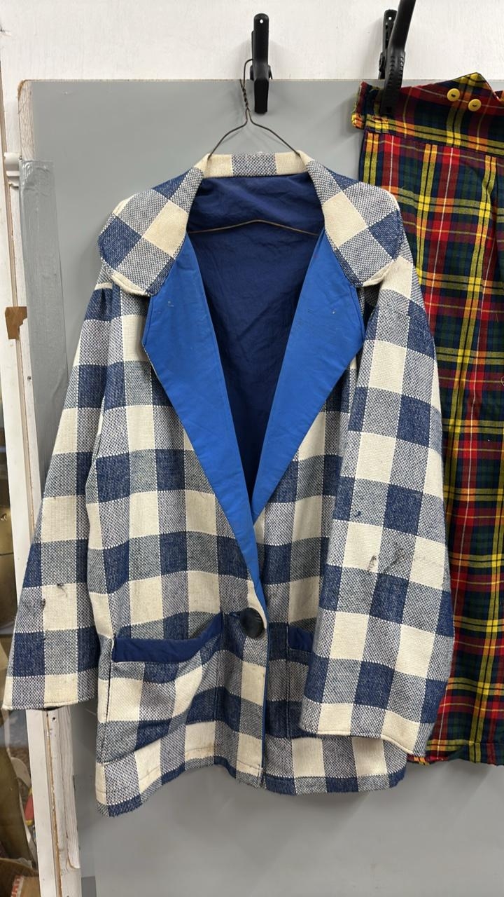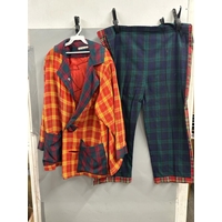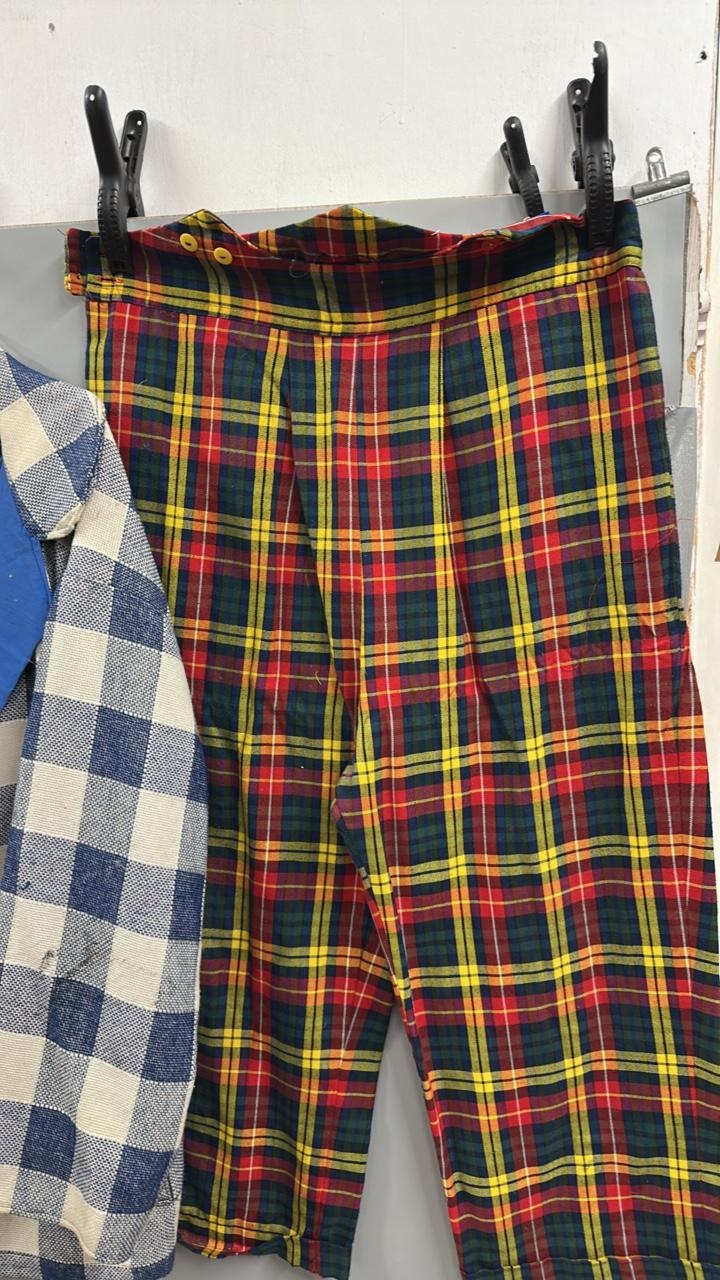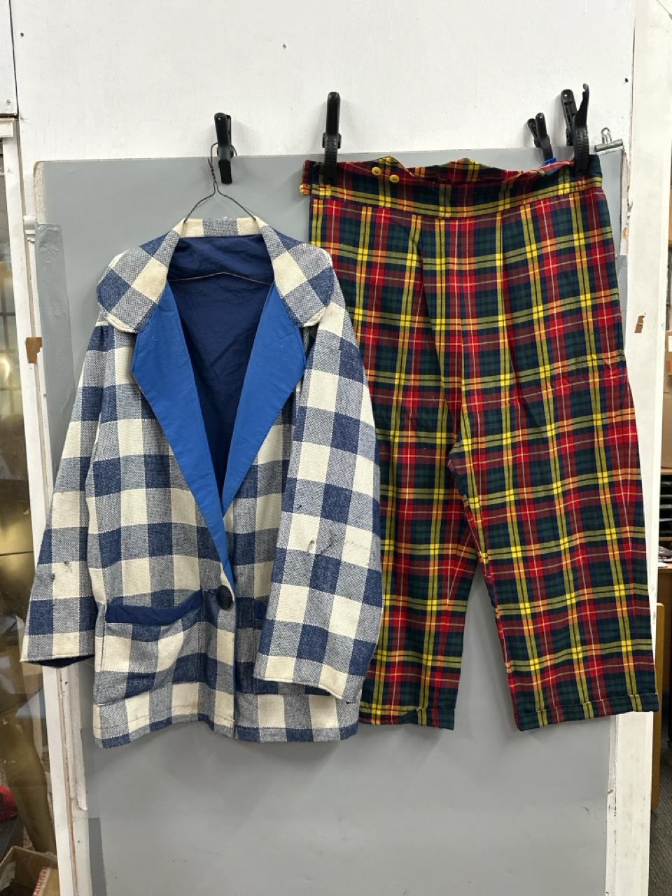 Stage worn clown costume including blue & white jacket and tartan trousers / Rail 4