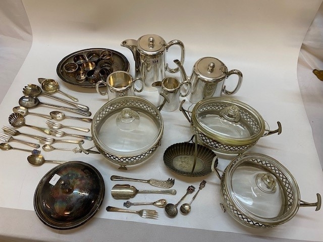 Two silver napkin rings, a hotel plate tea service, three casserole dishes and frames and a selection of flatware