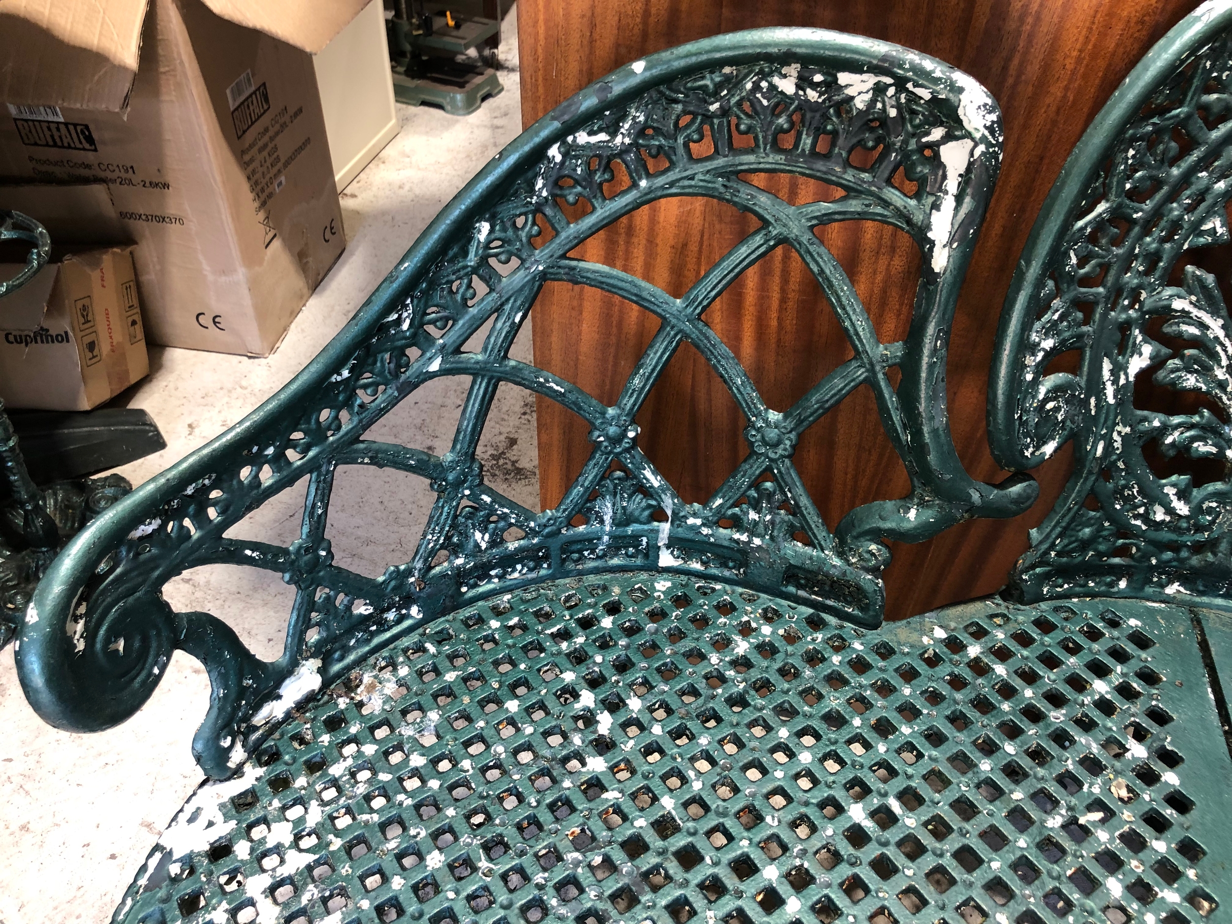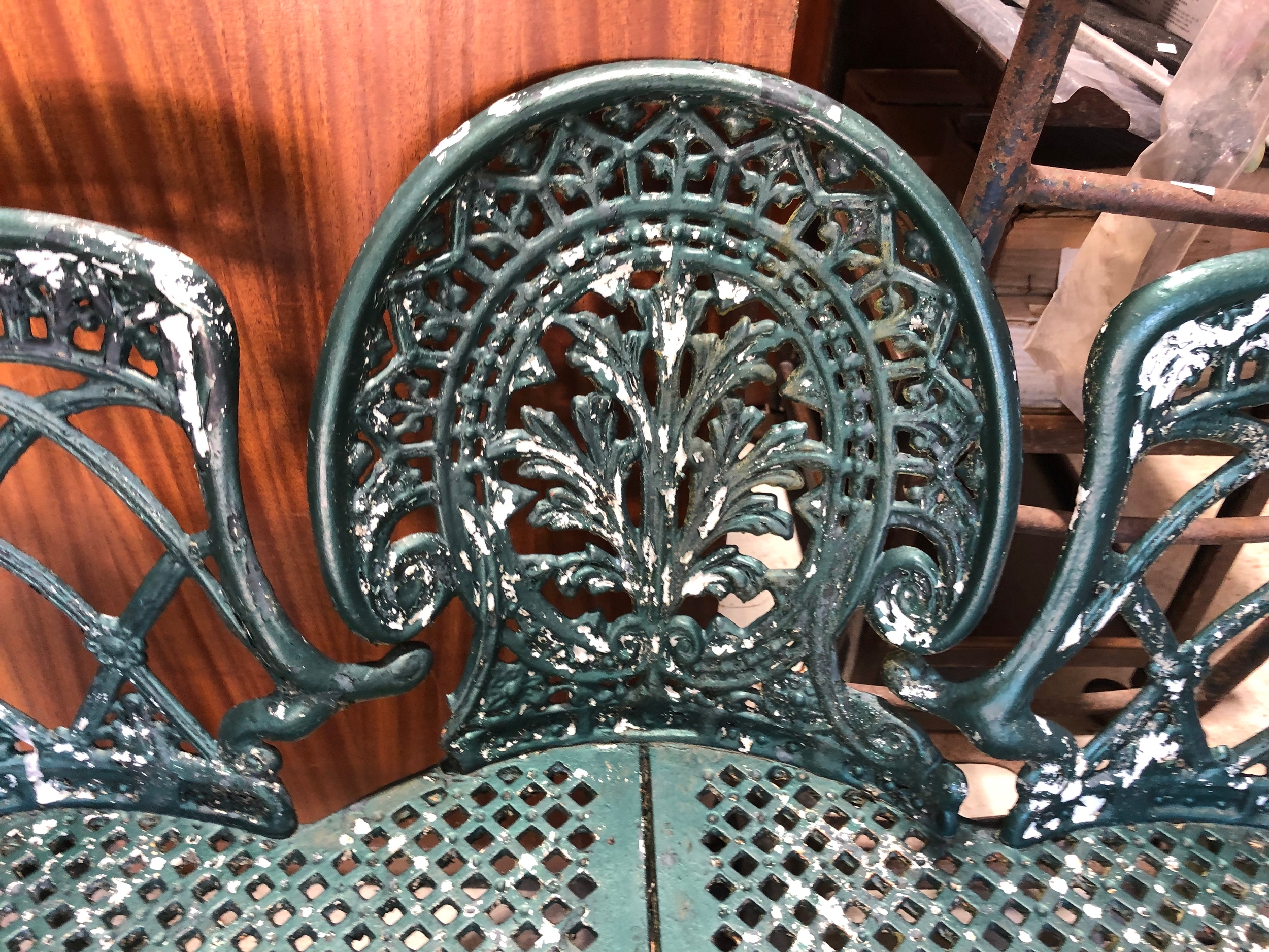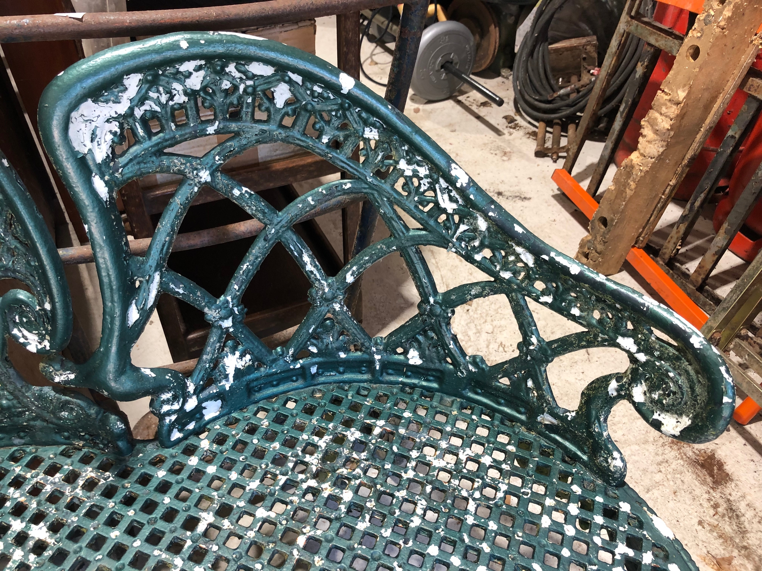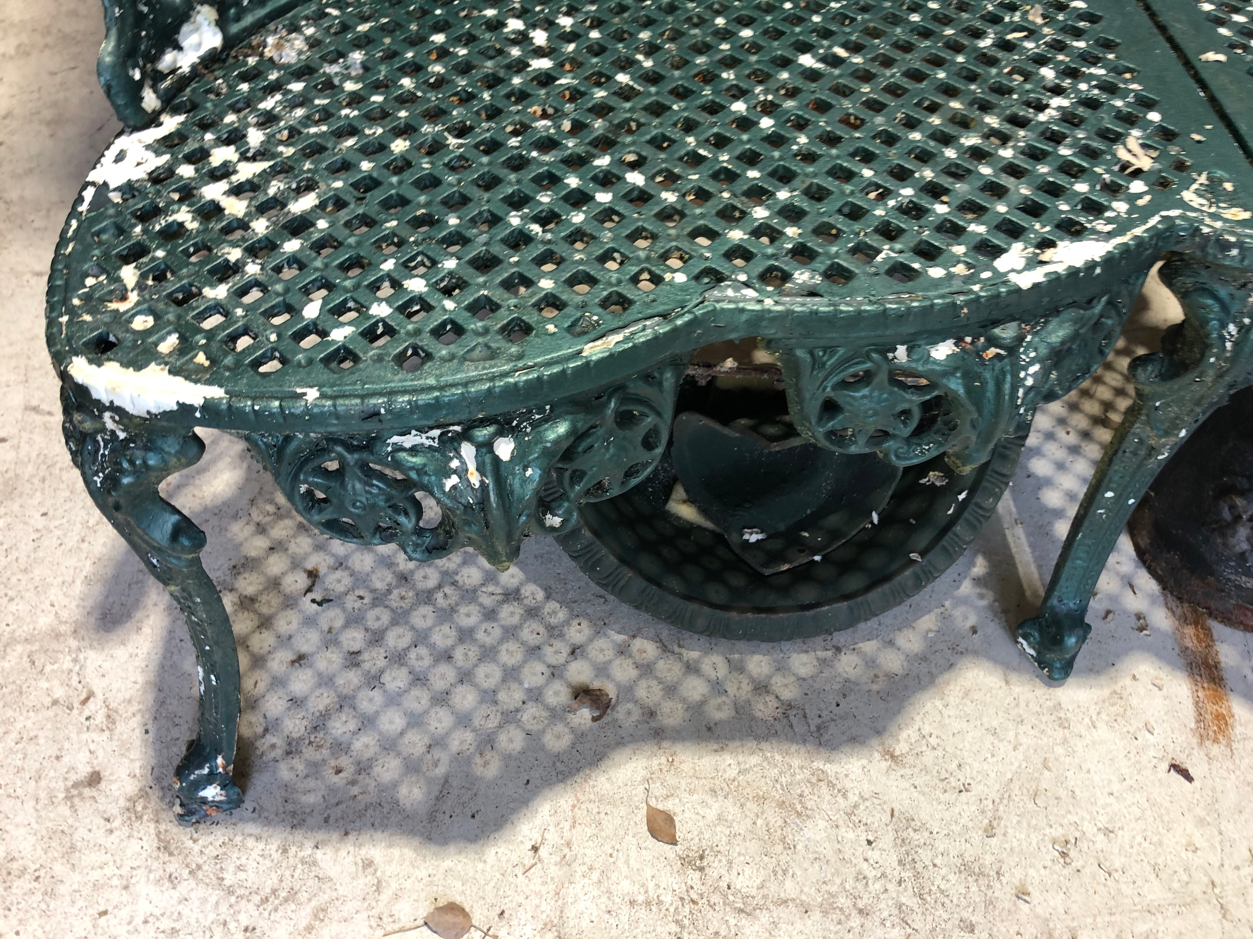 Painted metal garden love seat.