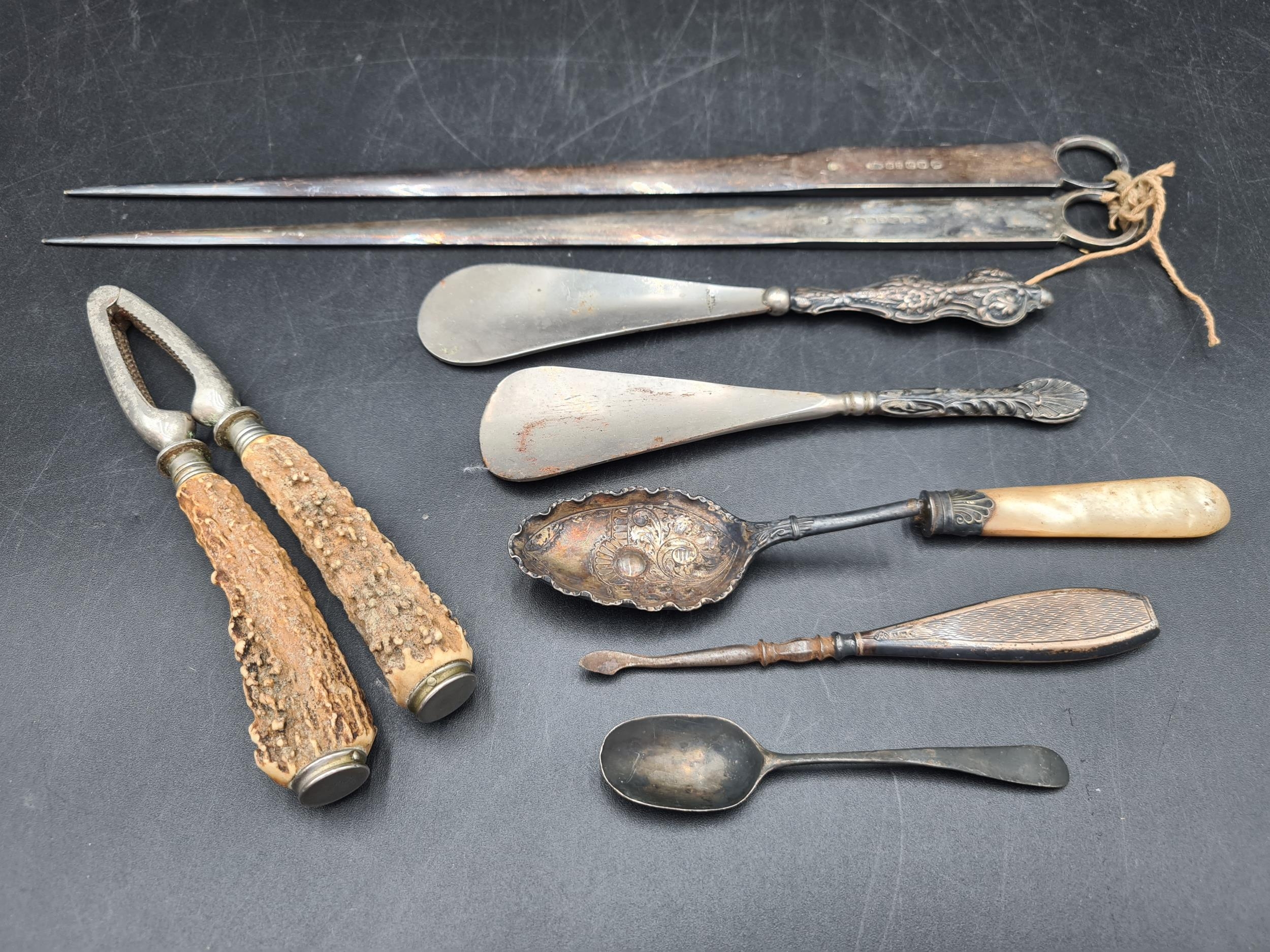 Two silver handled Shoe Horns, two plated Meat Skewers, Nut Crackers, Spoons, etc