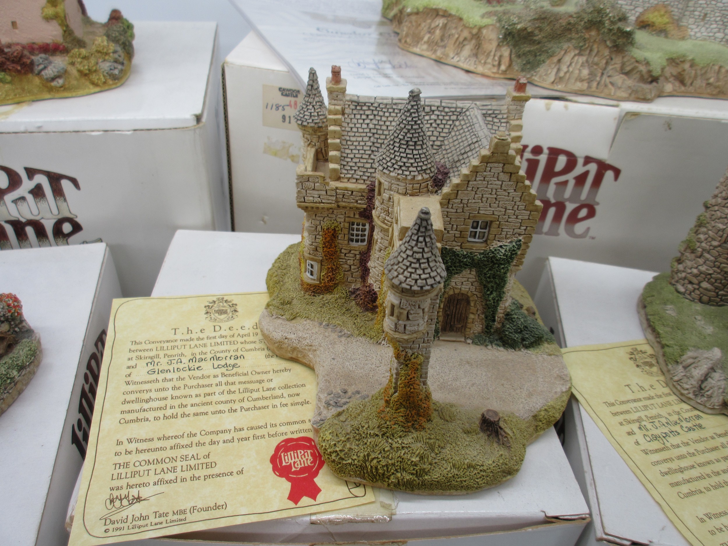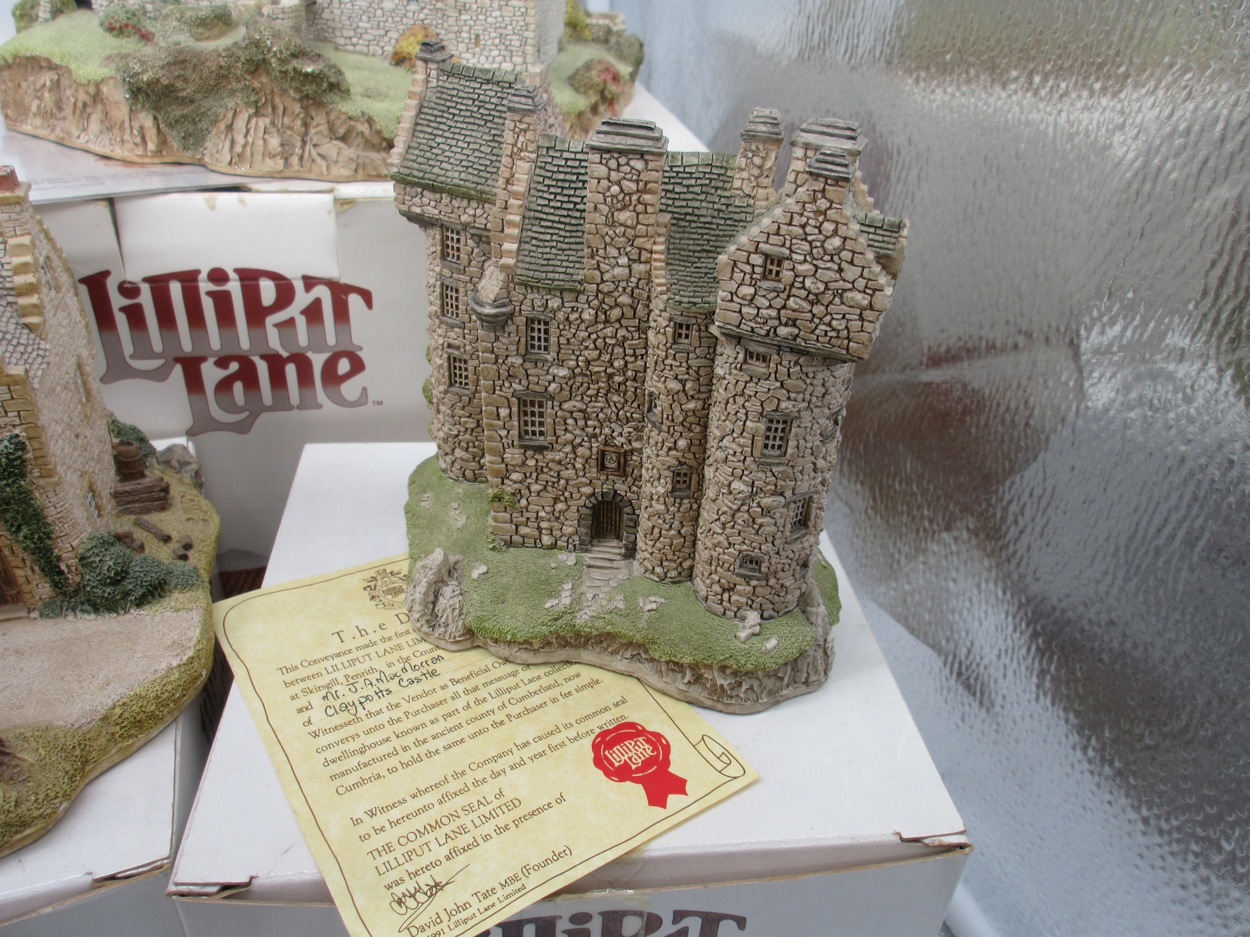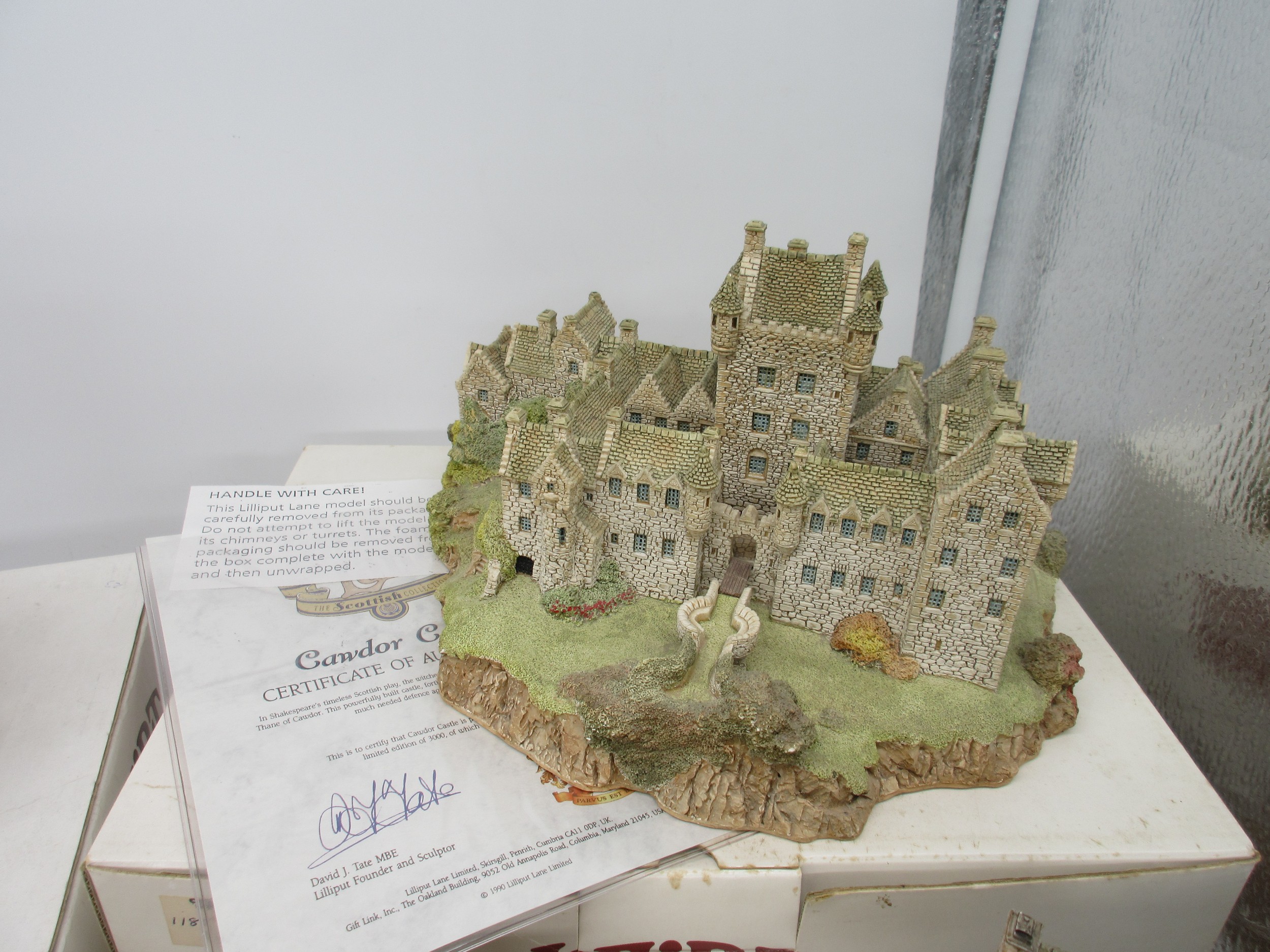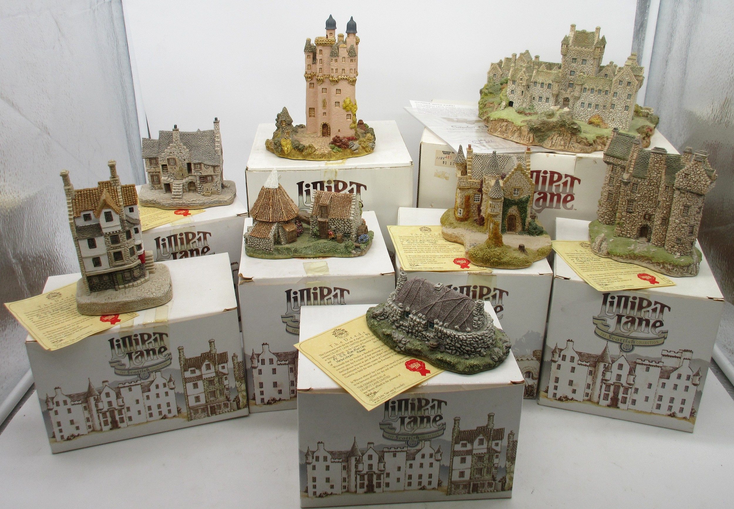 Lilliput Lane Scottish Collection - Boxed limited edition model, 'Cawdor Castle' (1185/3000), with certificate of authenticity, H25cm x 20cm; Craigievar Castle; Stockell Tenement; John Knox House; Hebridean Hame; Claypotts Castle; Glenlockie Lodge; Preston Mill; Qty 8