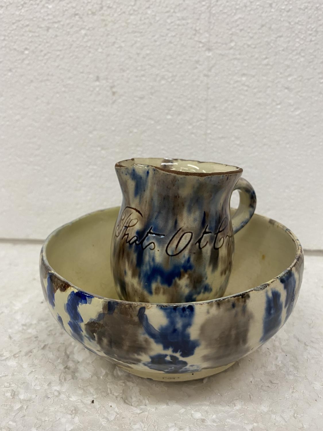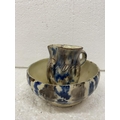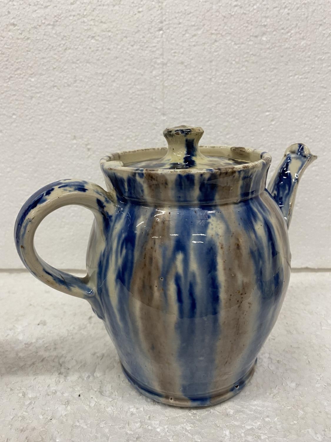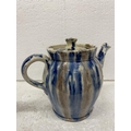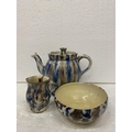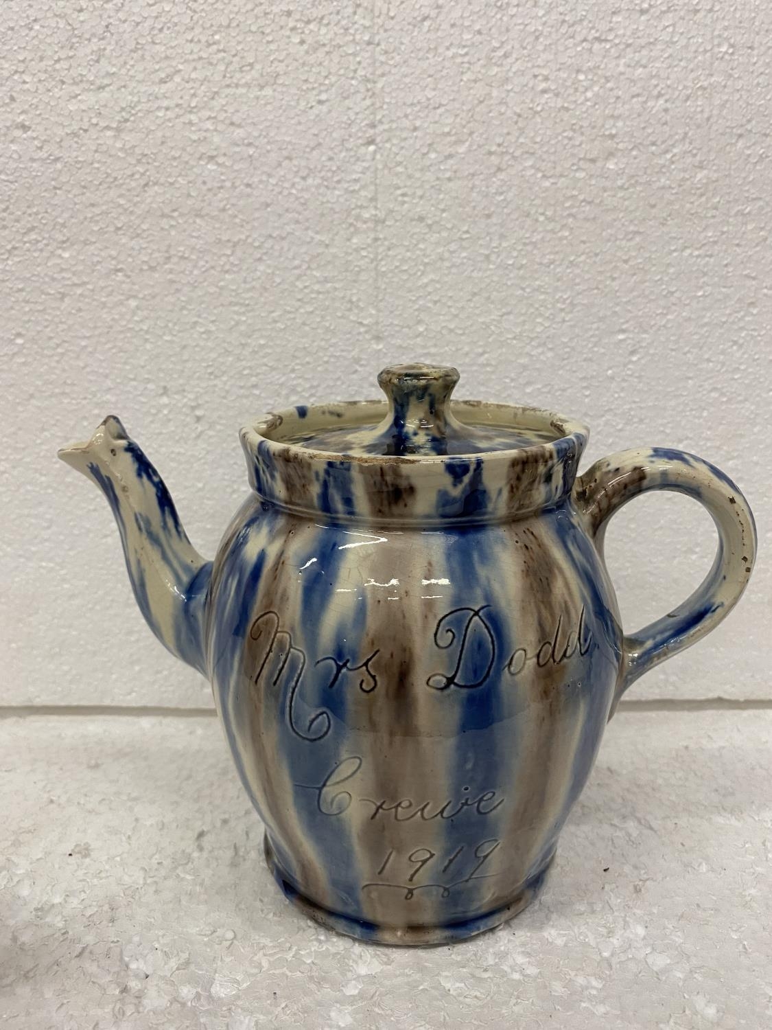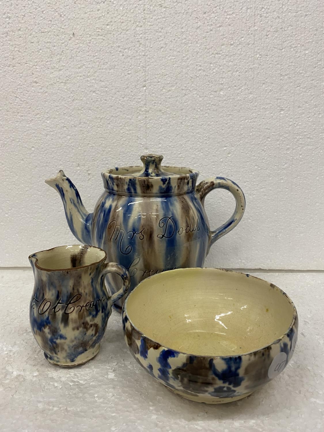 A STUDIO POTTERY SET TO INCLUDE A TEAPOT, SUGAR BOWL AND CREAM JUG - THE TEAPOT BEARING THE NAME MRS DODDS, CREWE, 1919