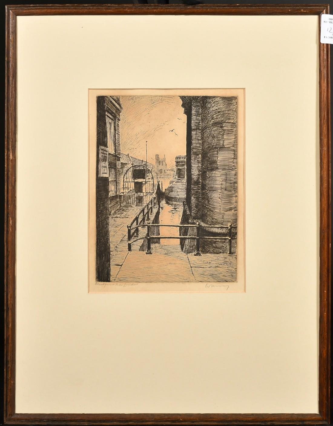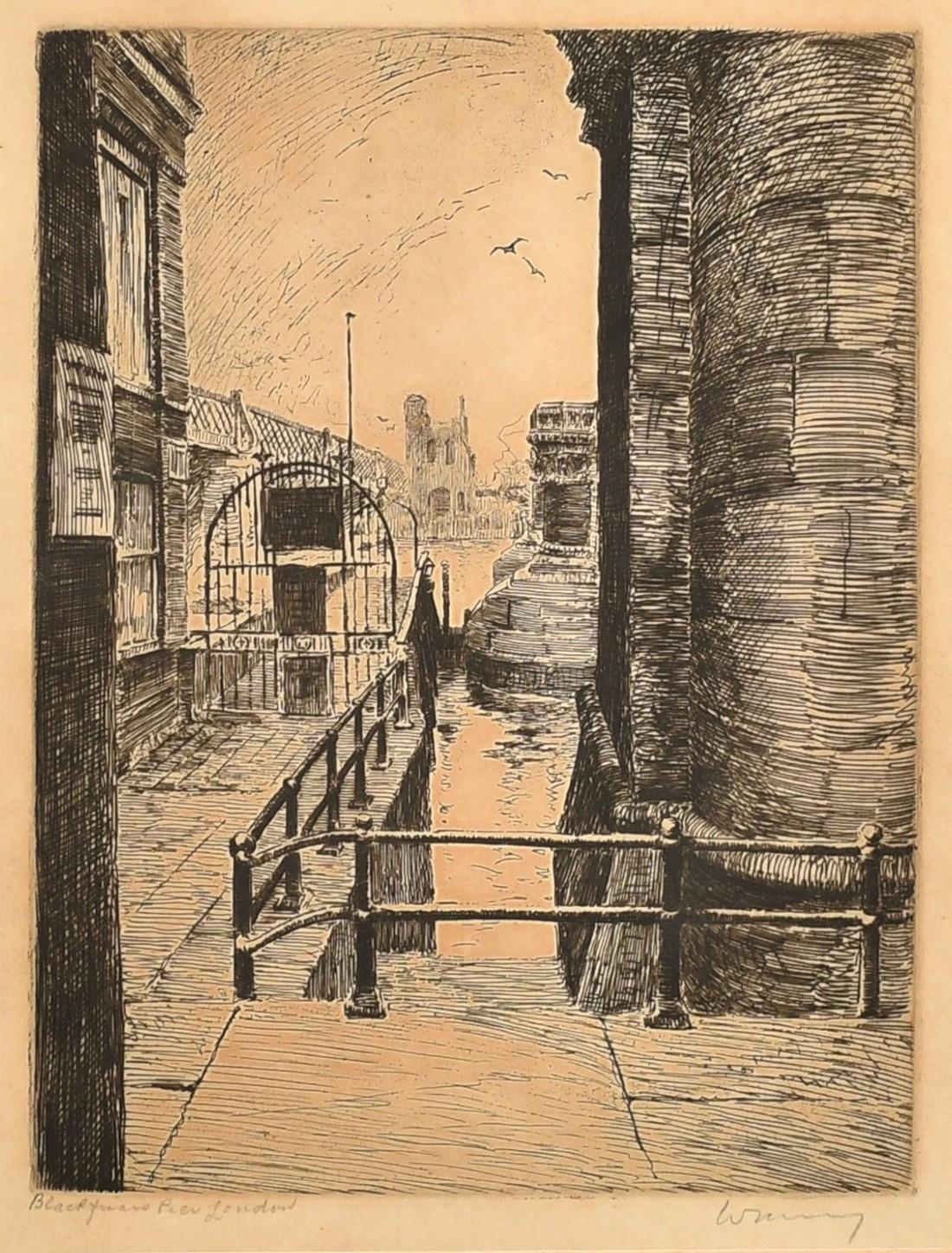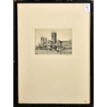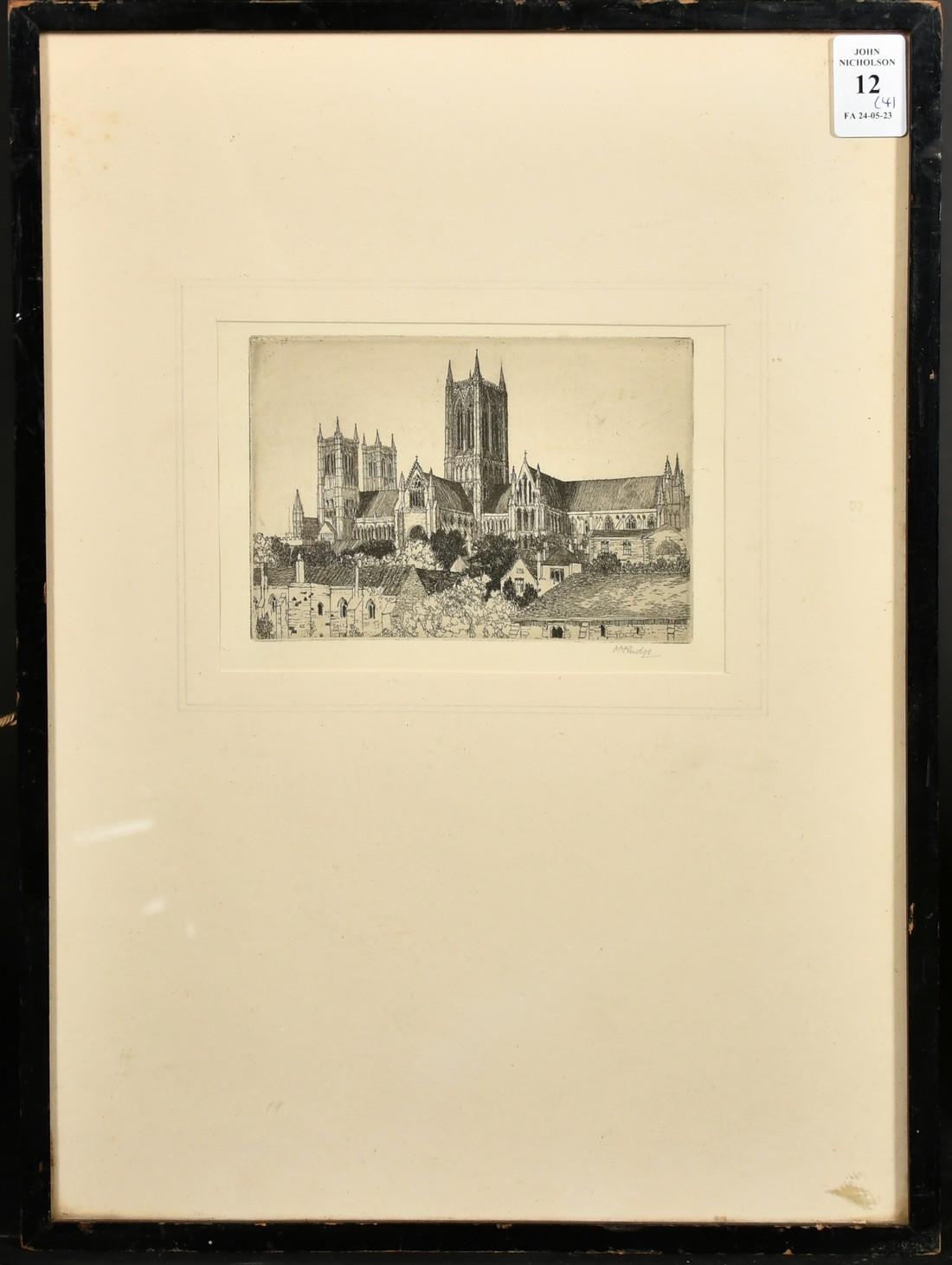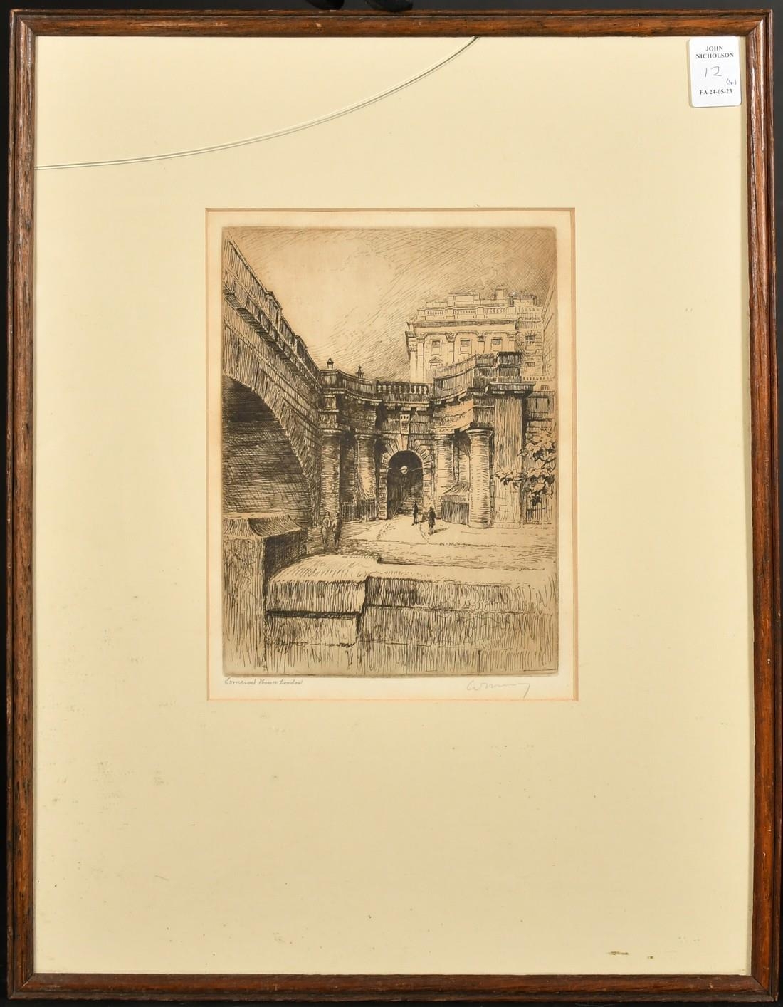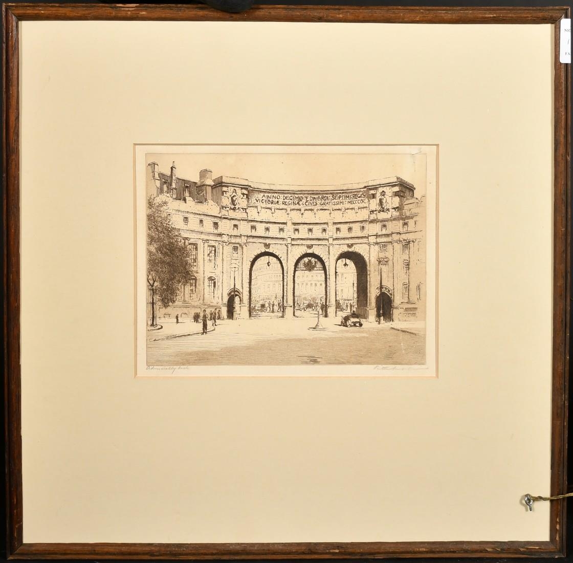 A collection of four engravings, including a pair by the same hand of 'Somerset House' and 'Blackfriars', each indistinctly signed, plate size 8" x 6" (20 x 15cm), along with an engraving of Admiralty Arch, indistinctly signed, 6" x 8" (15 x 20cm), and a signed etching of Lincoln Cathedral by Margaret Rudge, 3.75" x 5.25" (9.5 x 13.5cm), (4).