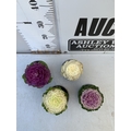 FOUR POTTED MULTCOLOURED ORNAMENTAL CABBAGE BRASSICAS IN 10CM POTS. TO BE SOLD FOR THE FOUR