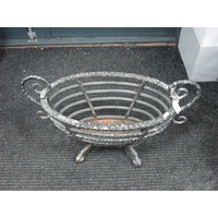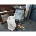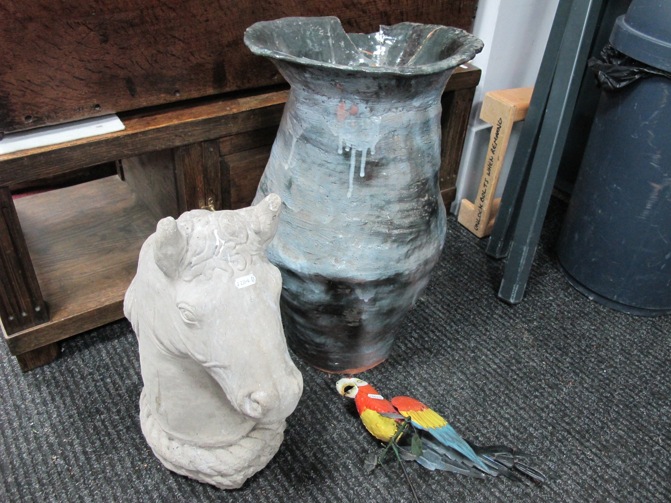 Large Composite Horse Head Garden Ornament (H44cm), painted metal parrot garden decoration, together with a large free-form clay vase with glazed finish (W34 x H57cm). (3)