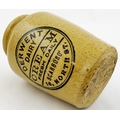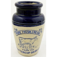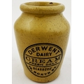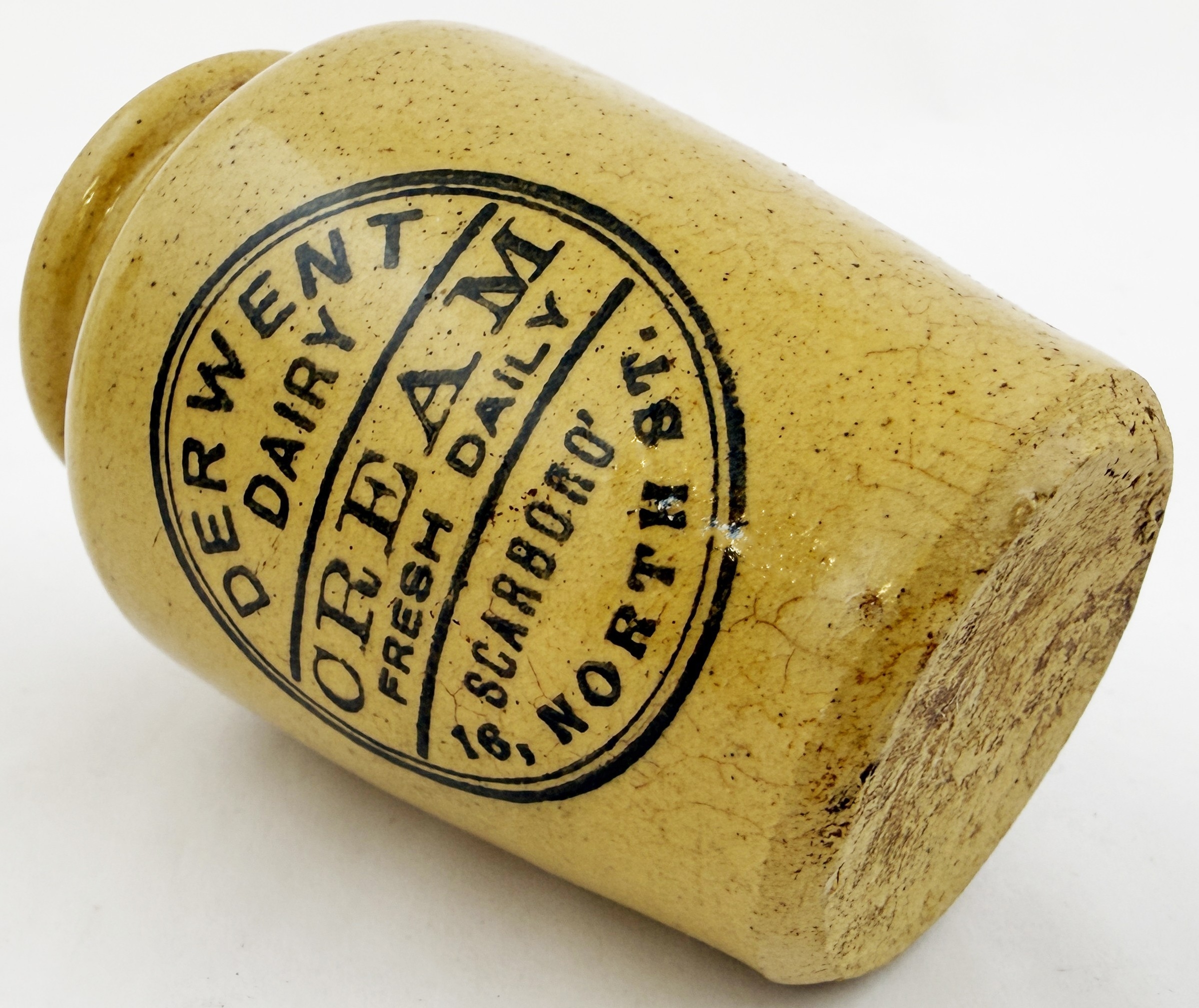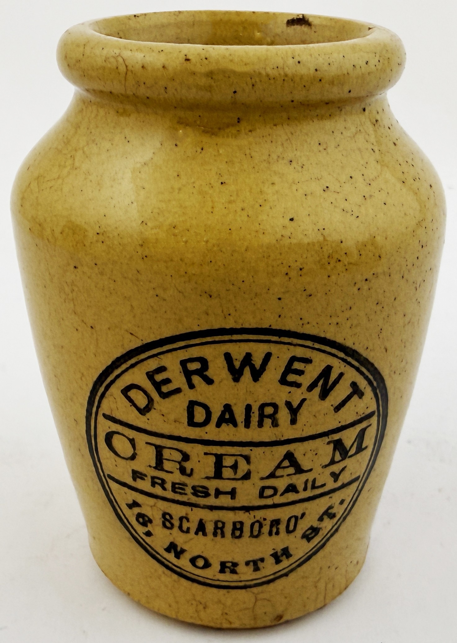 DERWENT DAIRY SCARBOROUGH CREAM. 3ins tall. Tan glazed cream pot printed DERWENT/ DAIRY/ CREAM/ FRESH DAILY/ SCARBORO/ 16 NORTH ST. Hugh Davidson collection. Small inner lip graze.
