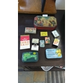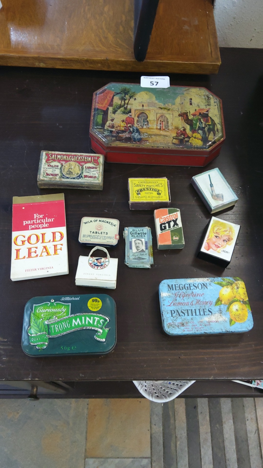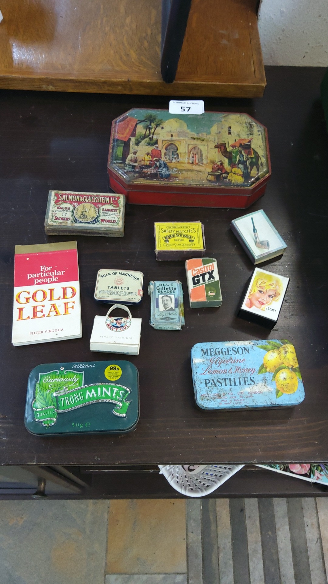 A collection of vintage tins and packets, including an octagonal painted tin with Orientalist market scene, Meggeson Glycerine Lemon & Honey Pastilles tin, St Michael Strong Mints tin, and assorted advertising matchboxes and cartons.