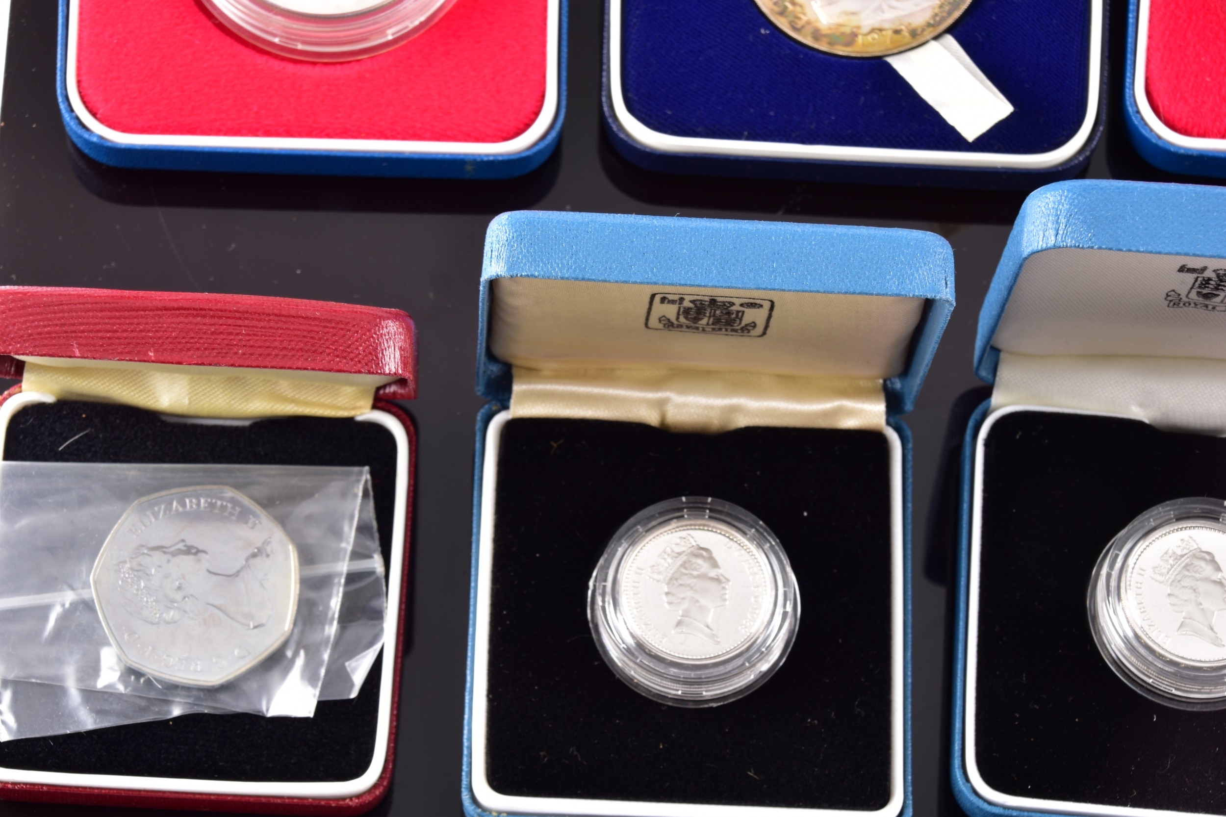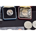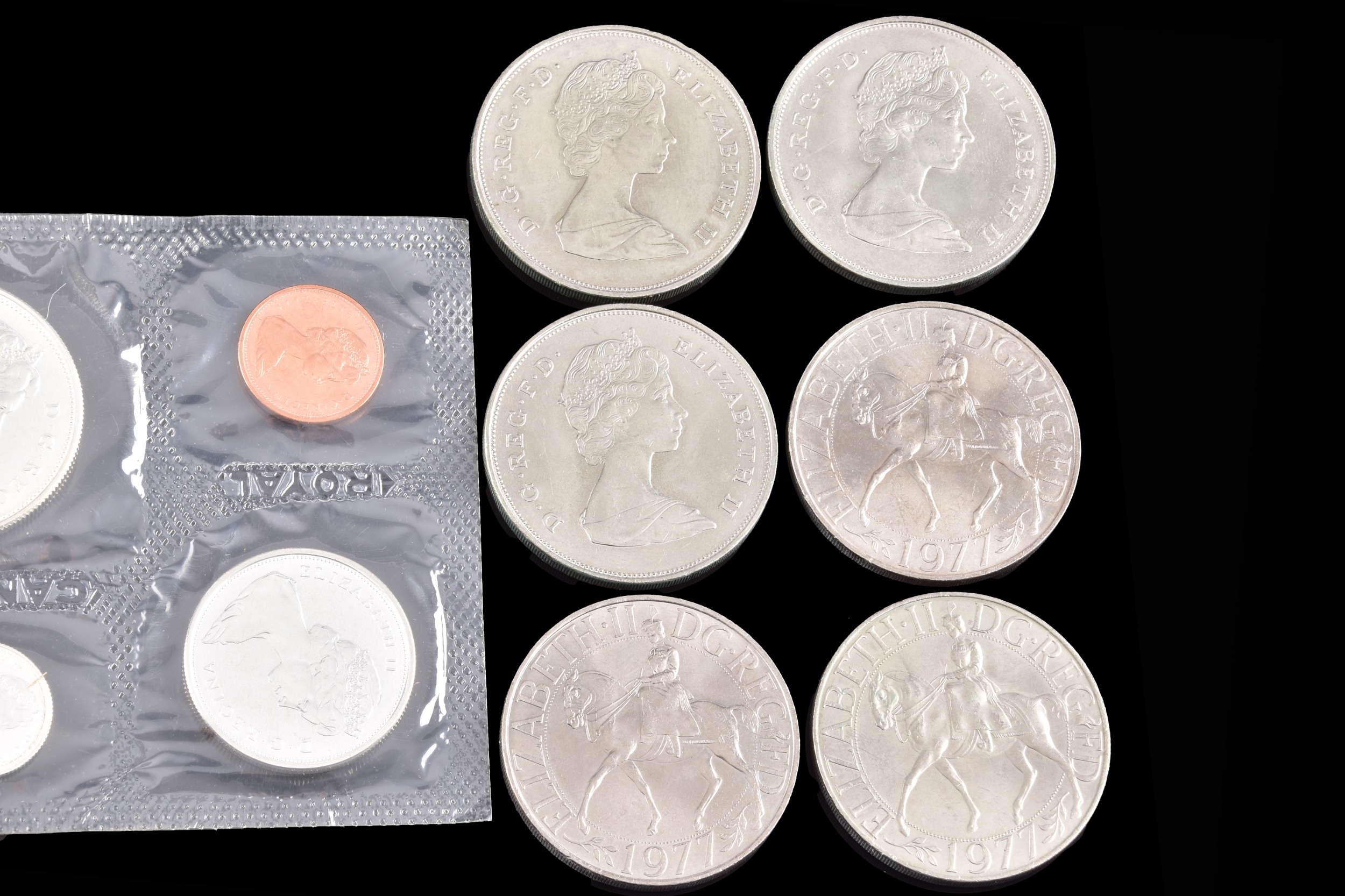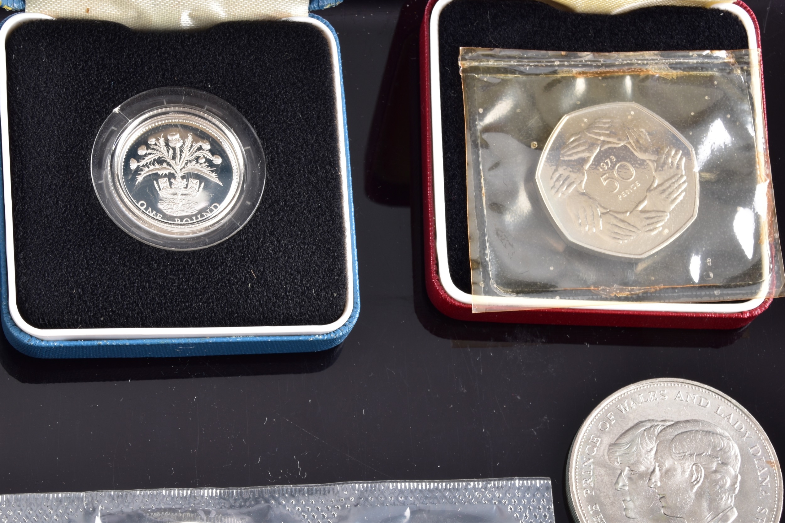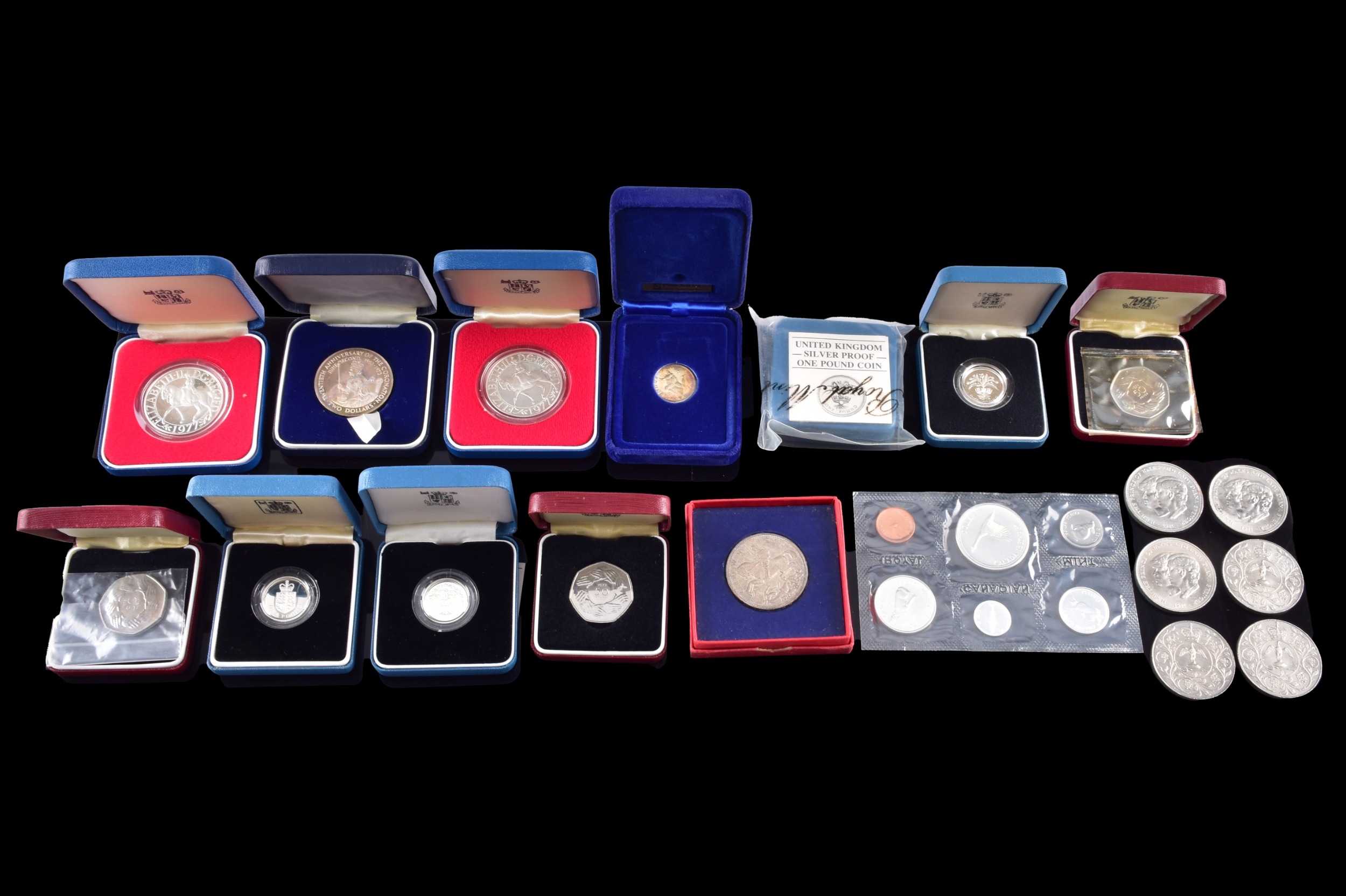 A collection of coins, including four cased United Kingdom silver proof one pound coins, a cased 1973 Cook Islands 20th Anniversary of the Coronation of Queen Elizabeth II proof silver 2 dollar coin, two cased Queen's silver jubilee commemorative silver crown, a 1935 George V silver jubilee crown coin, a 1967 Canadian Confederation commemorative coin set, three 1973 British 50 pence cased coins, three 1977 Queen Elizabeth II silver jubilee commemorative crown coins, a 1978 Isle of Man one pound coin, together with three 1981 Prince Charles and Lady Diana Spencer commemorative coins; together with a collection of circulated GB and world coins.