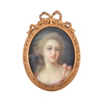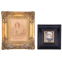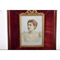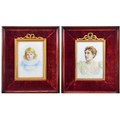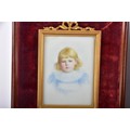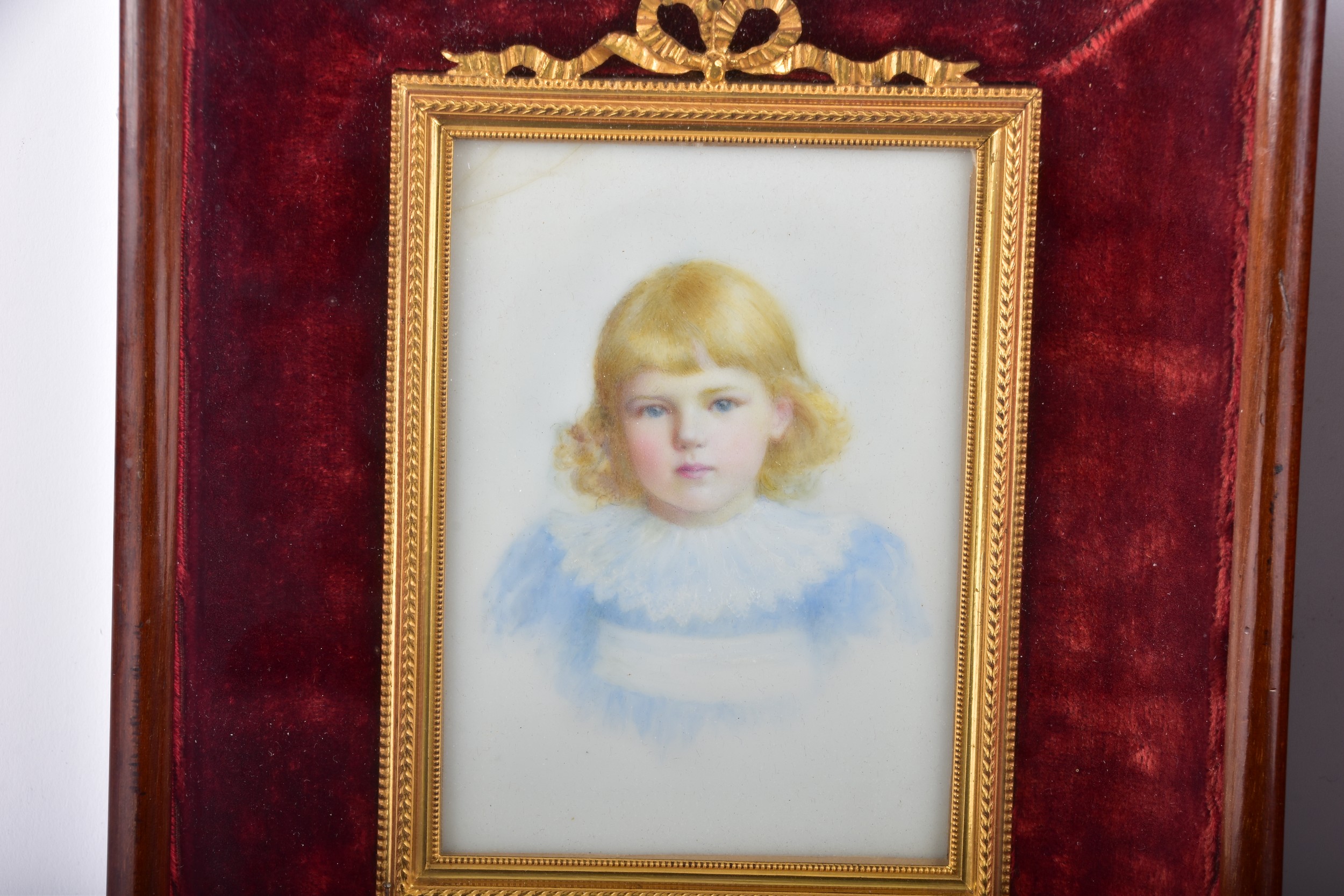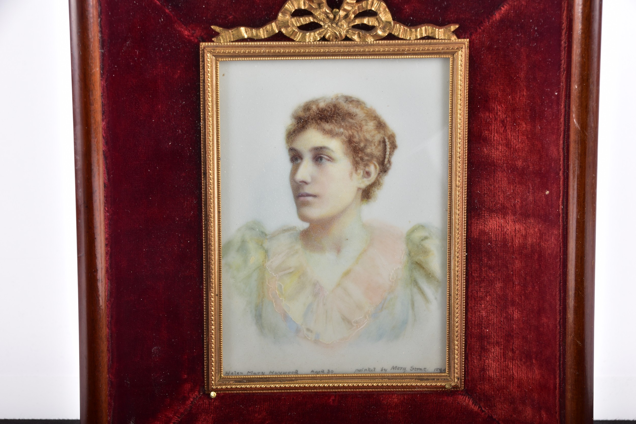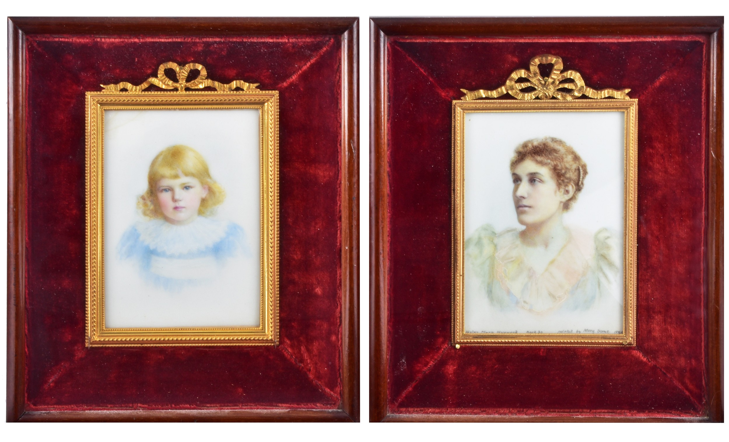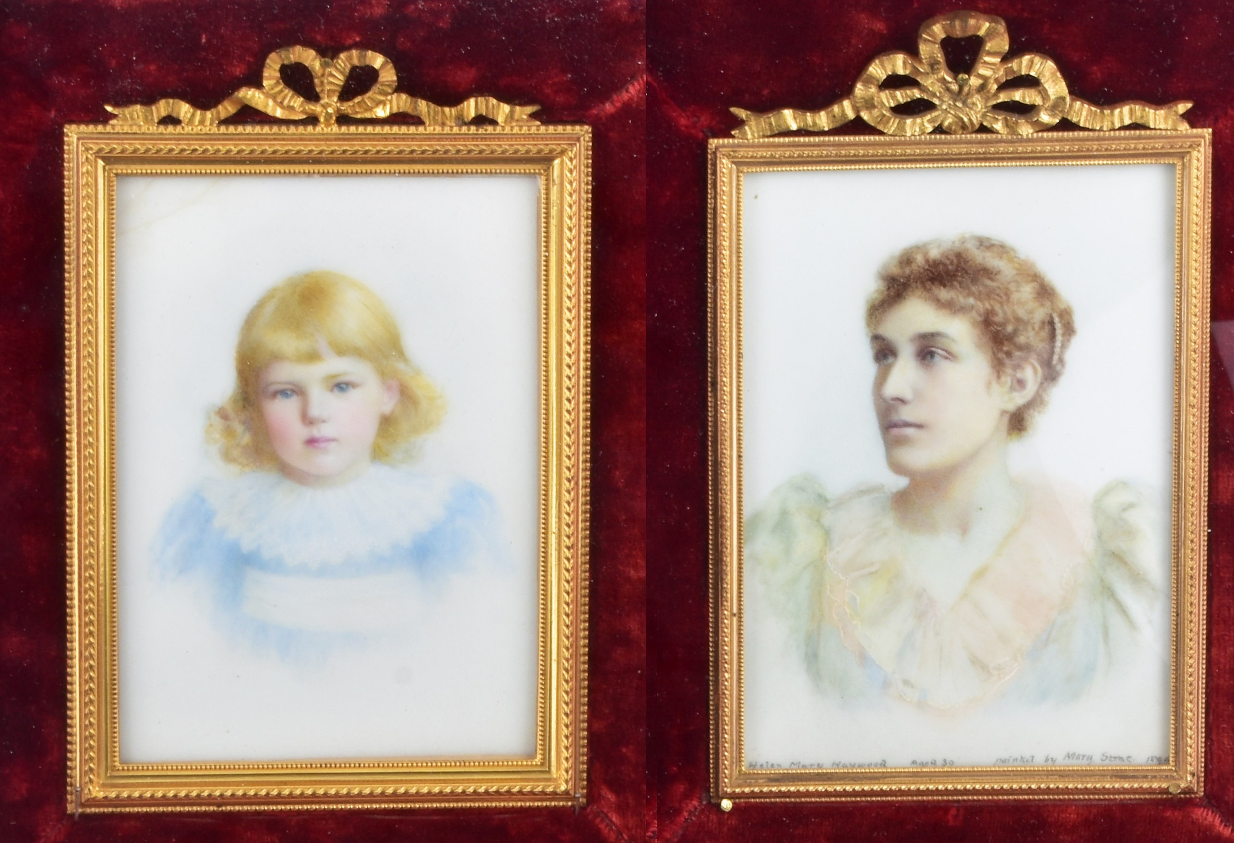 A late Victorian portrait of a lady, depicting a lady with a fine pearl hair pin, wearing a pastel coloured dress, identified in pencil underneath as Helen Mary Haywood, aged 30, by Mary Stern (?) dated 1894, painted on porcelain, togeher with another of a young child with blonde hair, likely her daughter, in matching gilt frames, within red velvet lined box frames, glazed. Outer frames, 25 x 21 cm.