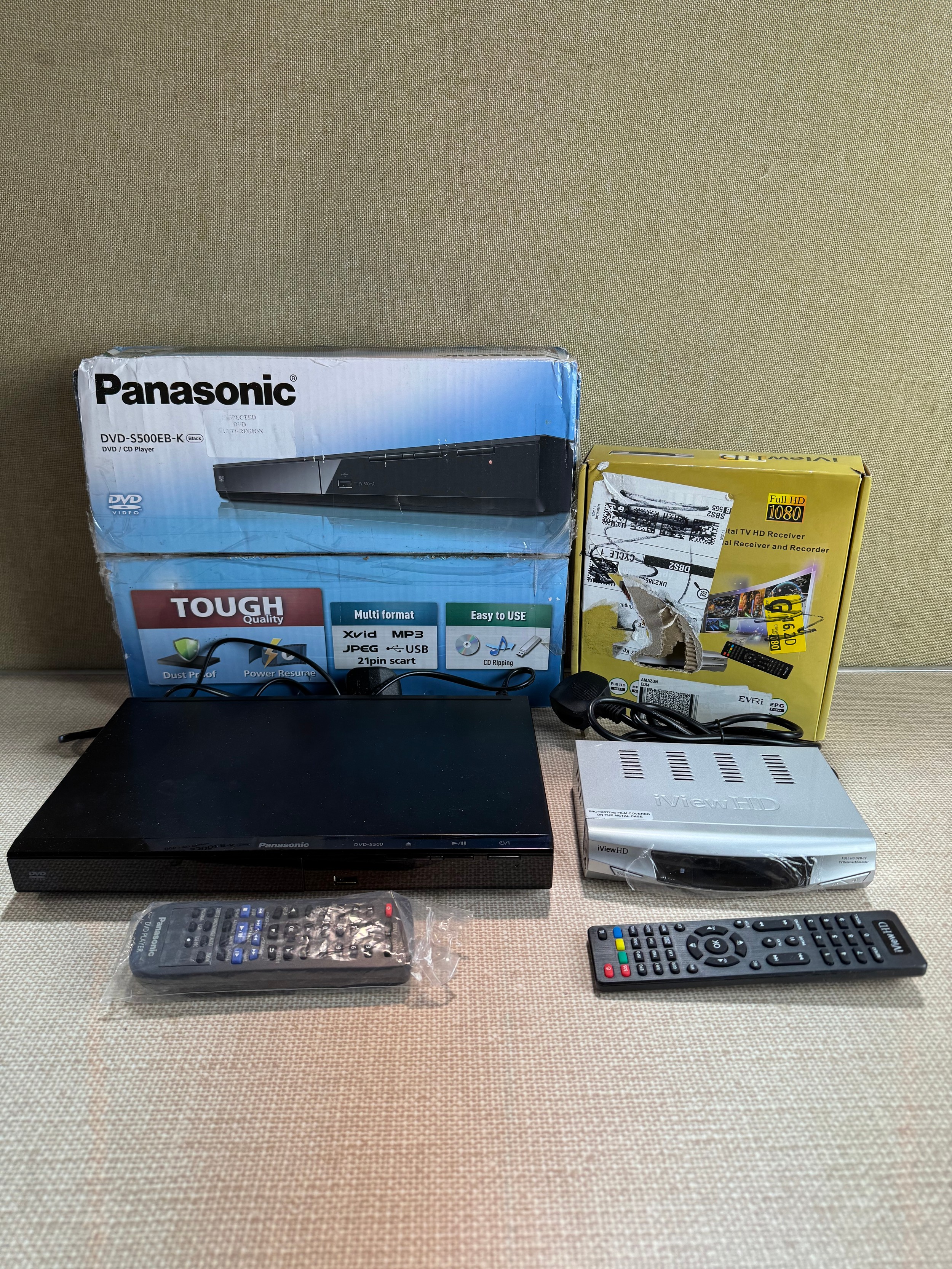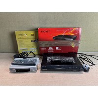 Panasonic DVD/CD player and an iViewHD tv receiver & recorder - both with remotes, Panasonic Blu-ray disc player, model no: DMP-BD84EB-K,2x Sony DVD player with remote and box, model no: dvp-sr760h and Sony DVD player and an iViewHD tv receiver & recorder - both with remotes *This lot is subject to VAT