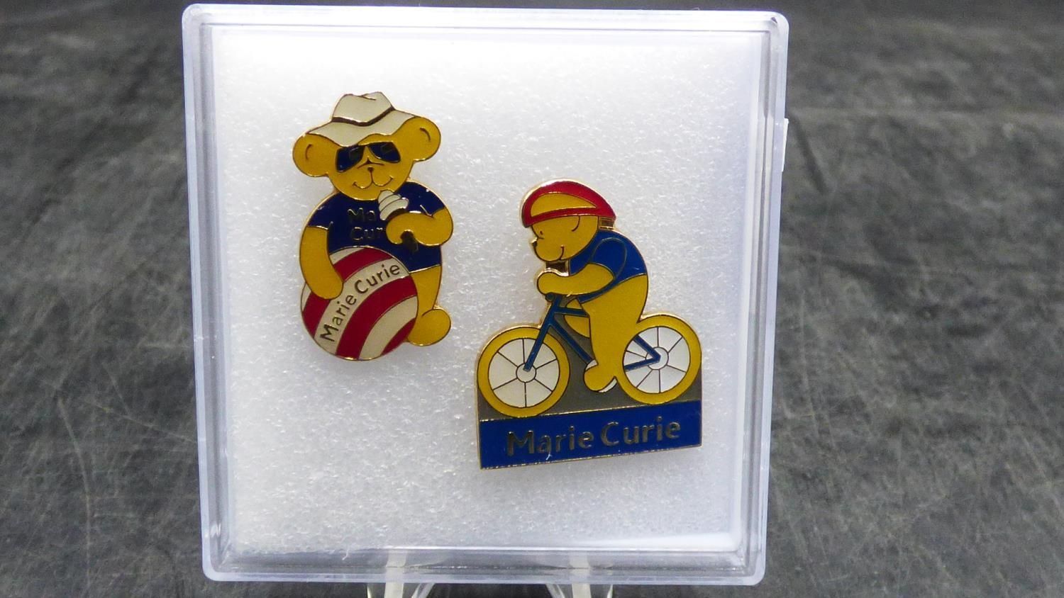 Two Collectable Marie Curie Pin Badges in Presentation Box