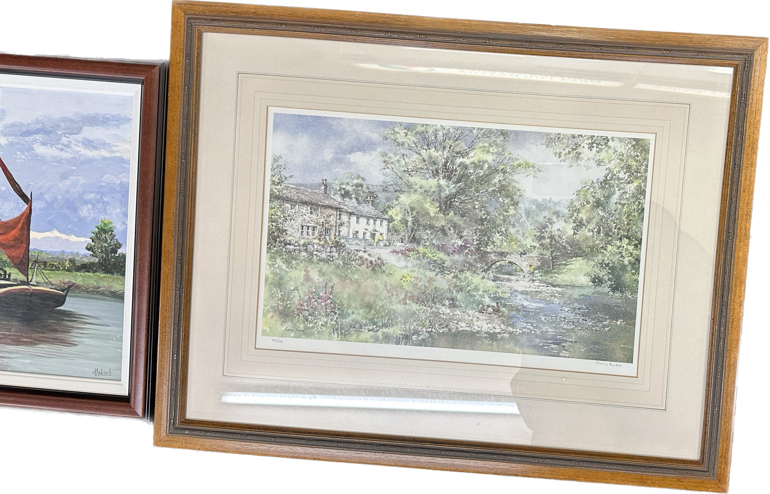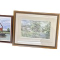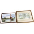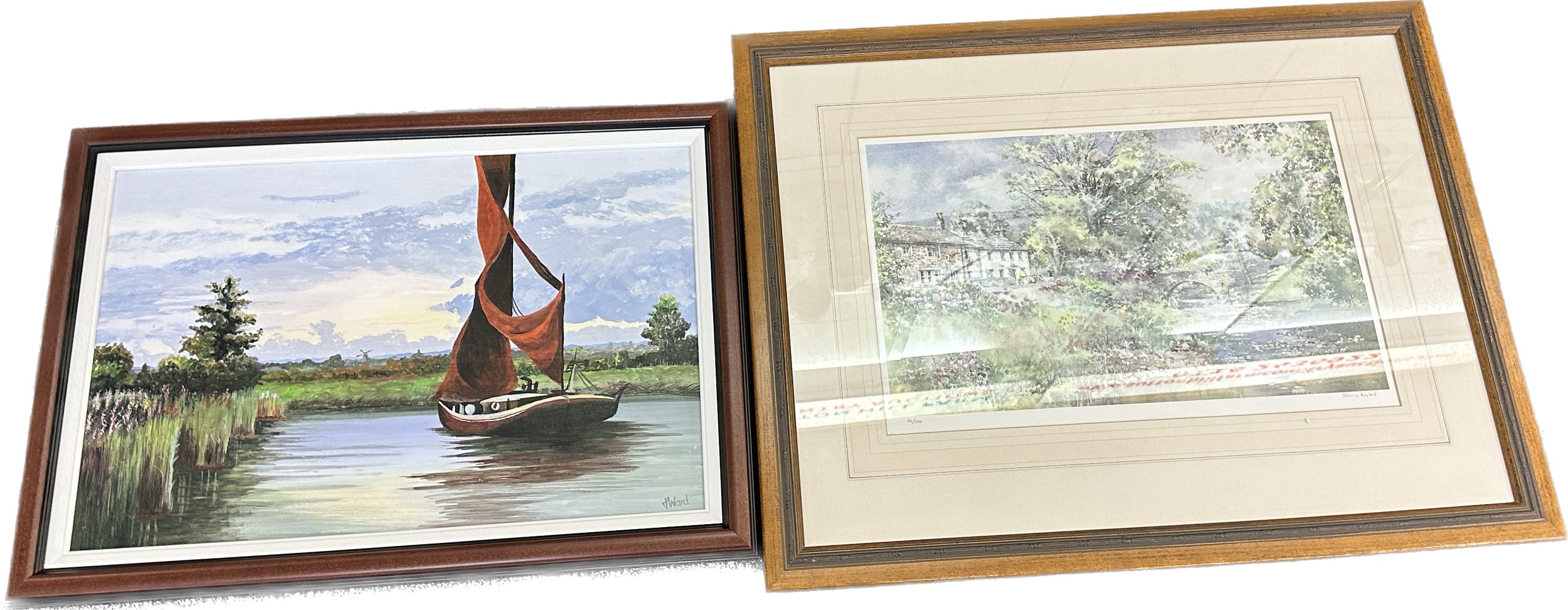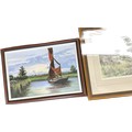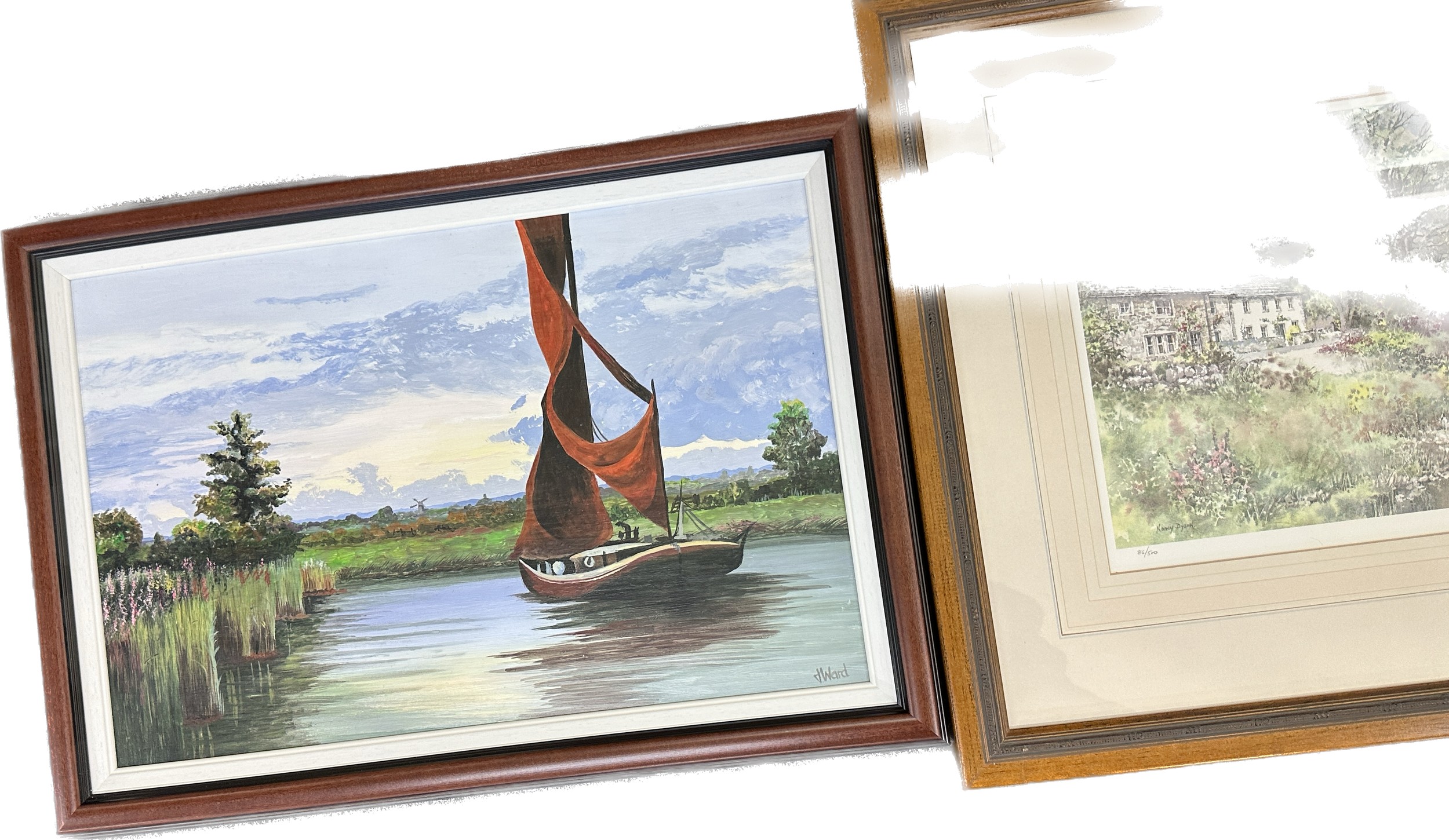 Framed original Jackie Ward painting depicting a boat and a framed print largest measures approx 28 inches wide x 21 tall