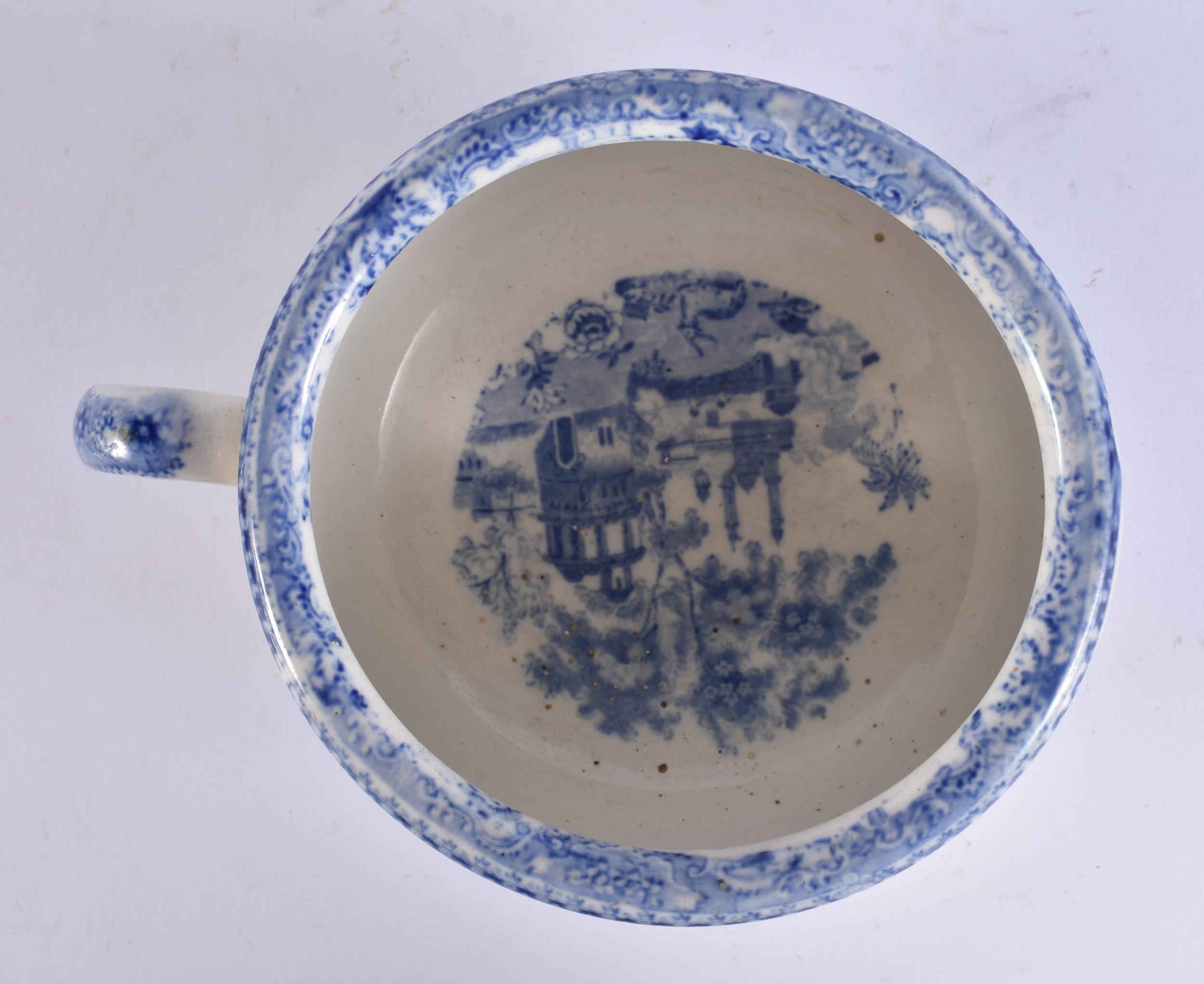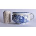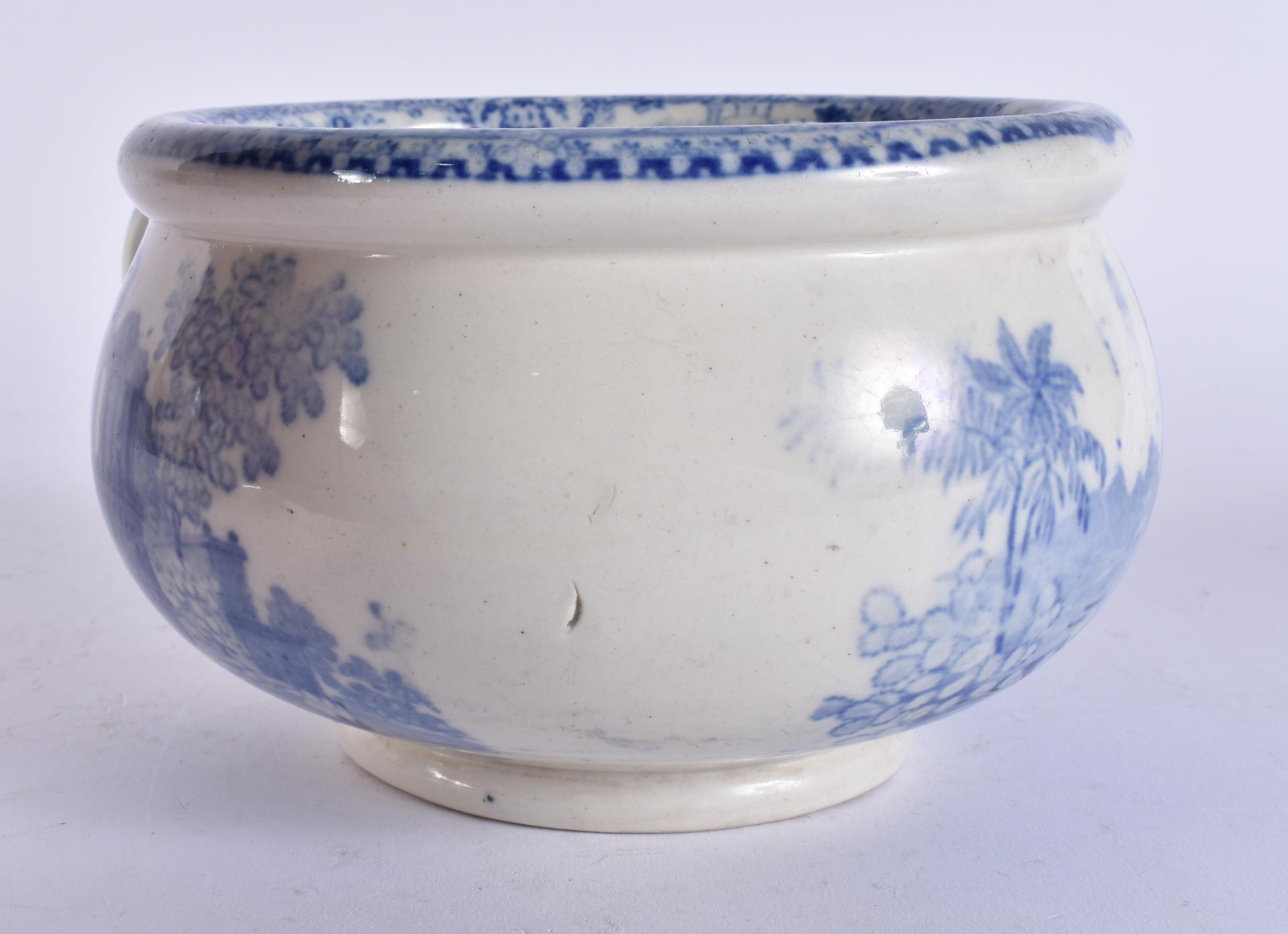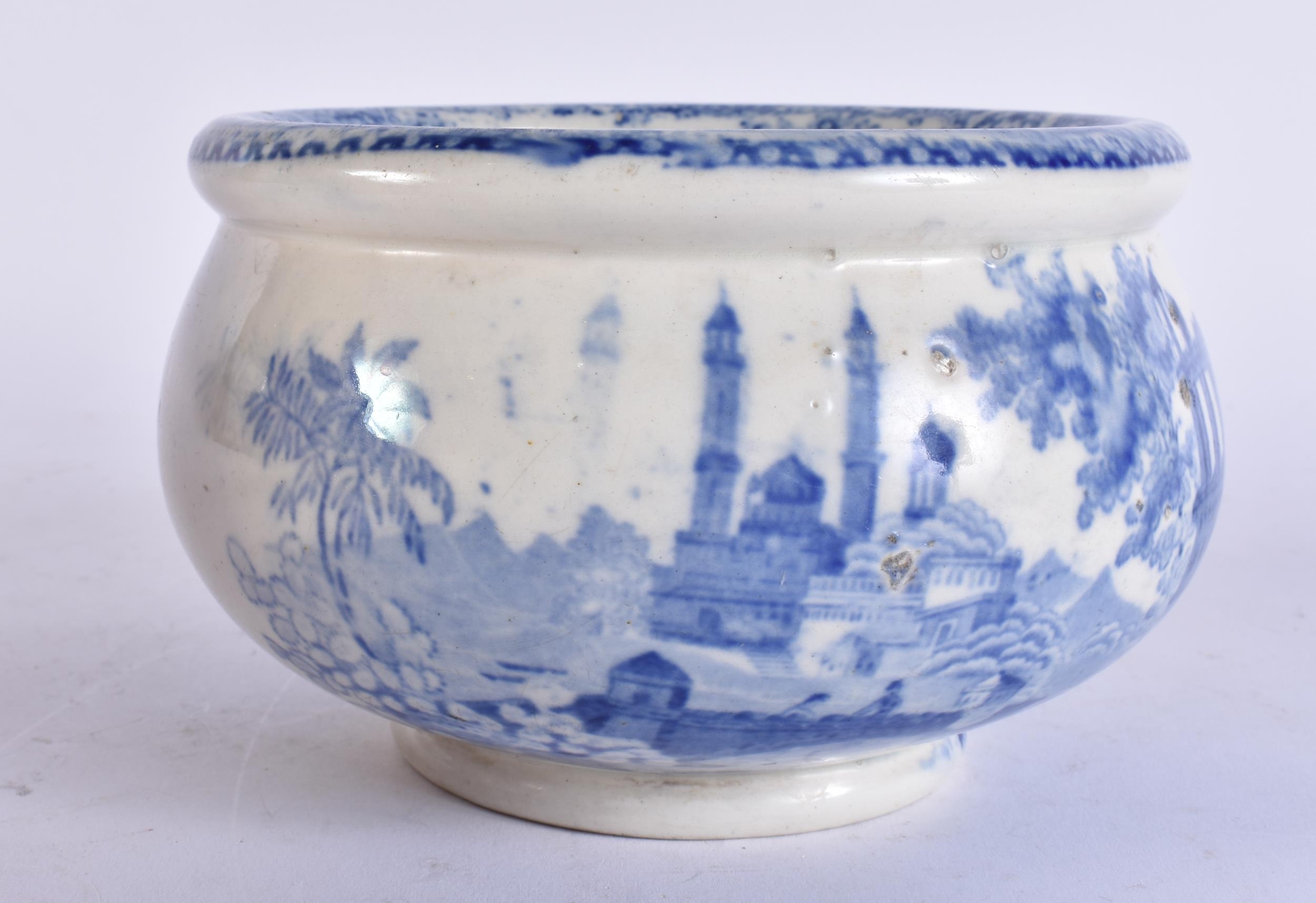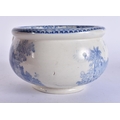 AN UNUSUAL 19TH CENTURY ENGLISH BLUE AND WHITE POTTERY VOMIT POT SPITTOON. 19 cm wide.