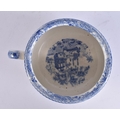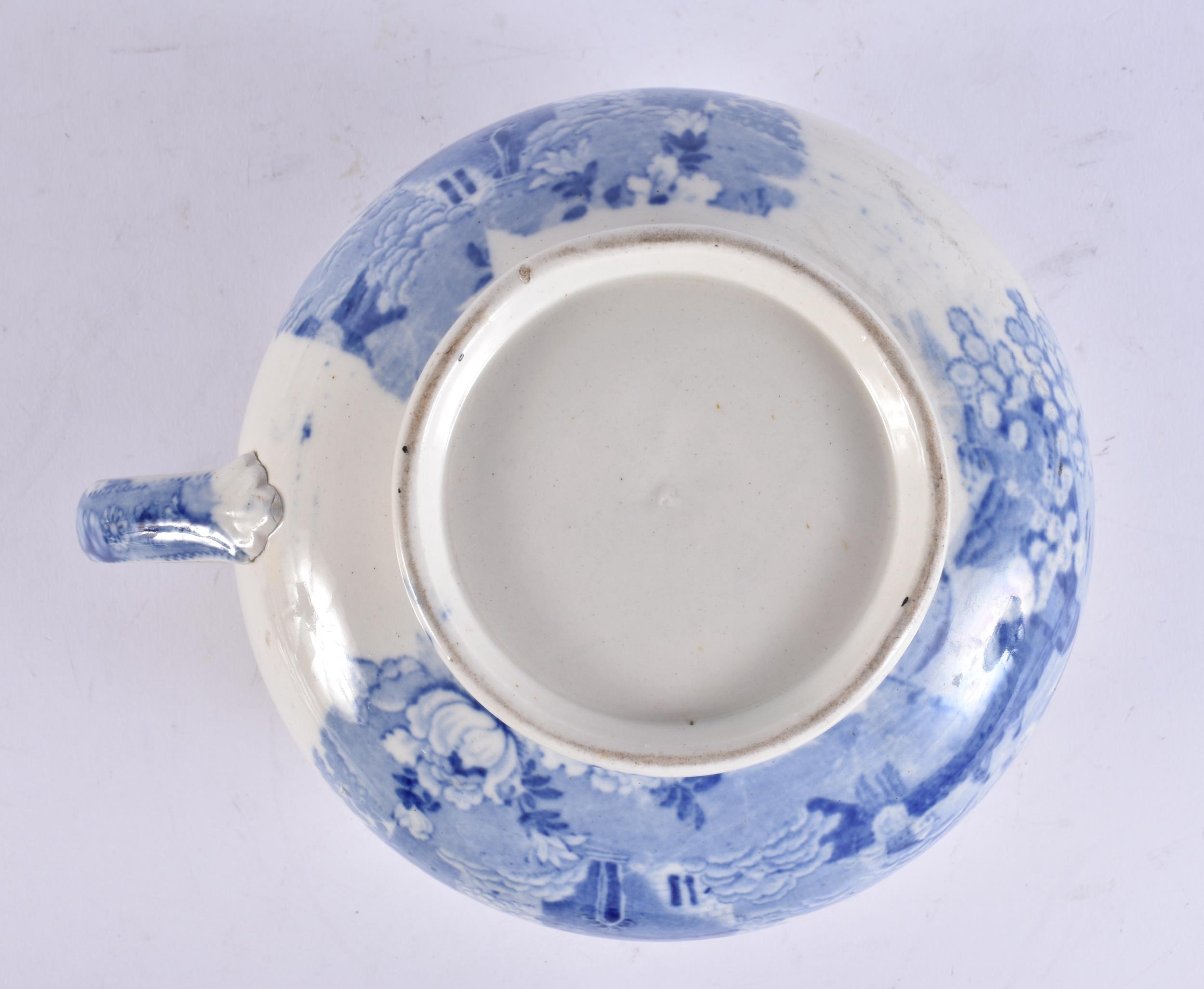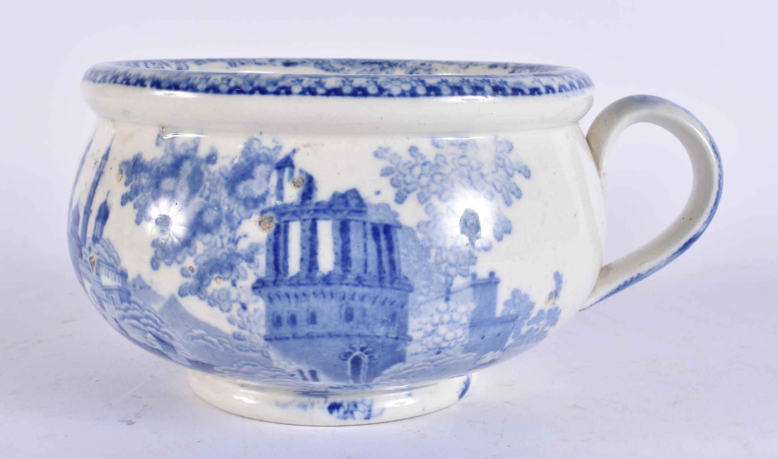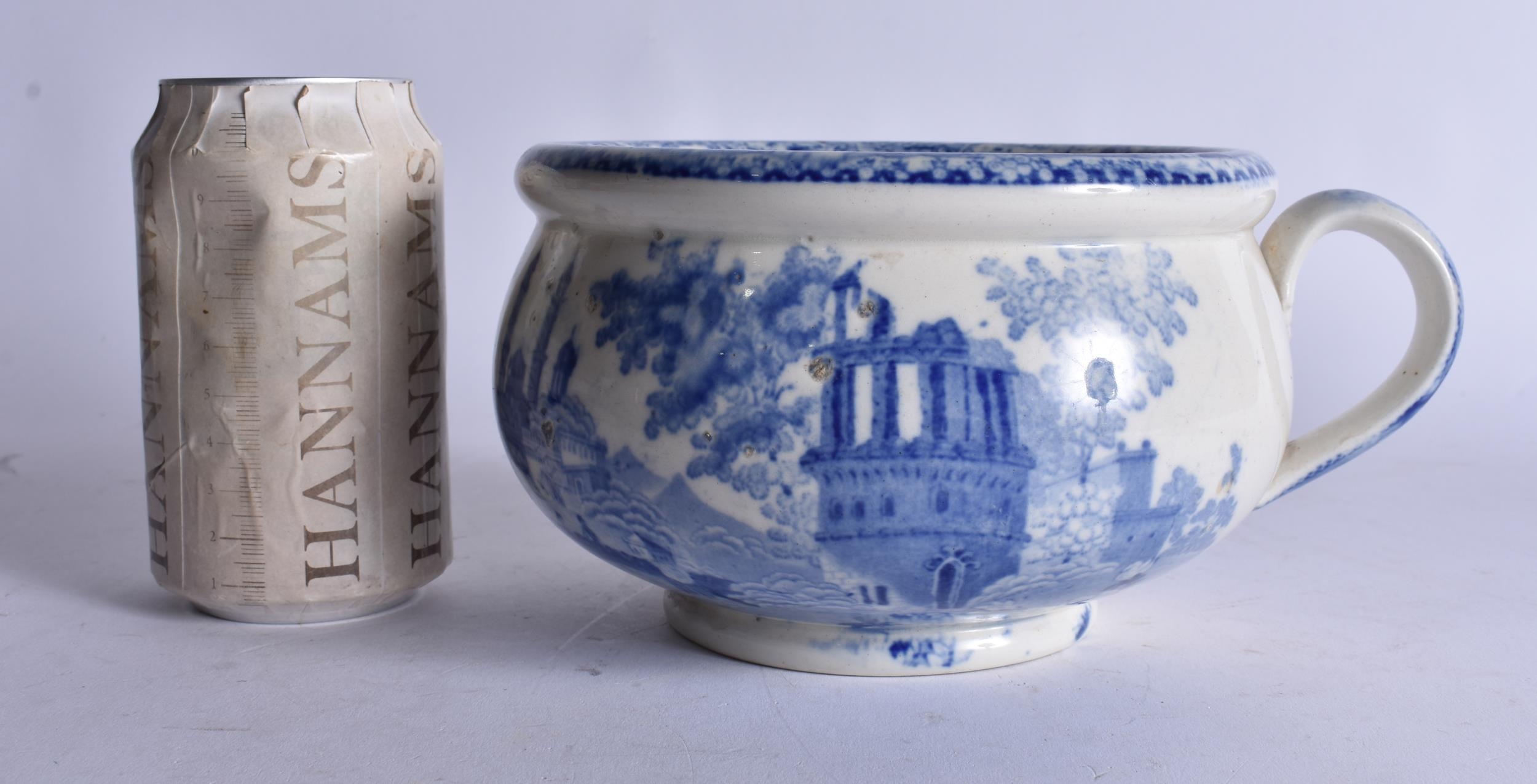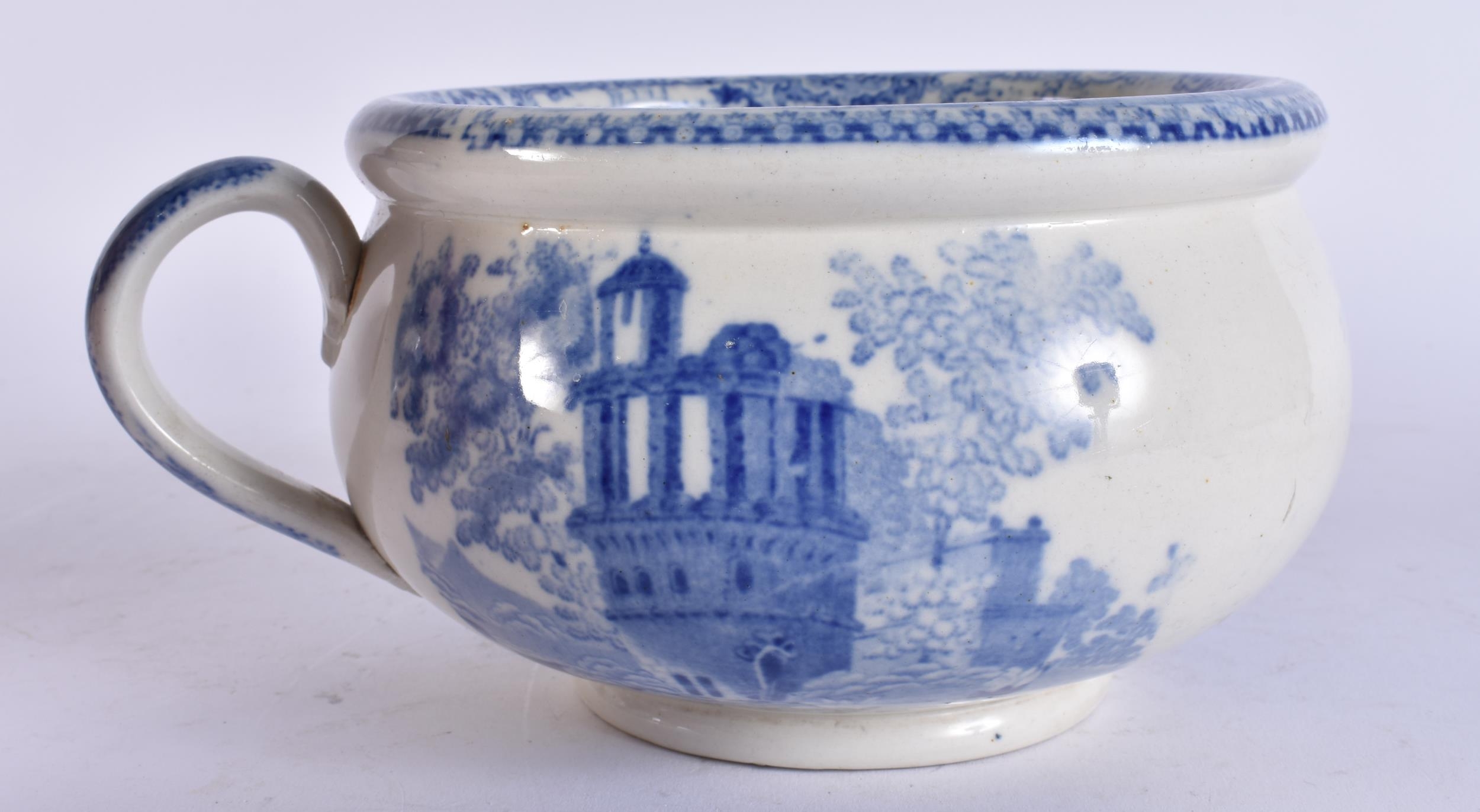 AN UNUSUAL 19TH CENTURY ENGLISH BLUE AND WHITE POTTERY VOMIT POT SPITTOON. 19 cm wide.