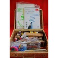 A picnic basket full of artist's oil painting supplies including paints, brushes etc
