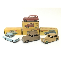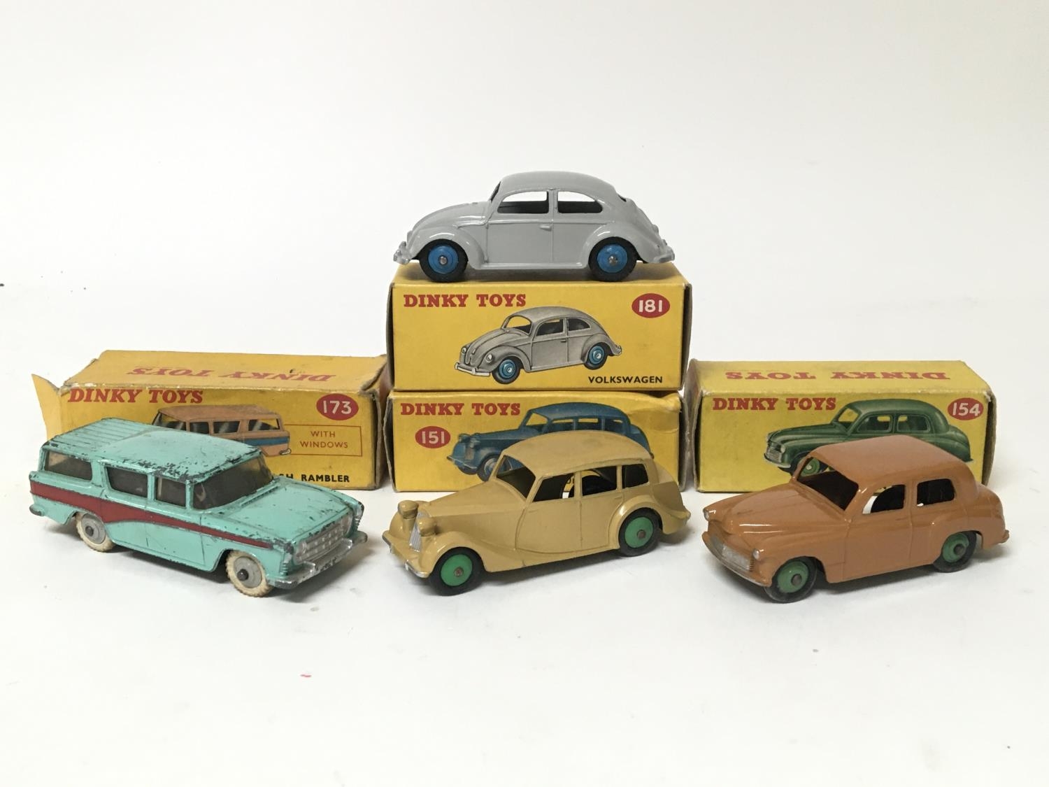 Dinky toys, #173 Nash Rambler, #151 Triumph 1800 saloon, #154 Hillman Minx saloon and #181 Volkswagen, boxed