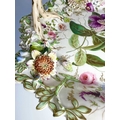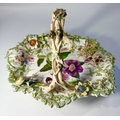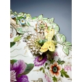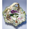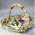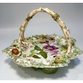 An early 19th century porcelain basket, relief moulded with leaves and branches, overpainted and gilt heightened with flowers and central floral panel, the handle formed as branches, encrusted with flowers and an insect, on a similarly moulded foot, possibly Rockingham or Coalport, with the pattern number '2-7409', height approx 19cm (1)