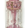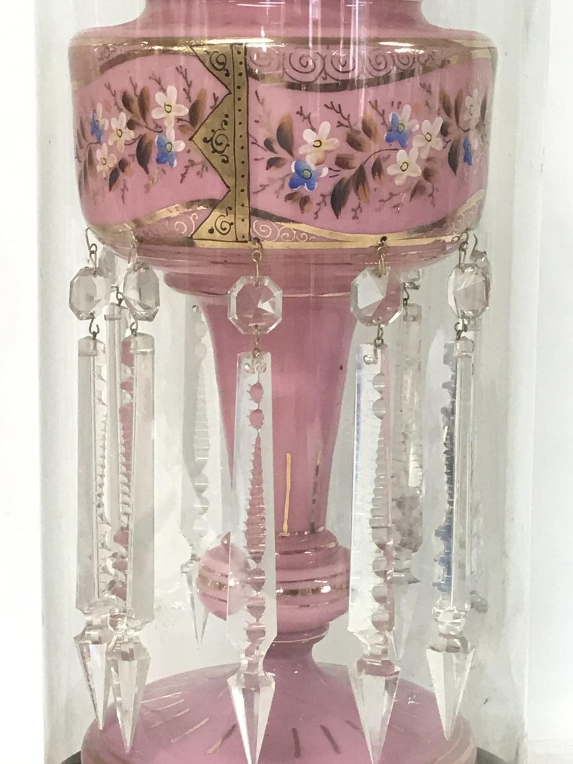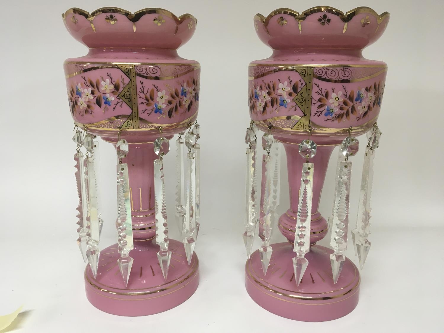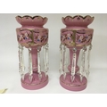 A pair of Victorian pink lustres hand painted and with applied gilt and cut glass drops, accommodated in glass domes. No obvious damaged. Height 38cm.