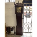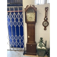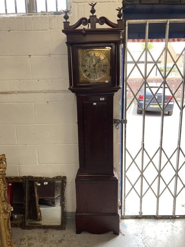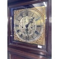 Clocks: Mid 18th cent. Longcase Thomas Hall Romsey Hampshire, brass silvered dial 10ins face, Roman numerals, 8 day with calendar movement, mahogany cased.