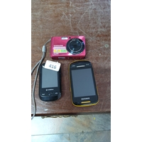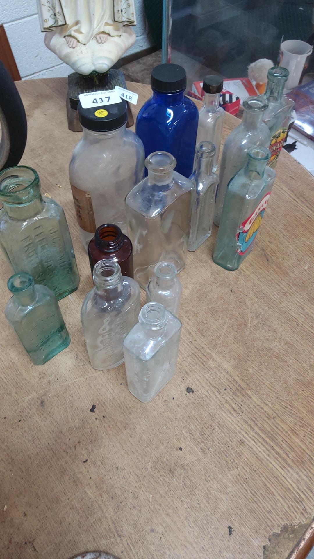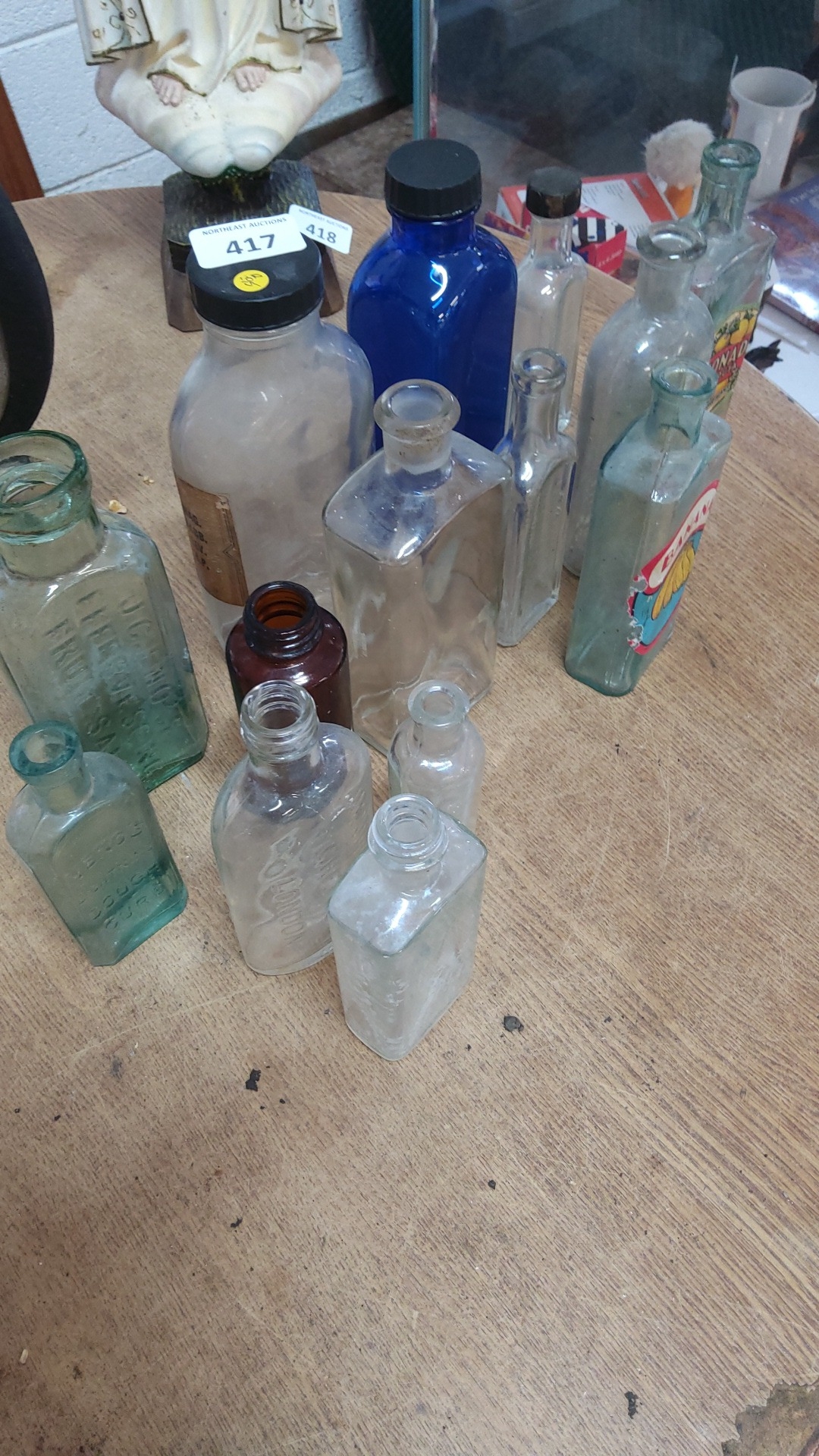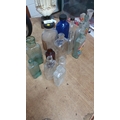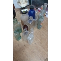 A group of vintage glass bottles, comprising clear, aqua, and cobalt examples in square, cylindrical, and flask forms; some moulded and one retaining a paper label, with assorted screw and stoppered necks.
