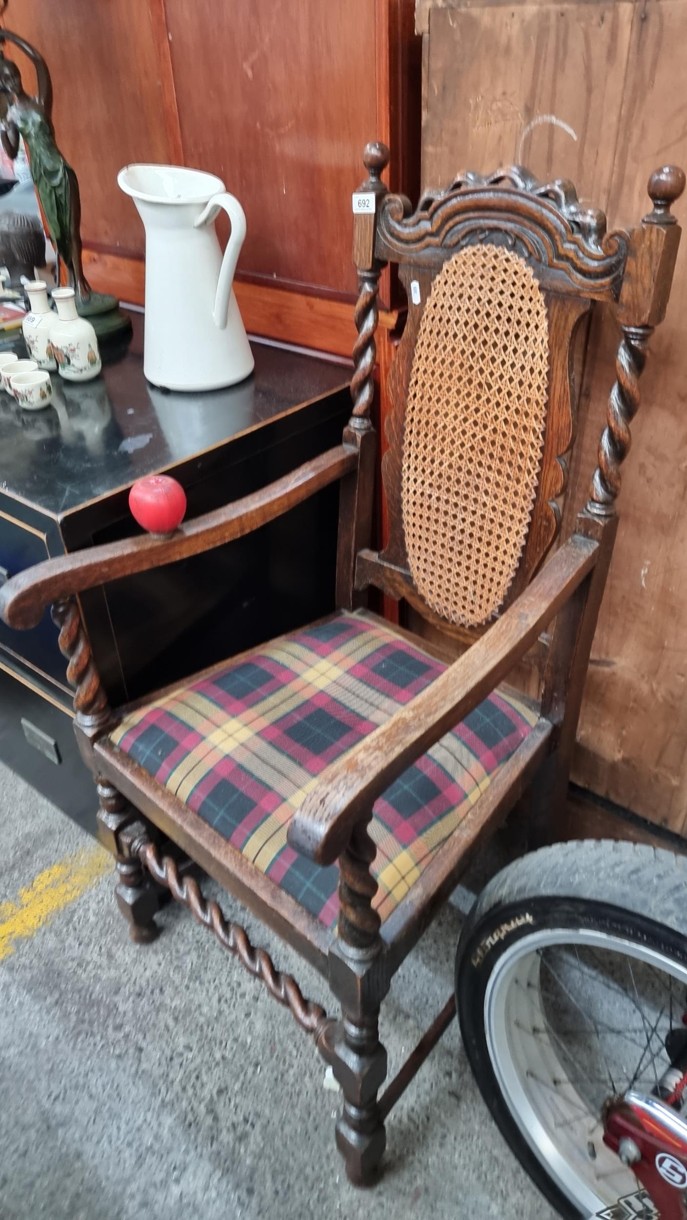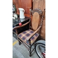 A handsome carved oak barley twist carver chair, with rattan back and upholstered in a tartan fabric design. H11cm x W54cm.