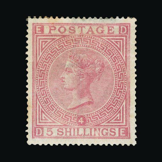 Great Britain - QV (surface printed) : (SG 134) 1867-83 wmk Anchor 5s rose, DE, thinned at top, gum toning, m.m. RARE. Cat £28000 (image available) [US1]