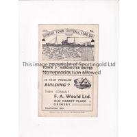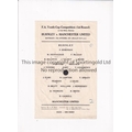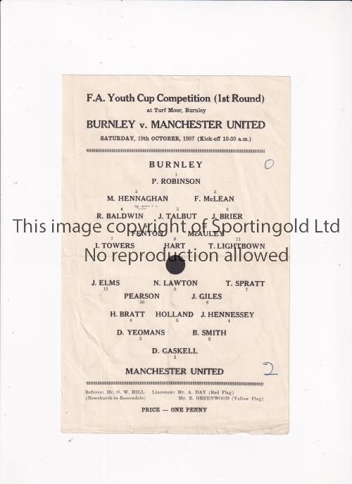 MANCHESTER UNITED Single sheet programme for the away F.A. Youth Cup tie v Burnley 19/10/1957, slightly creased and scores entered. Generally good