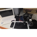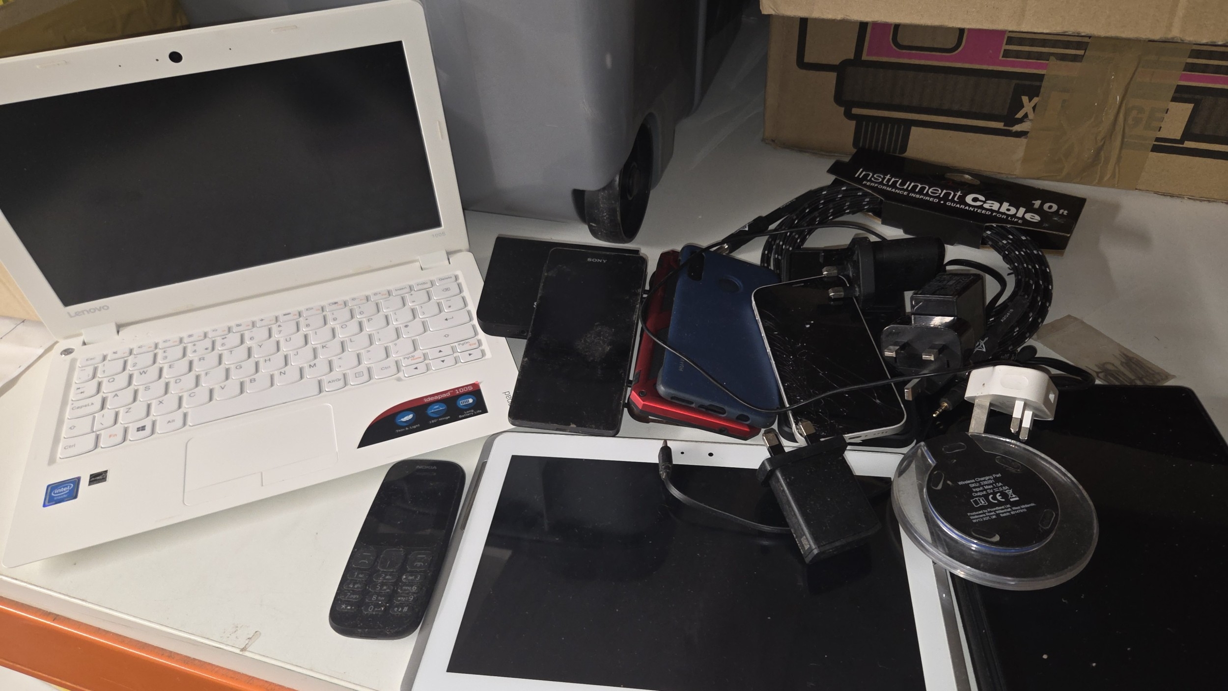 A collection of electronics including Lenovo laptop and smartphones