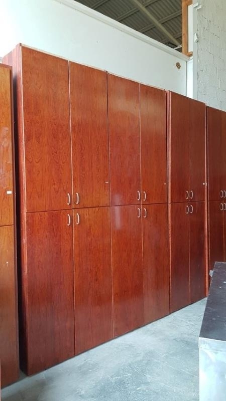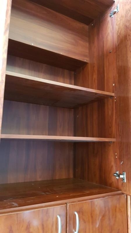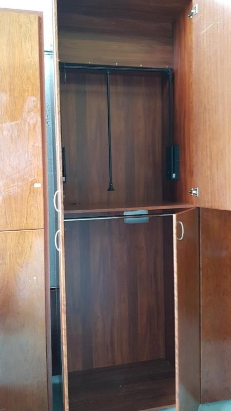 3 x Double Wardrobes, with Dark Wood Fronts, Mixture of Shelving and Hanging with Pull Down Rails (Approx 280cm x 60cm x 280cm) (Wall to Left and End Panel to Right)