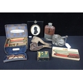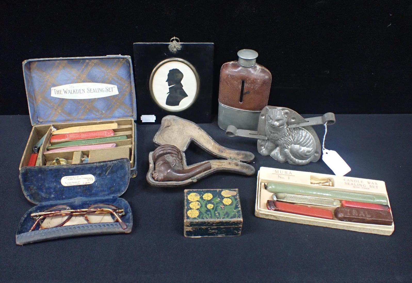 A TINPLATE CAT CONFECTIONARY MOULD 9.5cm high, a framed Silhouette, a pipe carved as an African, and other small collectibles