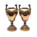A pair of late 19th Century French brass garniture vases of swollen ovoid form, each with twin acanthus scroll handles and with a copper relief roundel to each side depicting hunting scenes, above stepped circular bases, height 39cm. (2)