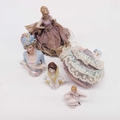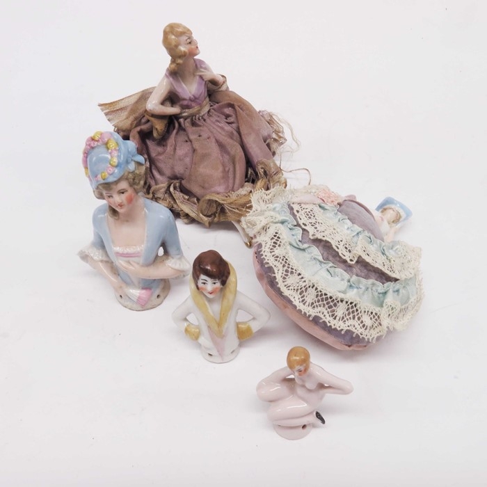 Five porcelain pin cushion dolls, one seated with outstretched legs, in purple satin gown, a miniature figure of a kneeling nude, and three others. (5)