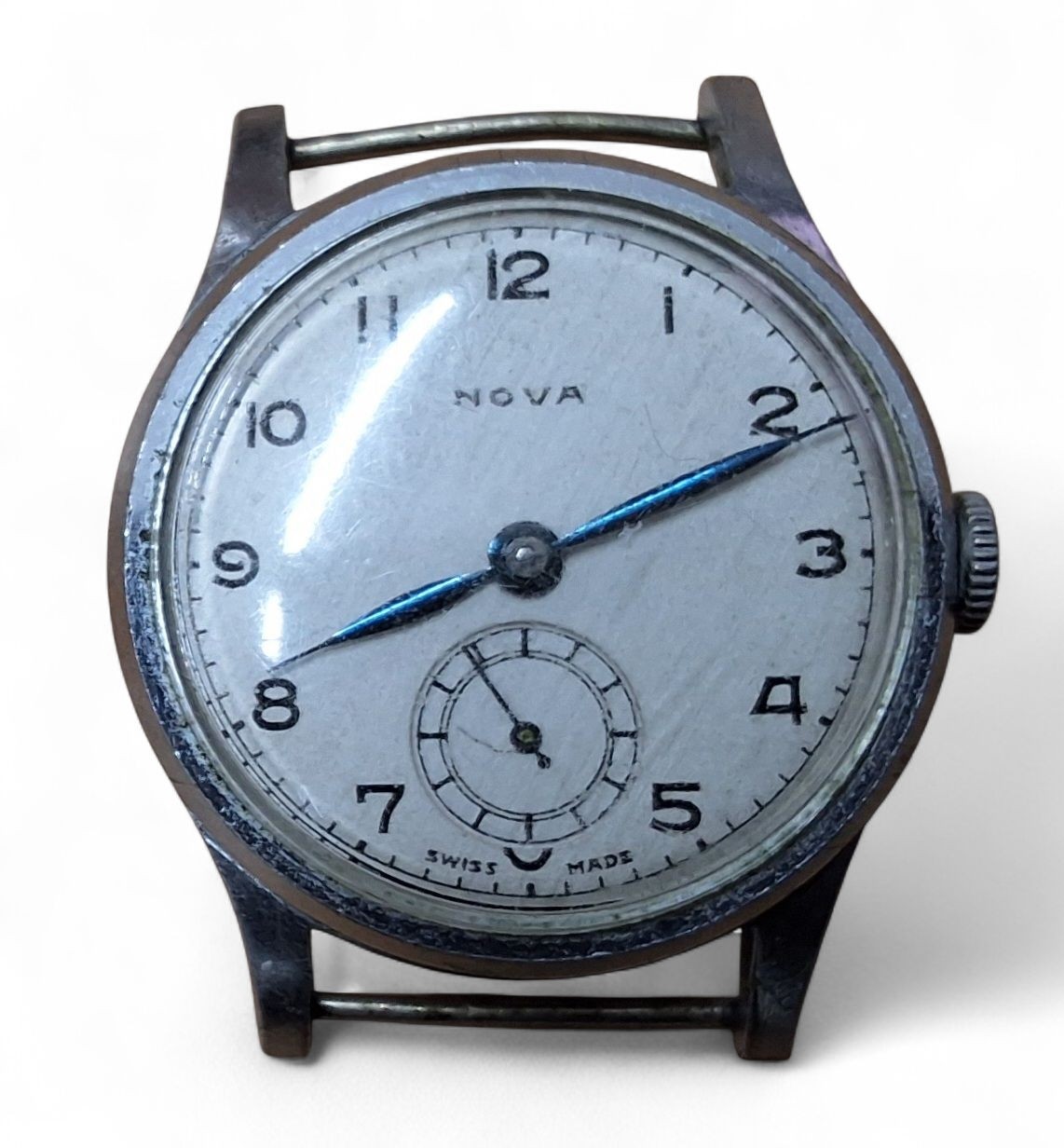 A 1940/50s military style watch, Swiss manual movement, cream dial, signed NOVA, Arabic numerals, out minute track, subsidiary second dial, blued hands, fixed bar/lugs, 31mm dia., w/o