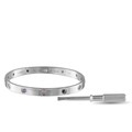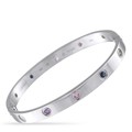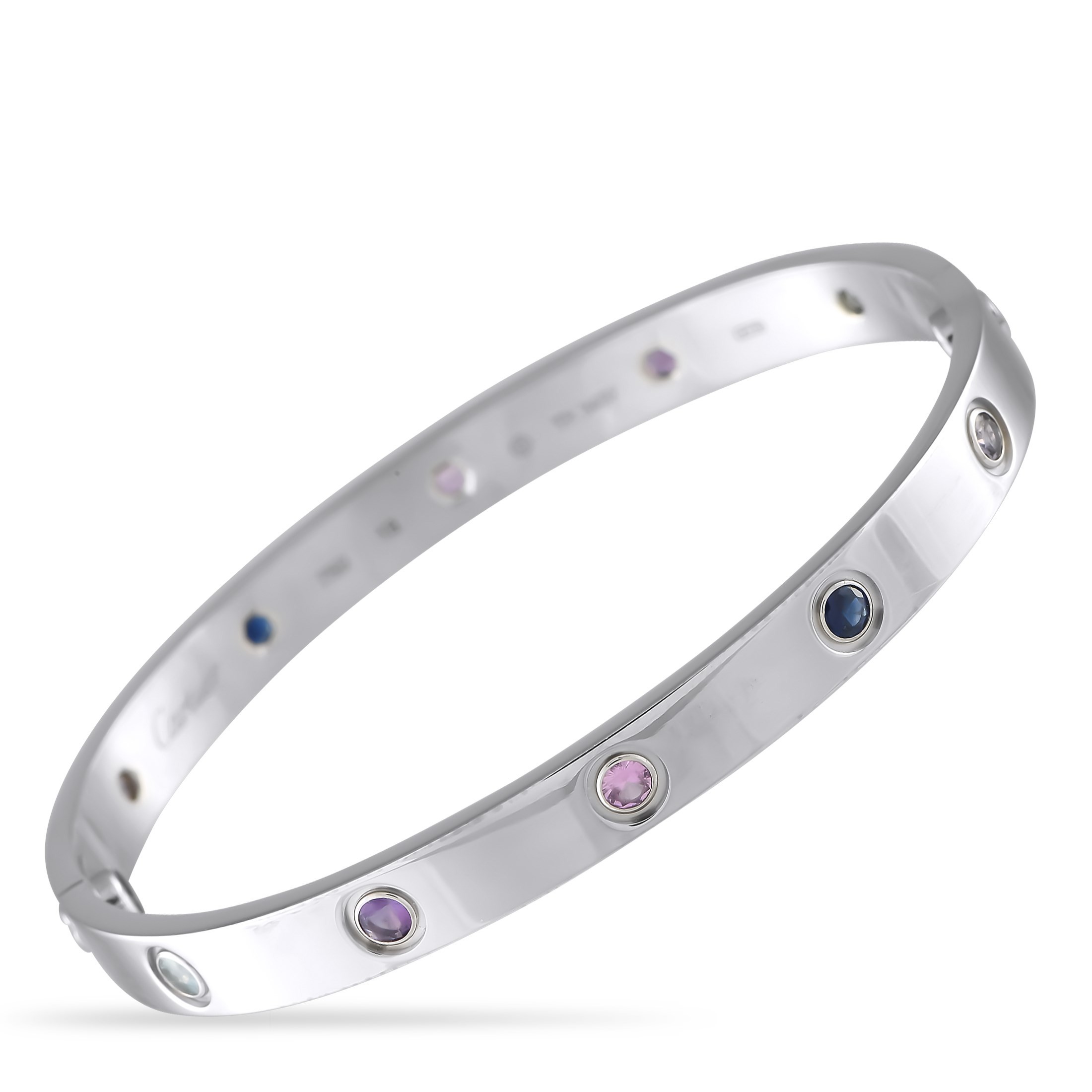A Cartier LOVE bangle 18K White Gold Multicolored Sapphire Bracelet. Dazzling multicolored Sapphire gemstones add a surprising pop of color to this classic Cartier bangle. it measures 7 long and features classic screw closure. In excellent condition and includes a gift box. Total weight: 34.7 grams.*This item is held at Cadmore USA Office in Pennsylvania, USA and will be shipped from there*