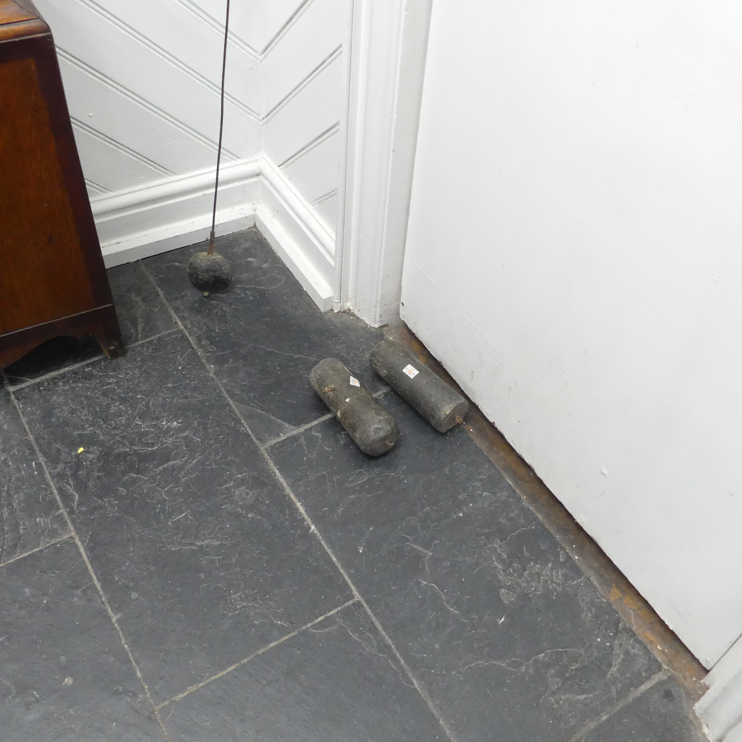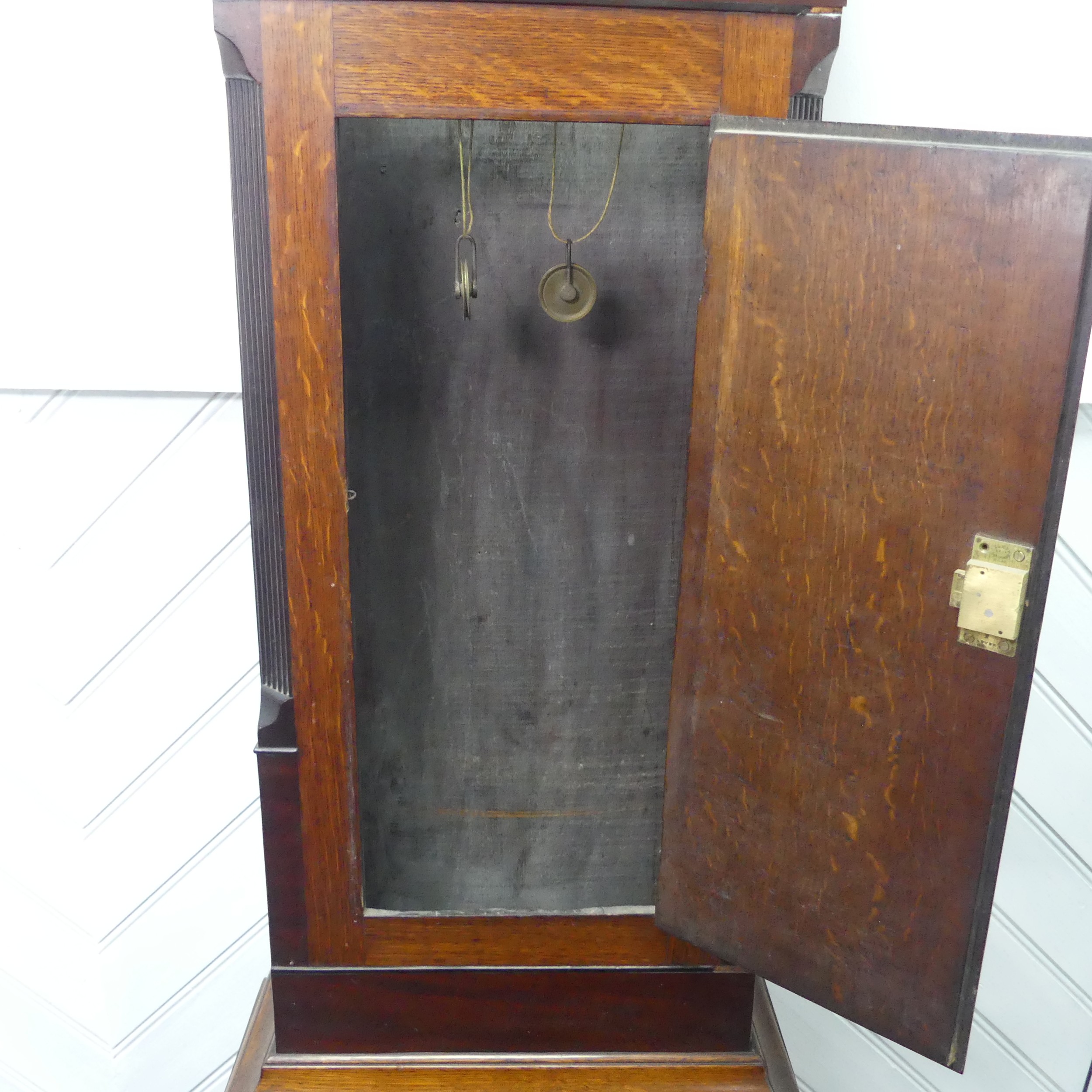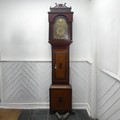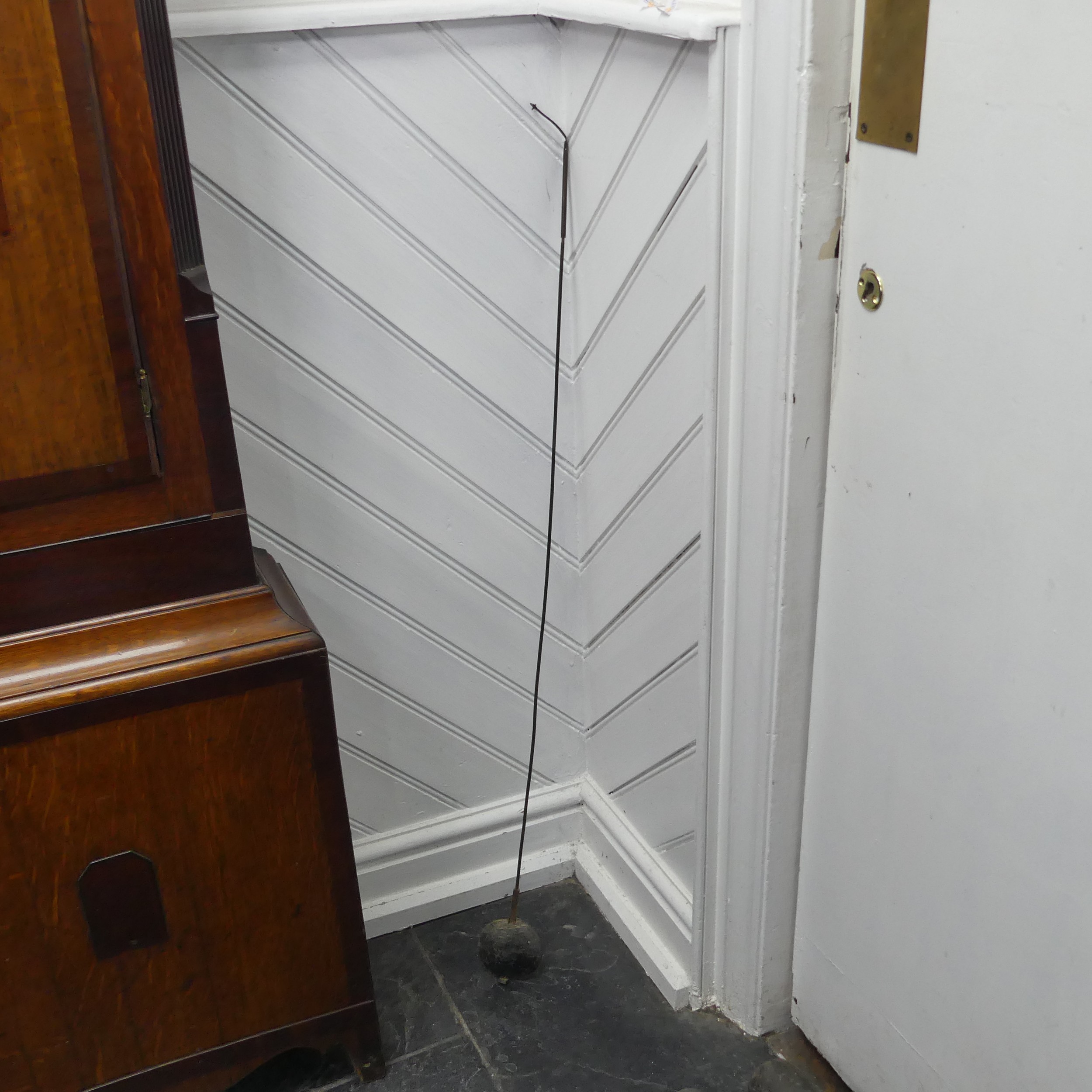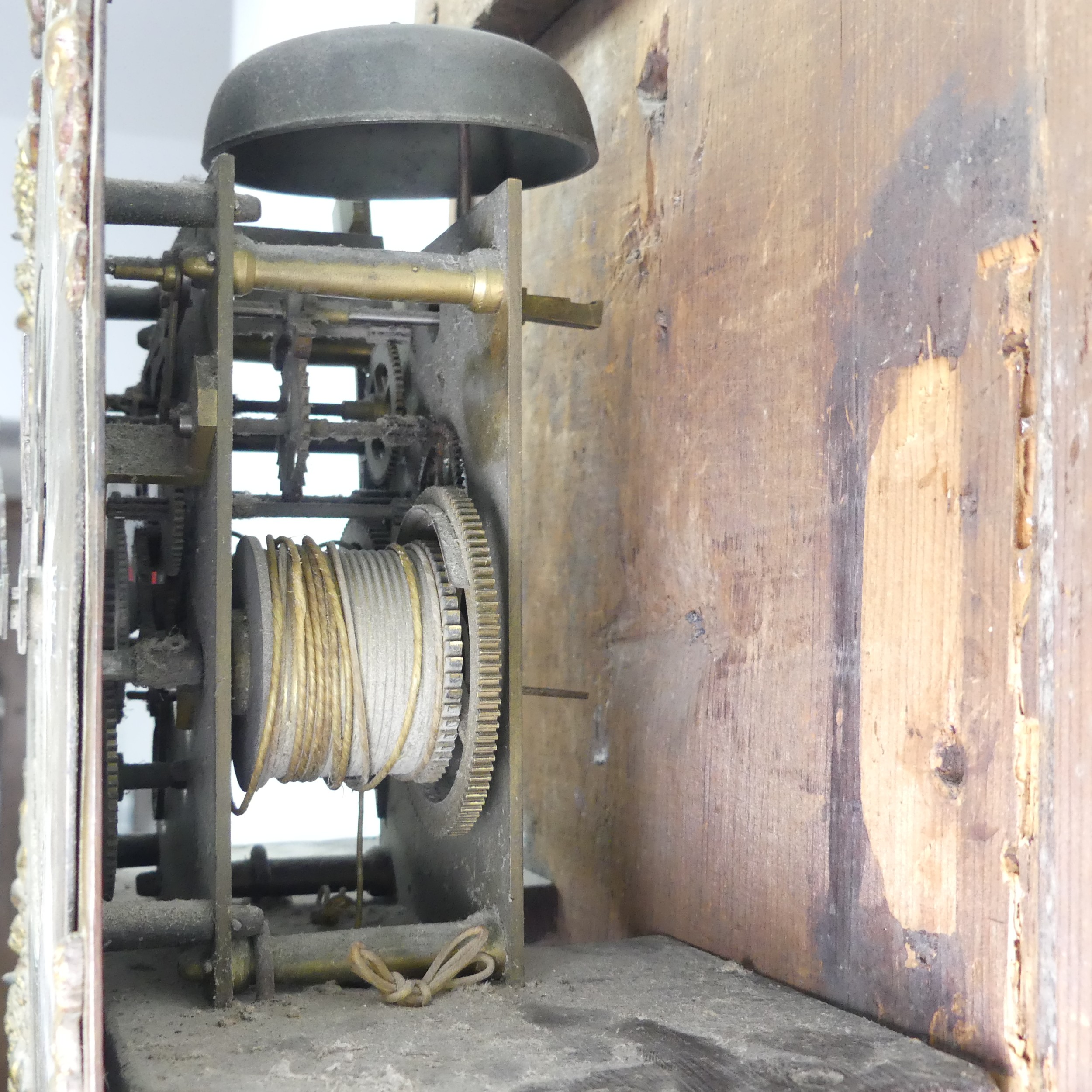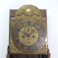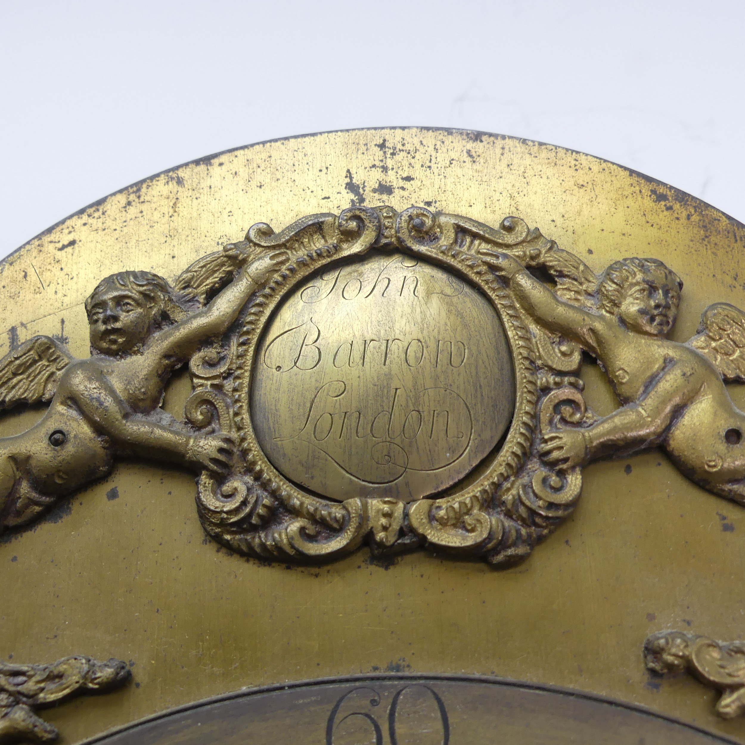 A late 17th/early 18th century eight-day Longcase Clock, by John Barrow of London, the 12 inch arched brass dial applied with Roman numeral hours and Arabic minutes, the centre with subsidiary seconds and date apertures, decorated with 'Twin cherubs with maces' (1695-1730) gilt spandrels, the arched pediment housing signature in gilt frame supported by two cherubs, housed in a later mahogany and oak case, the hood decorated with fretwork and pierced scrolls, raised on a shaped apron base, complete with associated pendulum and weights, H 228 cm.