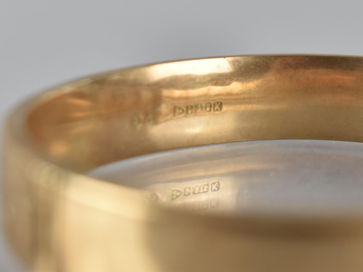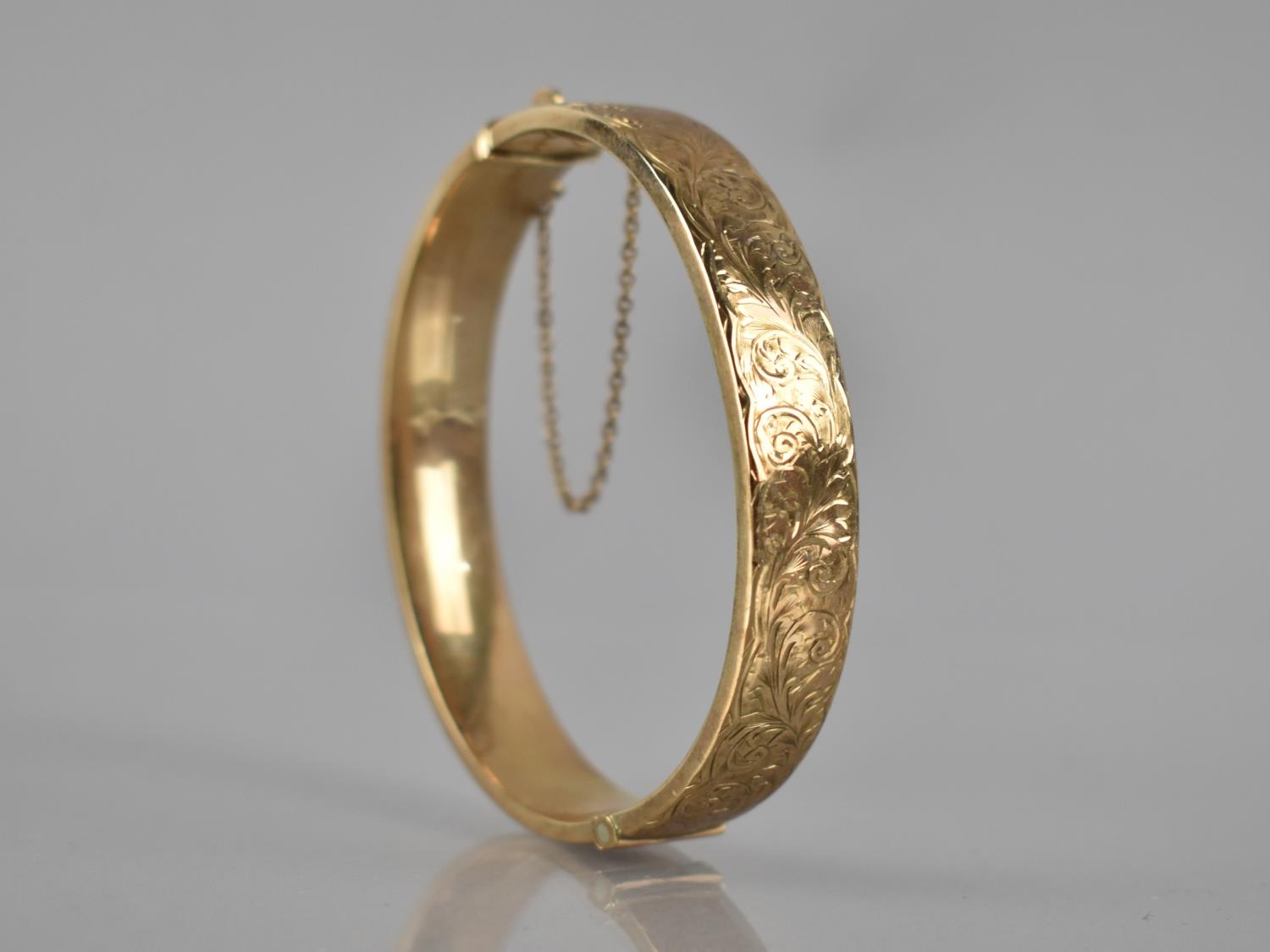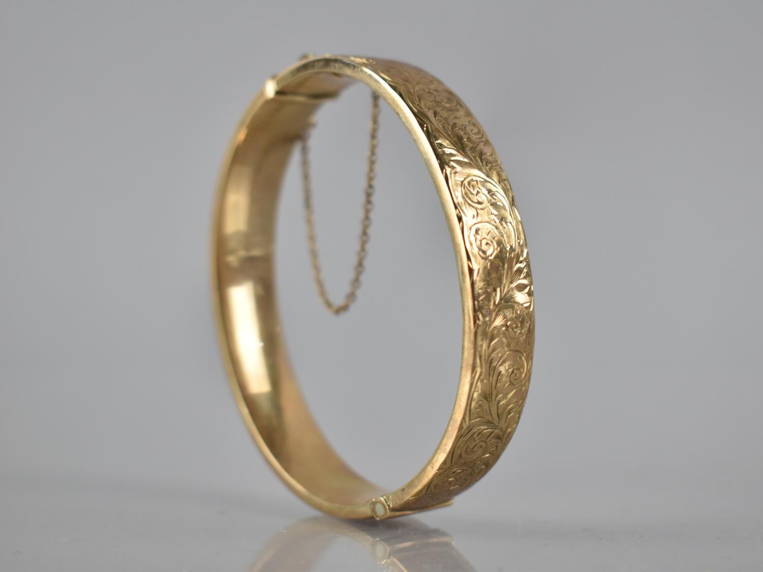 A Vintage 9ct Gold Hinged Bangle, Engraved Scrolling Foliate Decoration to Front Panel, 13.7gms, Internal Dimensions 59mm by 52mm, Chester Hallmark 1960 and Makers Mark S and P for Smith and Pepper.