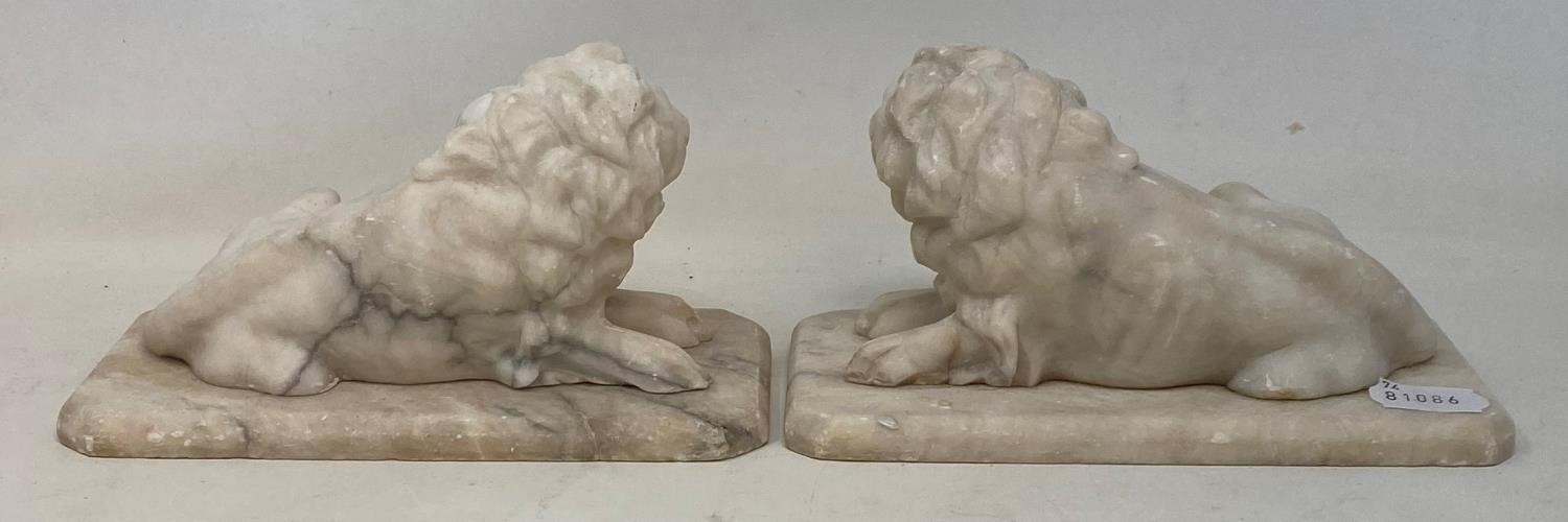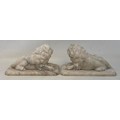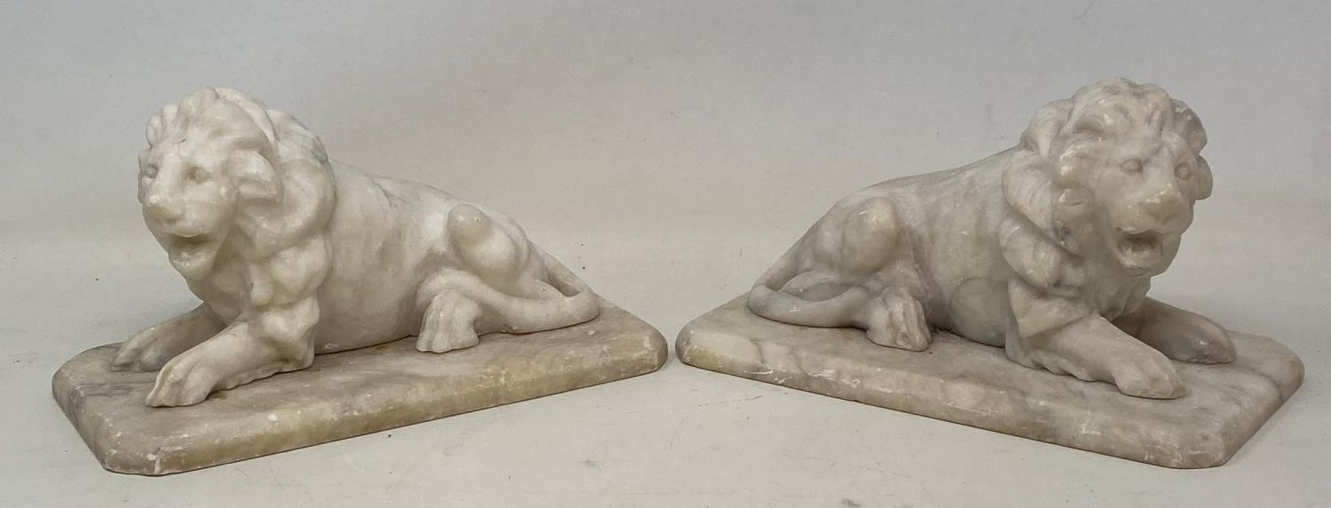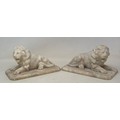 A pair of carved lions, on rectangular bases, 21 cm wide